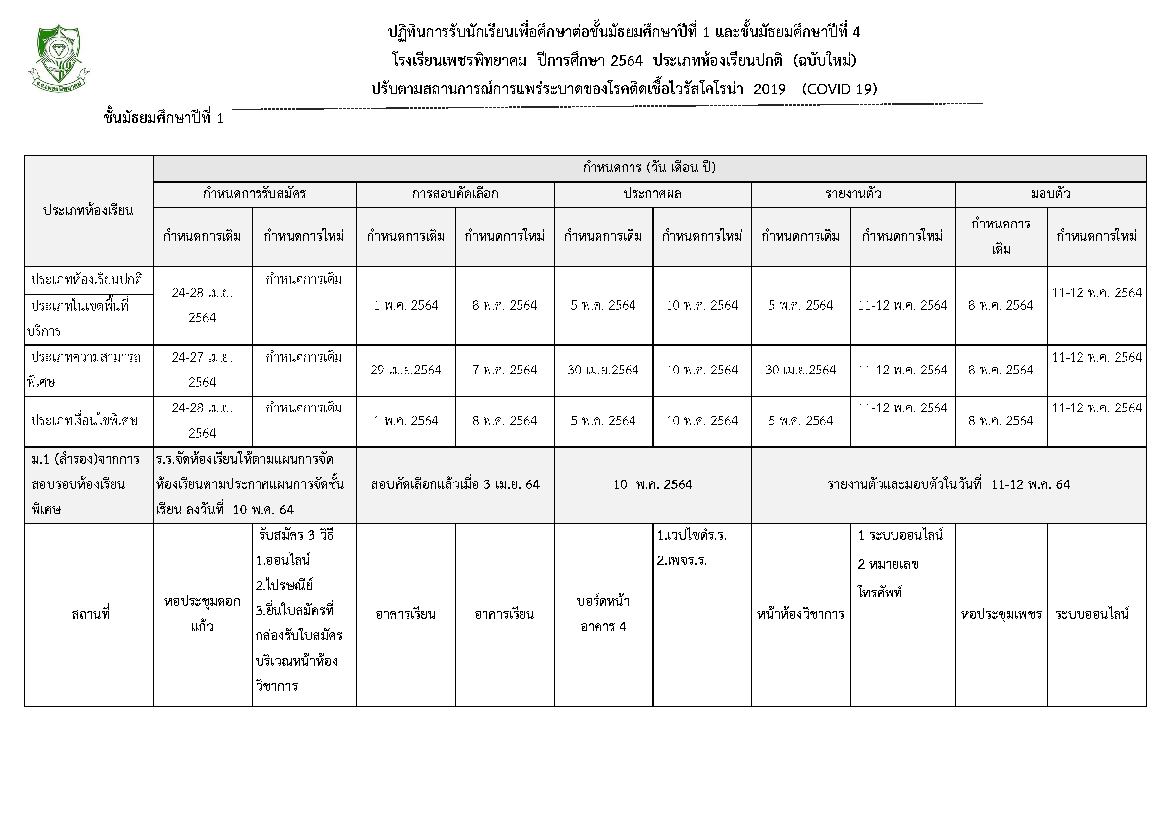ตามหนังสือสำนักงานคณะกรรมการศึกษาขั้นพื้นฐาน ที่ ศธ 14006/ว1284 ลงวันที่ 20 เมษายน 2464 และหนังสือสำนักงานเขตพื้นที่การศึกษามัธยมศึกษาเพชรบูรณ์ ที่ ศธ 14325/1431 ลงวันที่ 20 เมษายน 2564 เรื่อง การดำเนินการรับนักเรียน ปีการศึกษา 2564 ในสถานการณ์การแพร่ระบาดของโรคติดเชื้อไวรัสโคโรนา 2019 (COVID-19) แจ้งว่า สถานการณ์การแพร่ระบาดของโรคติดเชื้อไวรัสโคโรนา 2019 (COVID-19) ยังคงปรากฎอยู่ อันเป็นสถานการณ์ฉุกเฉินที่เป็นภัยคุกคามความปลอดภัยและความสงบเรียบร้อยของประชาชน ความมั่นคงปลอดภัยด้านสาธารณสุขและระบบเศษฐกิจและสังคมของประเทศ และรัฐบาลจึงได้ขยายเวลาการใช้บังคับประกาศสถานการณ์ฉุกเฉินในทุกเขตท้องที่ทั่วราชอาณาจักรออกไปอีกคราวหนึ่งตั้งแต่วันที่ 1 เมษายน 2564จนถึงวันที่ 31 พฤษภาคม 2564 และข้อกำหนดออกตามความในมาตรา 9 แห่งพระราชกำหนดการบริหารราชการในสถานการณ์ฉุกเฉิน พ.ศ.2548 ฉบับที่ 16 ประกาศเมื่อวันที่ 3 มกราคม 2564 และฉบับที่ 20 ประกาศ ณ วันที่ 16 เมษายน 2564 ซึ่งมีผลต่อกระบวนการการคัดเลือกหรือสอบคัดเลือก การจับฉลาก การประกาศผล การร้ายงานตัว ที่ได้กำหนดวันไว้เดิมตามปฏิทินการรับนักเรียน ปีการศึกษา 2564 สังกัดสำนักงานคณะกรรมการการศึกษาขั้นพื้นฐาน ที่ยังไม่สามารถดำเนินการให้แล้วเสร็จได้ สำนักงานคณะกรรมการการศึกษาขั้นพื้นฐานได้พิจารณาแล้ว จึงให้โรงเรียนในสังกัดเลื่อนการสอบคัดเลือกการจับฉลาก การประกาศผล การรายงานตัว และการมอบตัวที่ได้กำหนดไว้ตามปฏิทินการรับนักเรียน ปีการศึกษา2564 (ฉบับเดิม) และให้ดำเนินการรับนักเรียนเป็นไปตามปฏิทินการรับนักเรียน ปีการศึกษา 2564 (ฉบับใหม่) ปรับตามสถานการณ์การแพร่ระบาดของโรคติดเชื้อไวรัสโคโรนา 2019 (COVID-19)