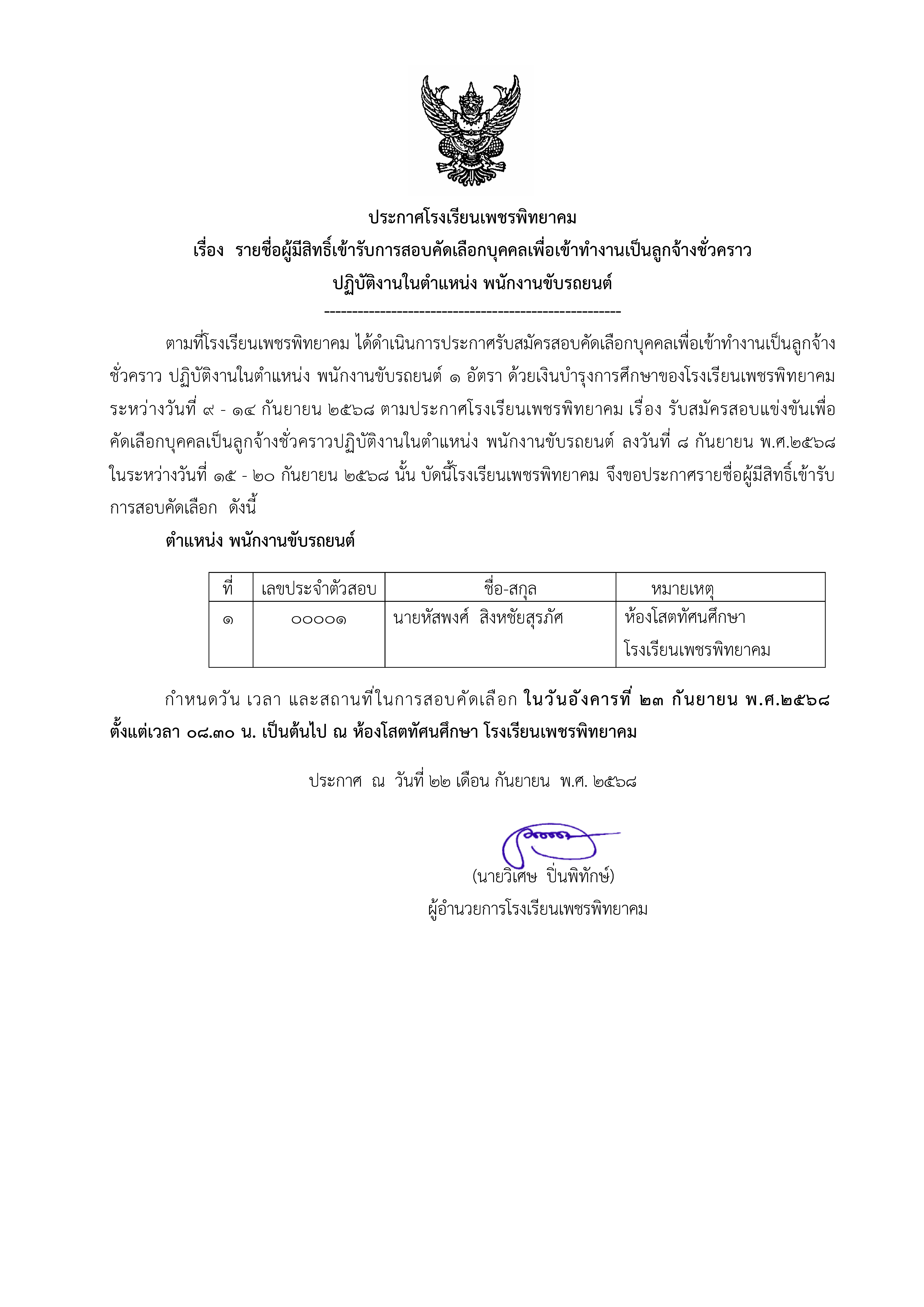 โรงเรียนเพชรพิทยาคม ออกประกาศ เรื่อง รายชื่อผู้มีสิทธิ์เข้ารับการสอบคัดเลือกบุคคลเพื่อเข้าทำงานเป็นลูกจ้างชั่วคราว ปฏิบัติงานในตำแหน่งพนักงานขับรถยนต์ ภายหลังจากเปิดรับสมัครสอบคัดเลือกจำนวน 1 อัตรา ด้วยเงินบำรุงการศึกษาของโรงเรียน ระหว่างวันที่ 9 – 14 กันยายน 2568 ตามประกาศโรงเรียนเพชรพิทยาคม ลงวันที่ 8 กันยายน 2568