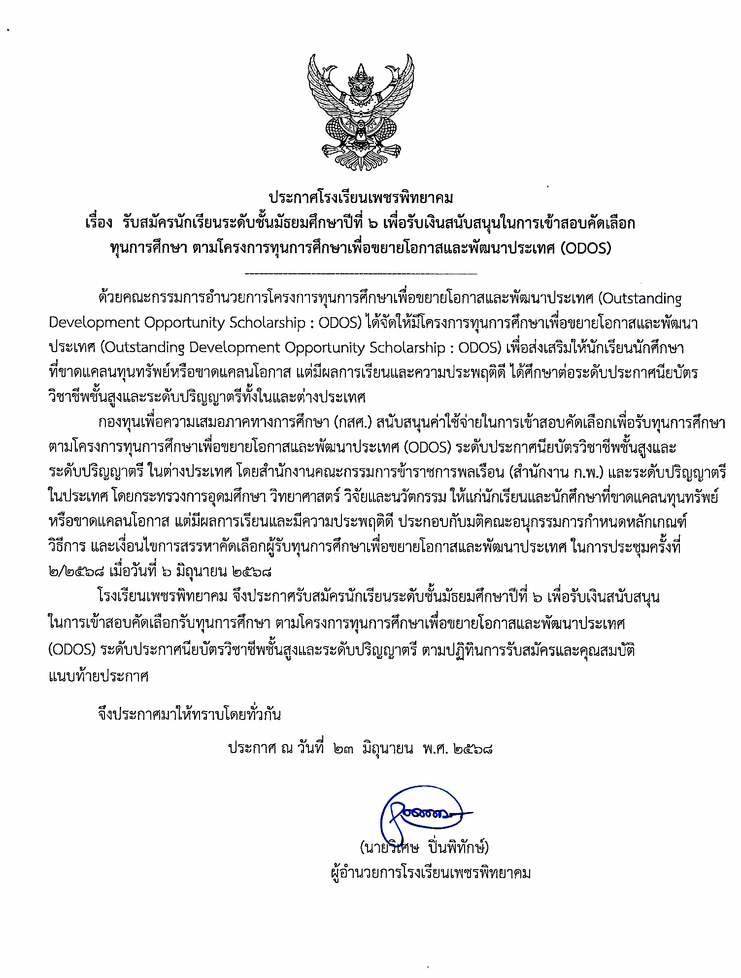 ประกาศโรงเรียนเพชรพิทยาคม เรื่อง รับสมัครนักเรียนระดับชั้นมัธยมศึกษาปีที่ 6 เพื่อรับเงินสนับสนุนในการเข้าสอบคัดเลือก ทุนการศึกษา ตามโครงการทุนการศึกษาเพื่อขยายโอกาสและพัฒนาประเทศ (ODOS)