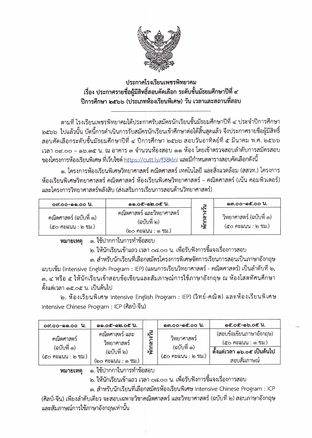 ปีการศึกษา 2566 (ประเภทห้องเรียนพิเศษ) วัน เวลาและสถานที่สอบ