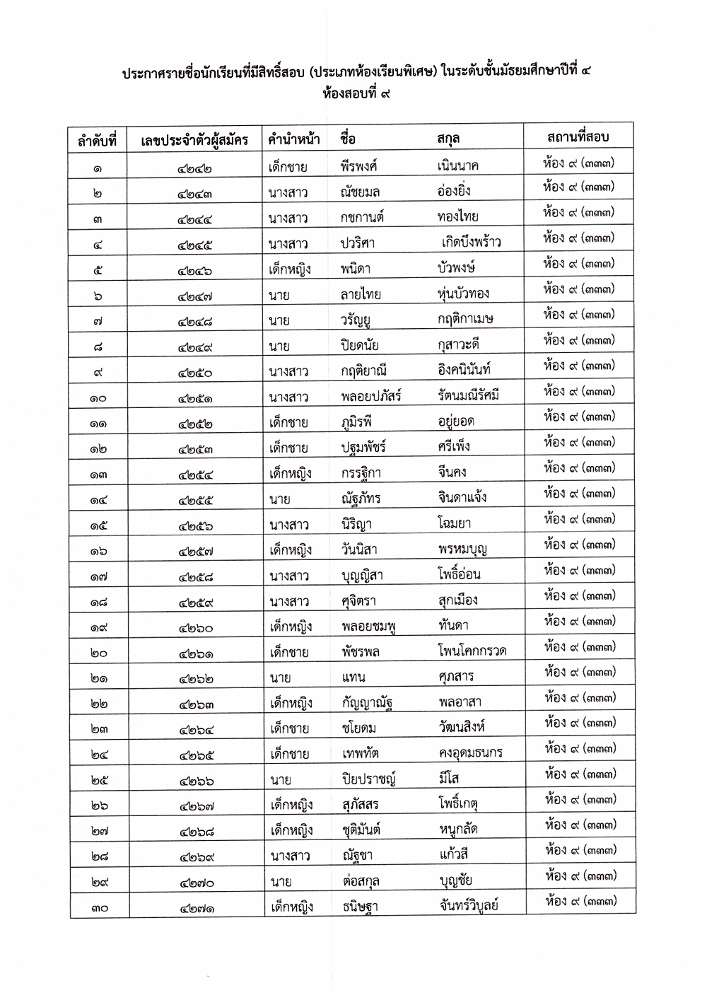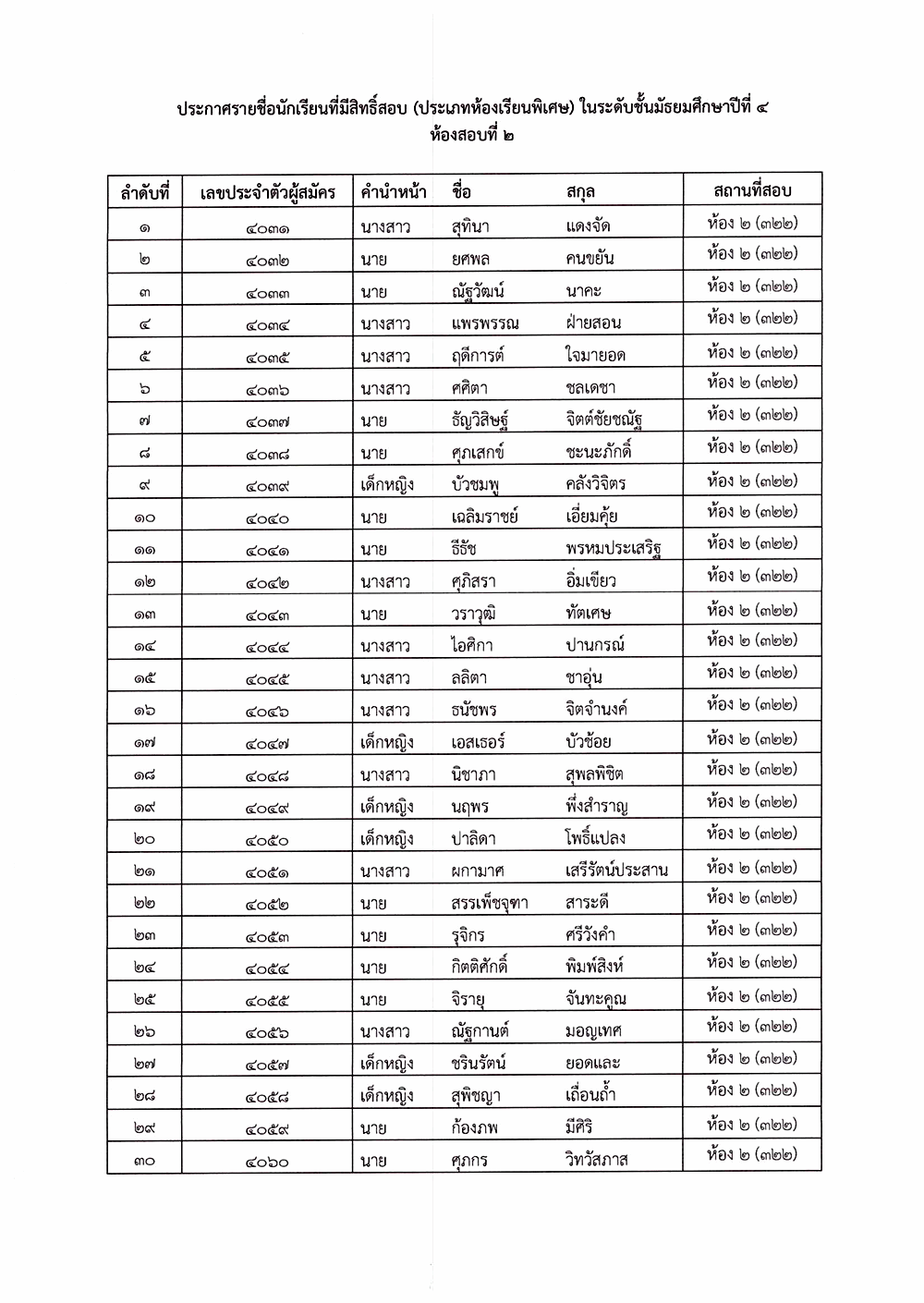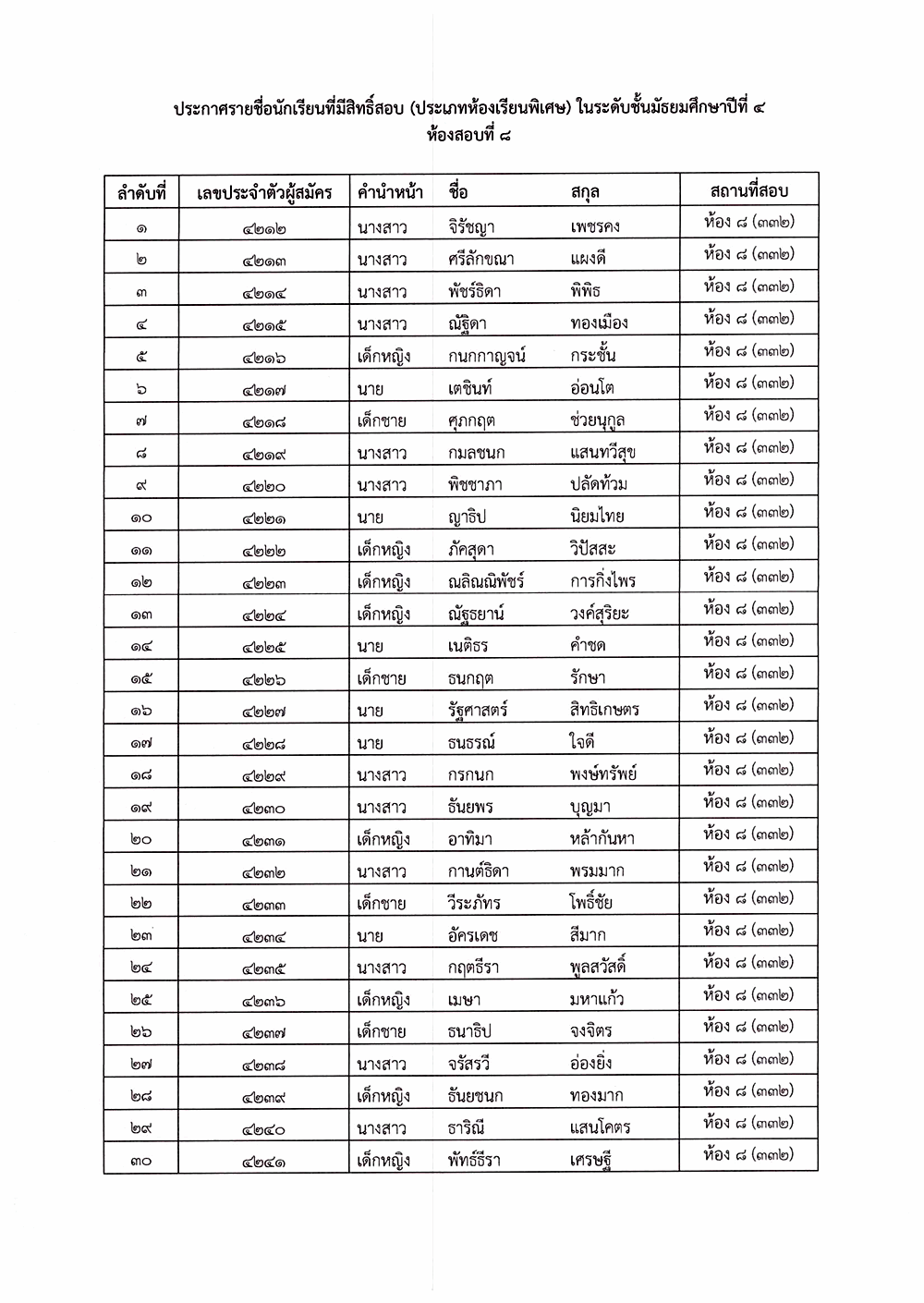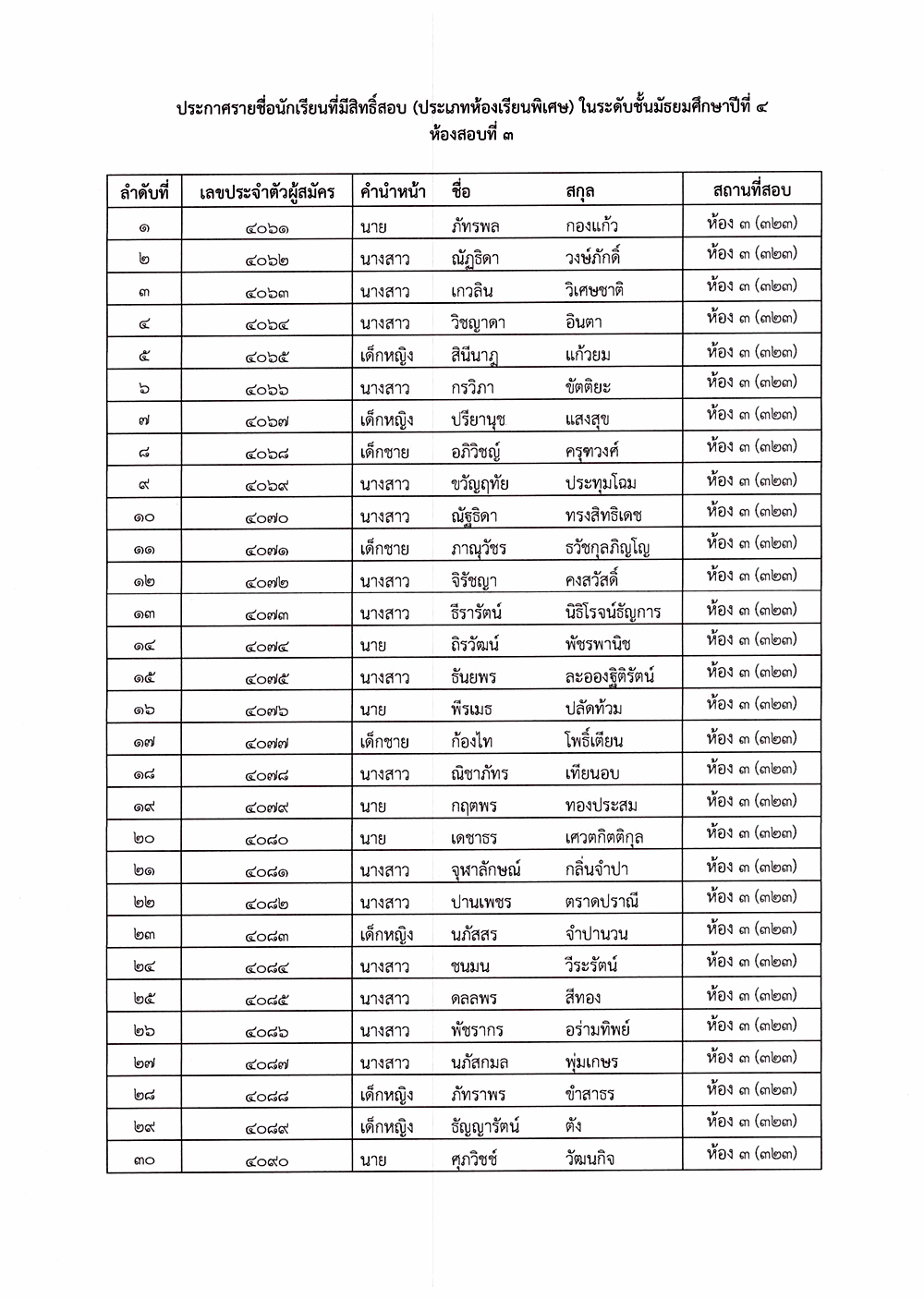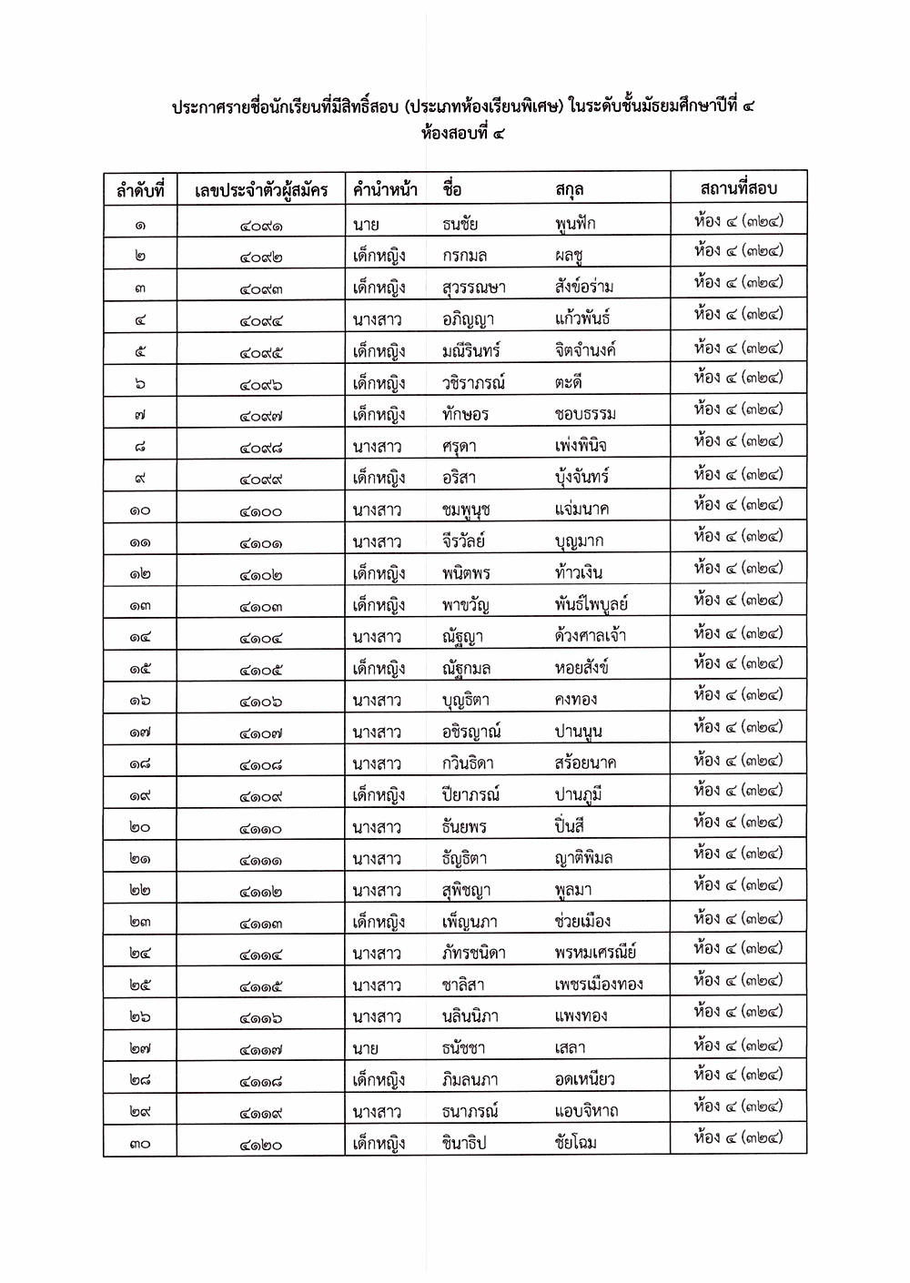 เรื่อง ประกาศรายชื่อผู้มีสิทธิ์สอบคัดเลือก ระดับชั้นมัธยมศึกษาปีที่ 4
