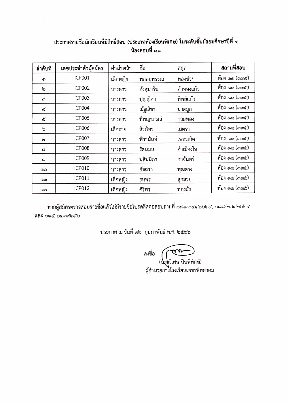 ประกาศโรงเรียนเพชรพิทยาคม เรื่อง ประกาศรายชื่อผู้มีสิทธิ์สอบคัดเลือก ระดับชั้นมัธยมศึกษาปีที่ 4 ปีการศึกษา 2566 (ประเภทห้องเรียนพิเศษ) วัน เวลาและสถานที่สอบ