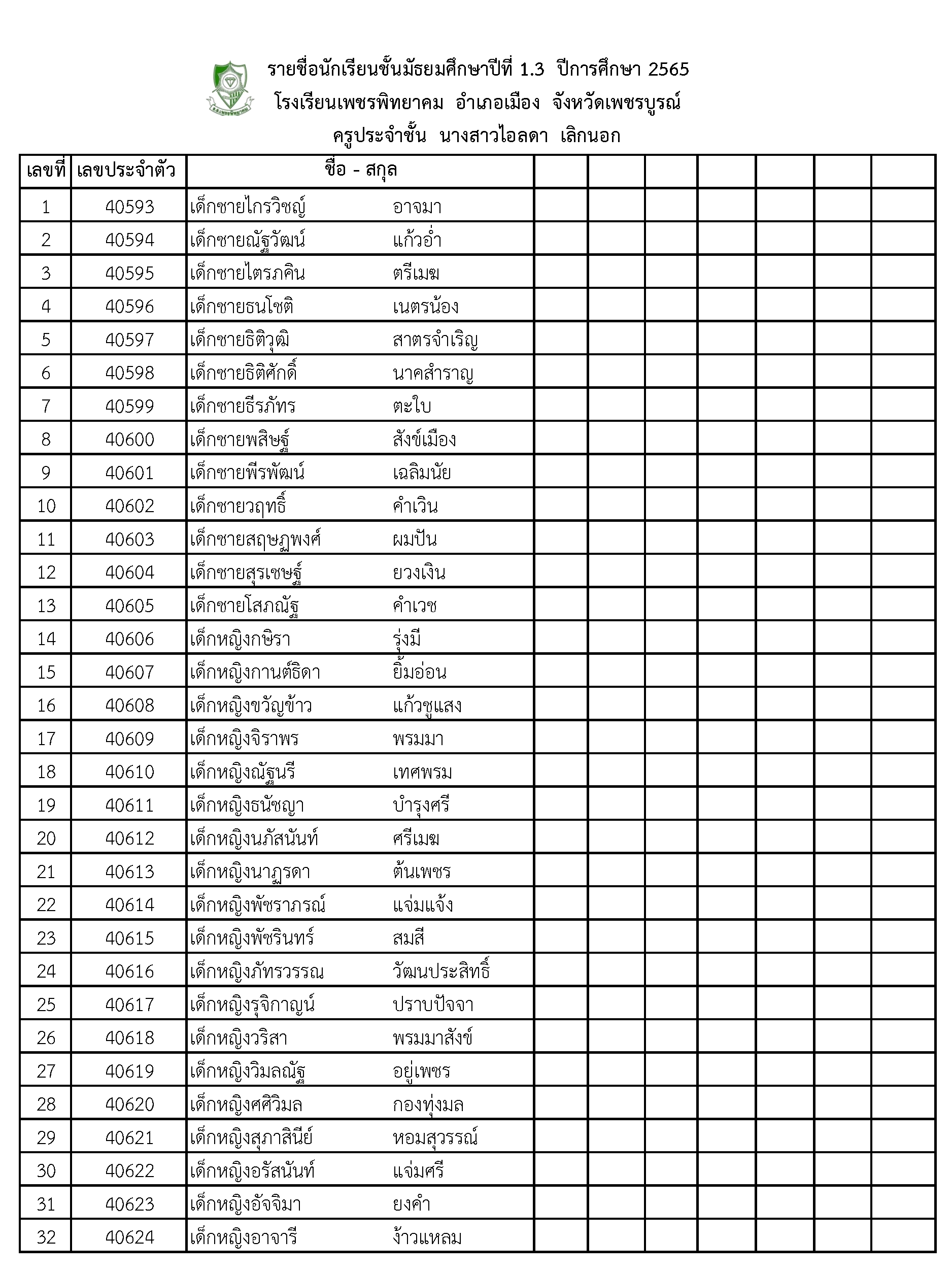 รายชื่อนักเรียนชั้นมัธยมศึกษาปีที่ 1.3 ปีการศึกษา 2565 โรงเรียนเพชรพิทยาคม