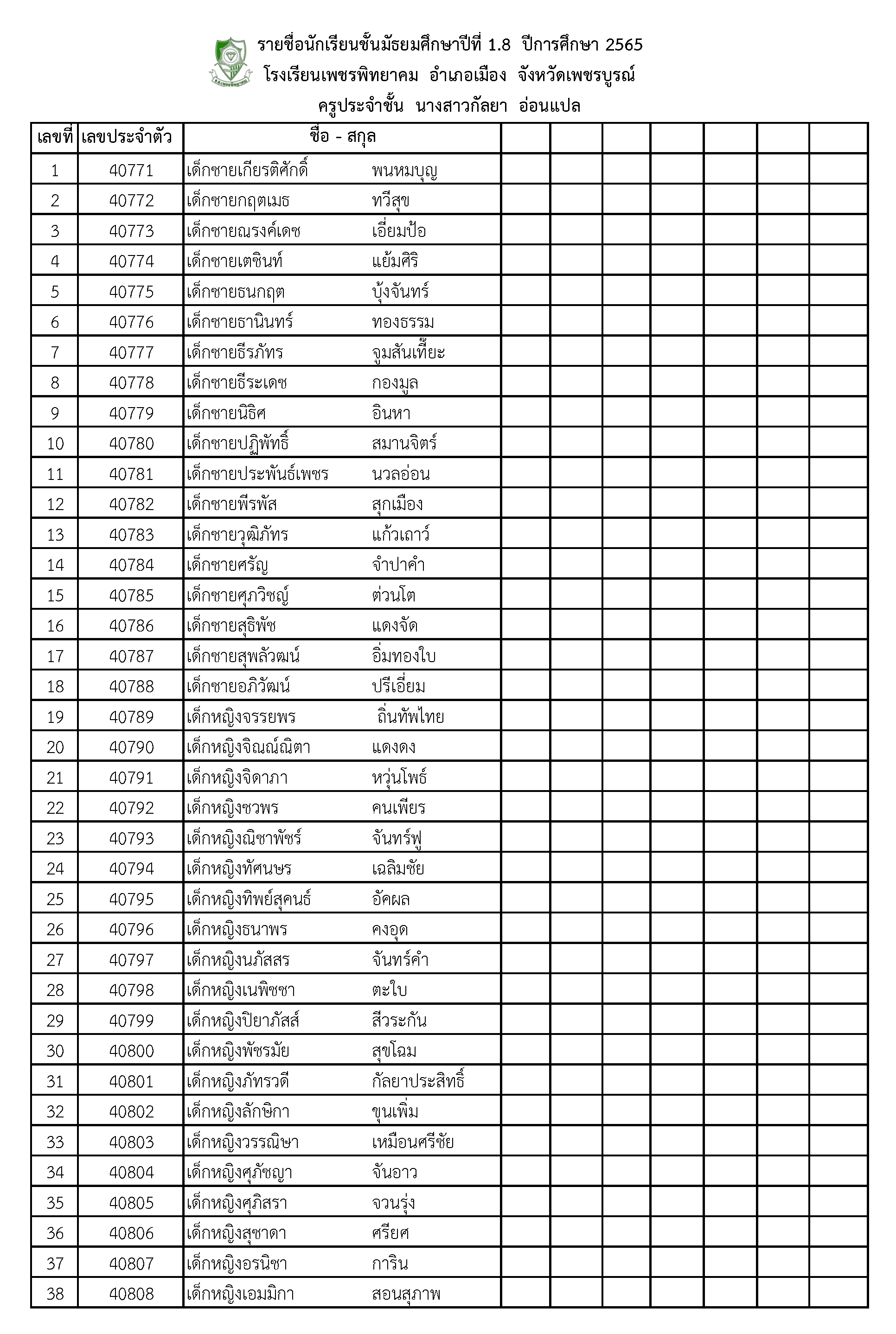 รายชื่อนักเรียนชั้นมัธยมศึกษาปีที่ 1.8 ปีการศึกษา 2565 โรงเรียนเพชรพิทยาคม