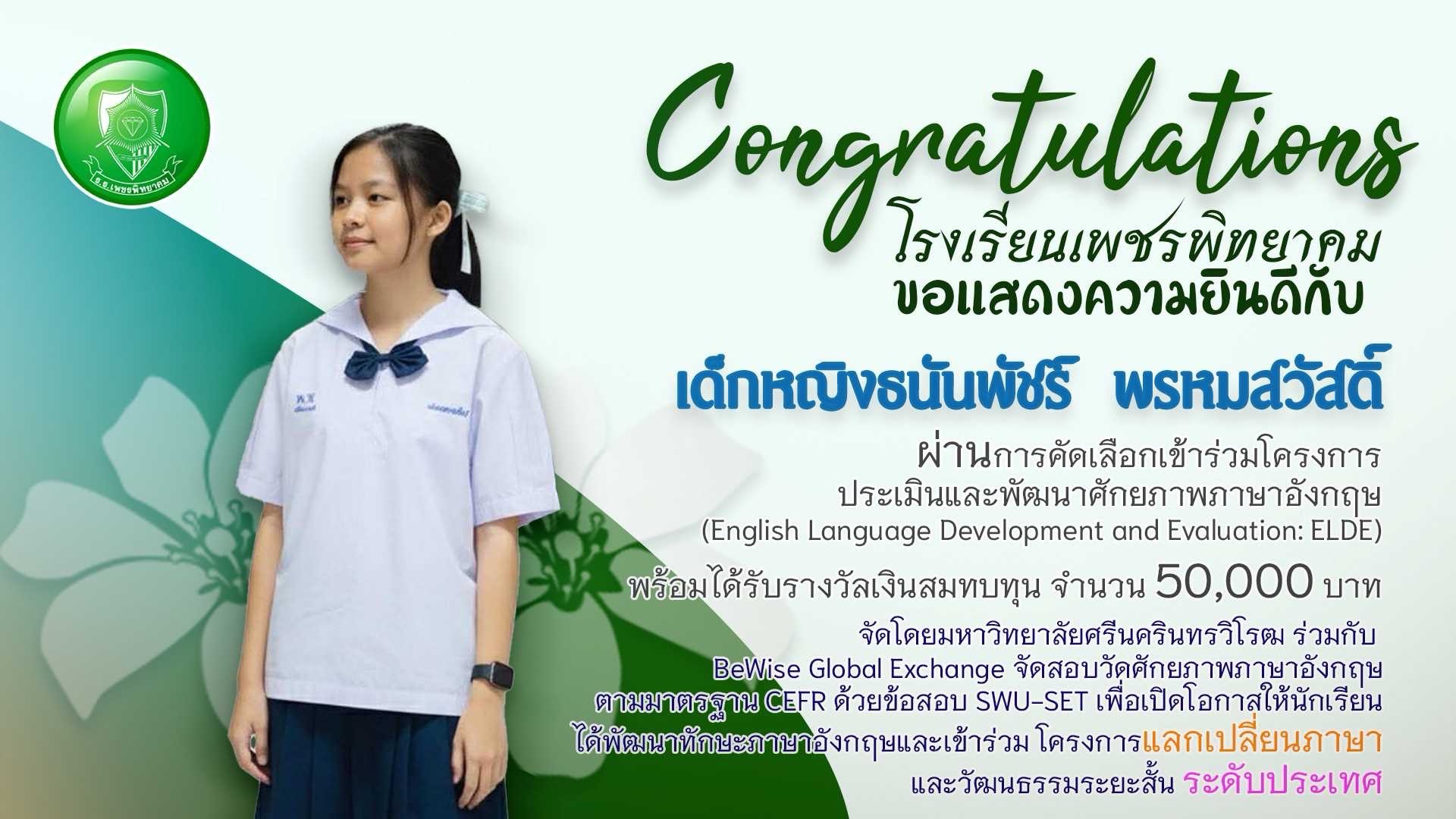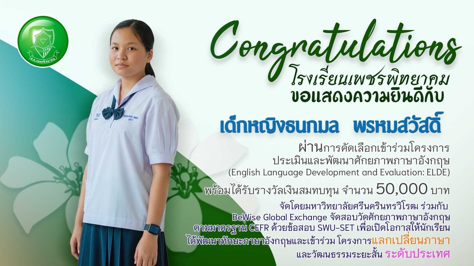 ขอแสดงความยินดีกับนักเรียนเพชรพิทยาคม ผ่านการคัดเลือกเข้าร่วมโครงการ ELDE พร้อมรับทุนการศึกษา 50,000 บาท