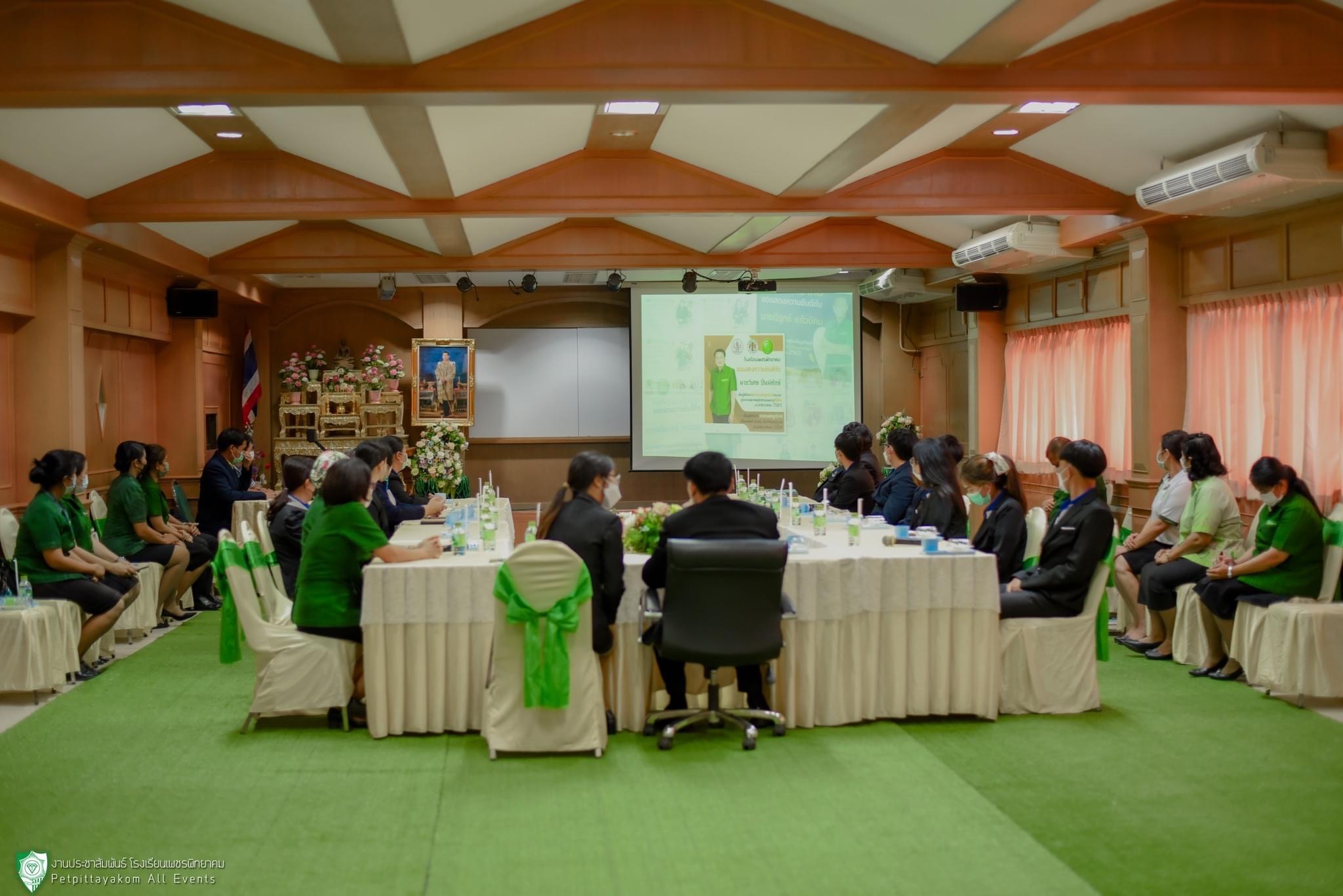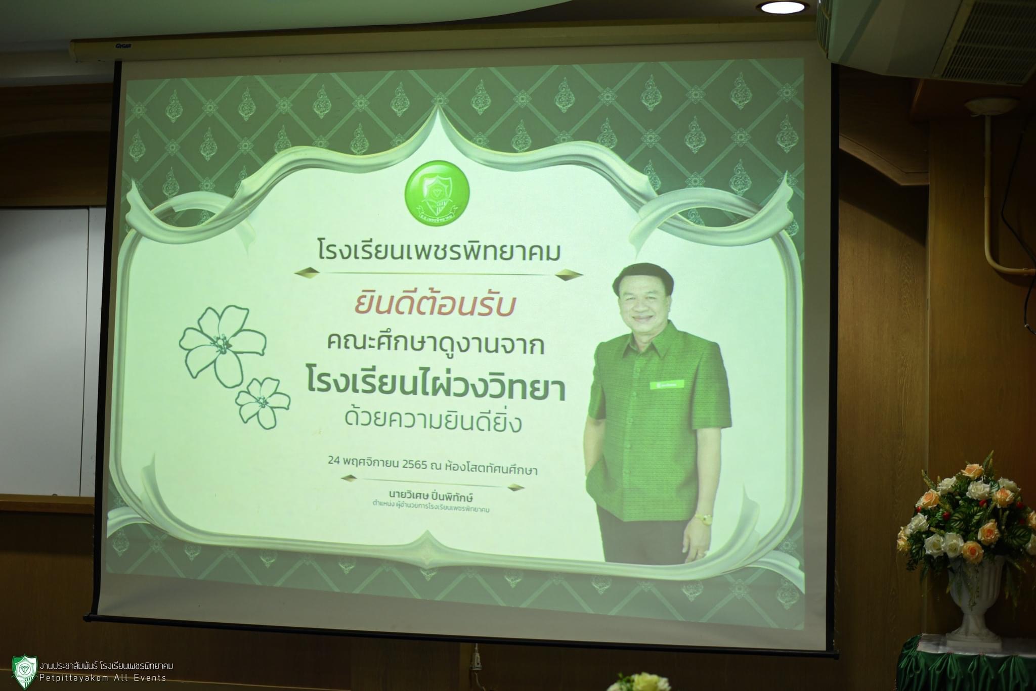 24 พฤศจิกายน 2565 นายวิเศษ ปิ่นพิทักษ์ ผู้อำนวยการโรงเรียนเพชรพิทยาคม พร้อมด้วยรองผู้อำนวยการ และคณะครูร่วมต้อนรับคณะศึกษาดูงาน แลกเปลี่ยนเรียนรู้งานหลักสูตรสถานศึกษาและการจัดการศึกษาด้านอาชีพ กับโรงเรียนไผ่วงวิทยา จังหวัดอ่างทอง นำโดยนางสาวกานต์ฤทัย ชลวิทย์ เนตรจันทร์ ผู้อำนวยการโรงเรียน พร้อมคณะครู ณ ห้องโสตทัศนศึกษา โรงเรียนเพชรพิทยาคม