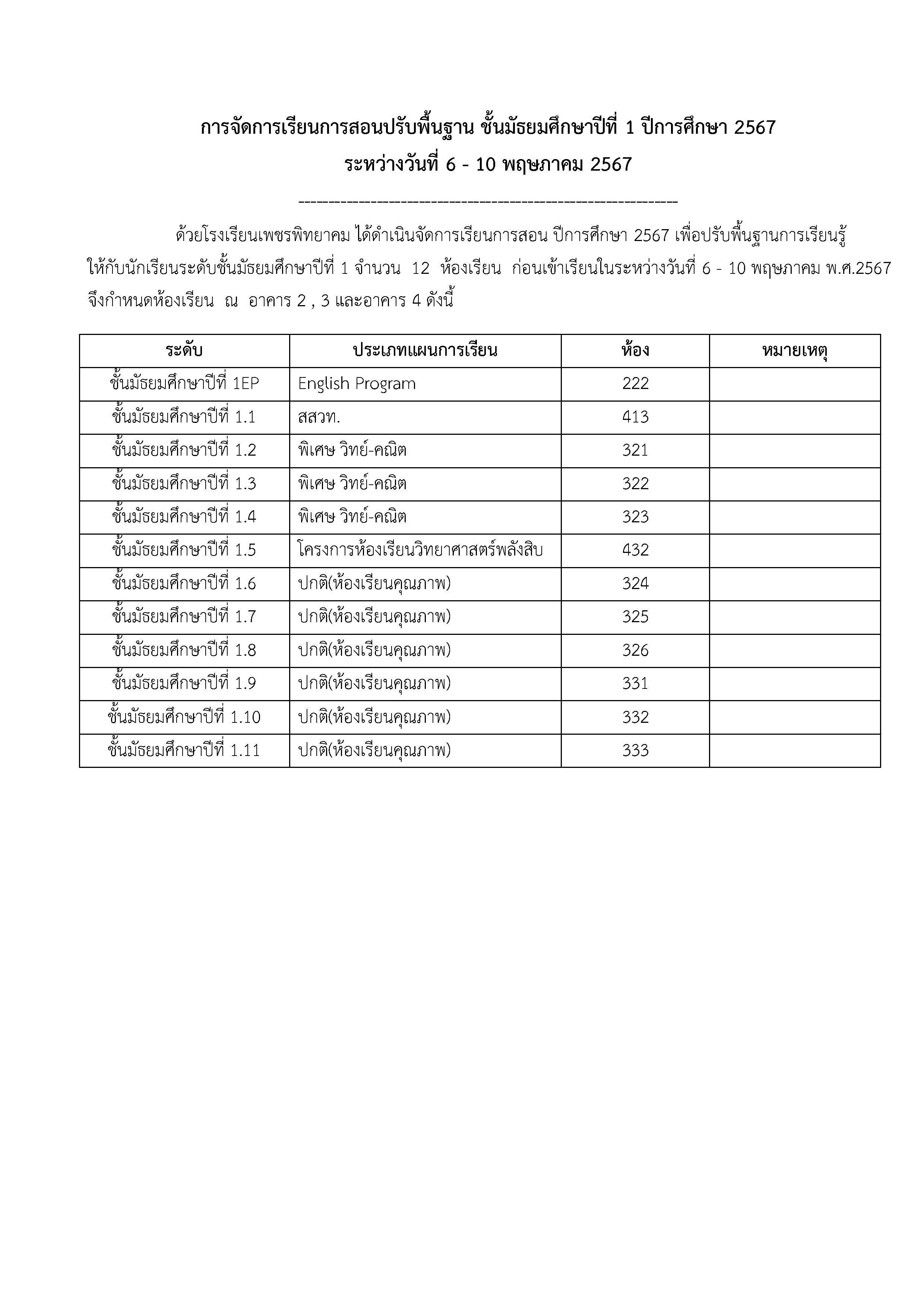 ด้วยโรงเรียนเพชรพิทยาคม ได้ดําเนินจัดการเรียนการสอน ปีการศึกษา 2567 เพื่อปรับพื้นฐานการเรียนรู้ ให้กับนักเรียนระดับชั้นมัธยมศึกษาปีที่ 1 จํานวน 12 ห้องเรียน ก่อนเข้าเรียนในระหว่างวันที่ 6 - 10 พฤษภาคม พ.ศ.2567 จึงกําหนดห้องเรียน ณ อาคาร 2 , 3 และอาคาร 4 ดังนี้