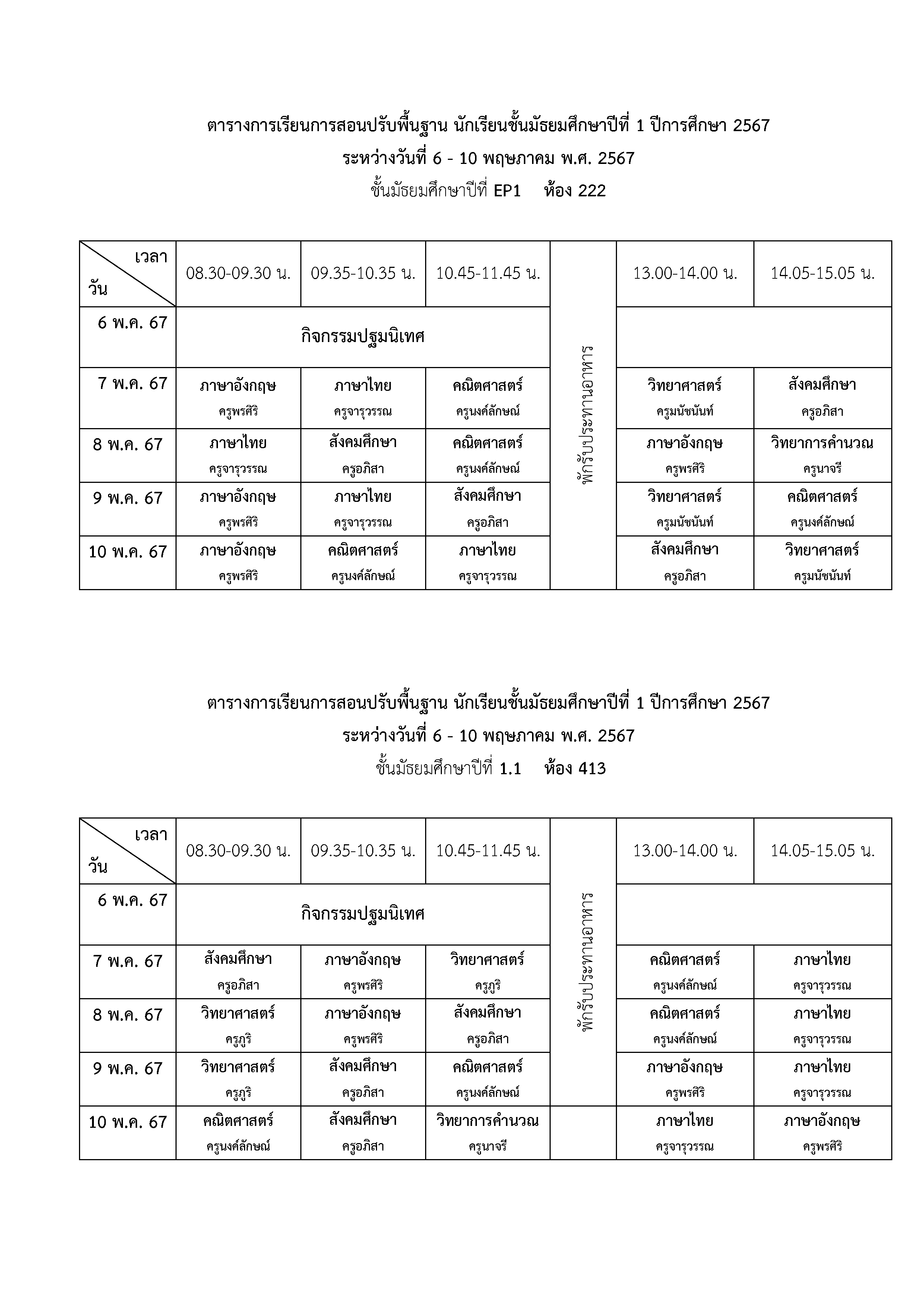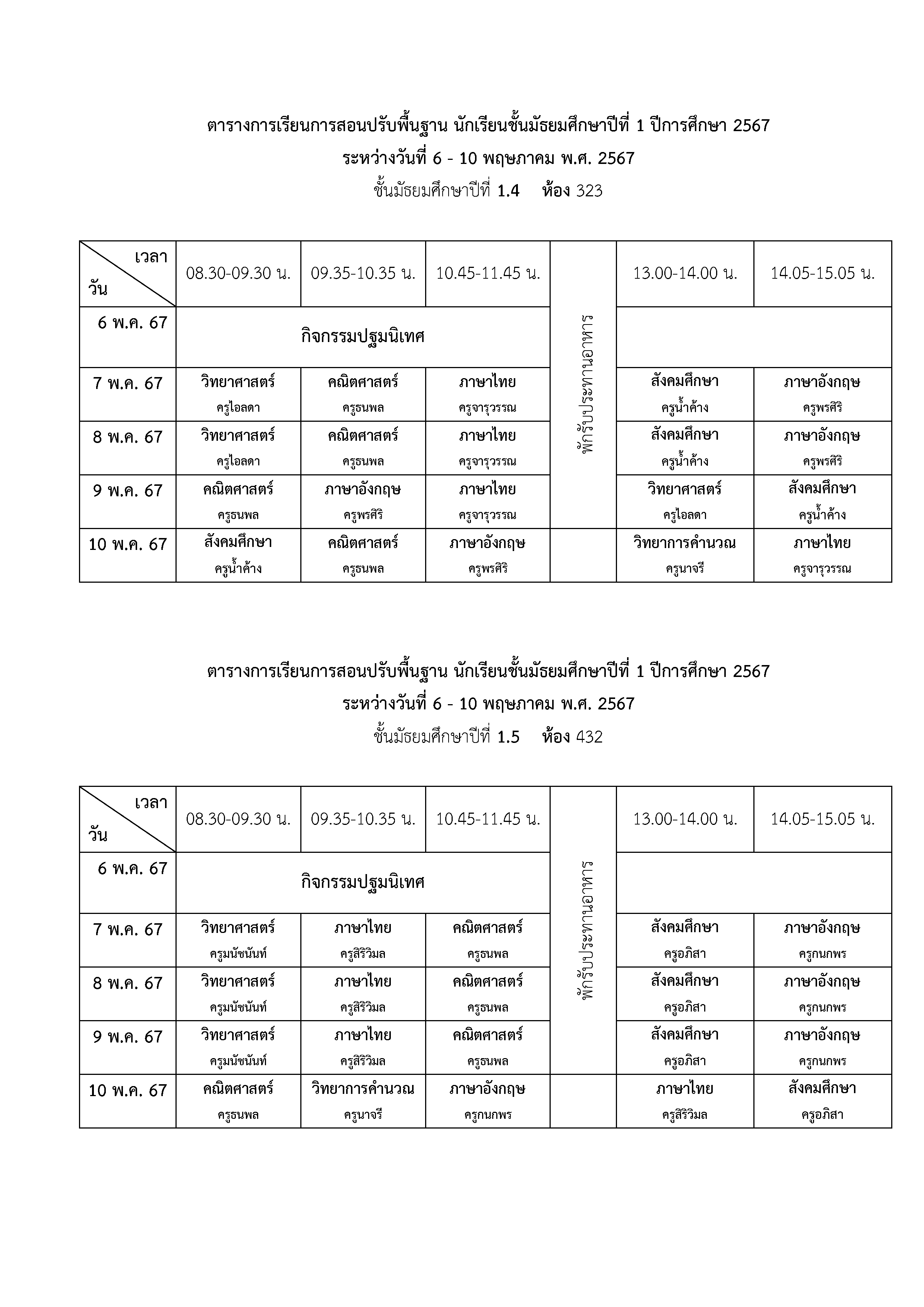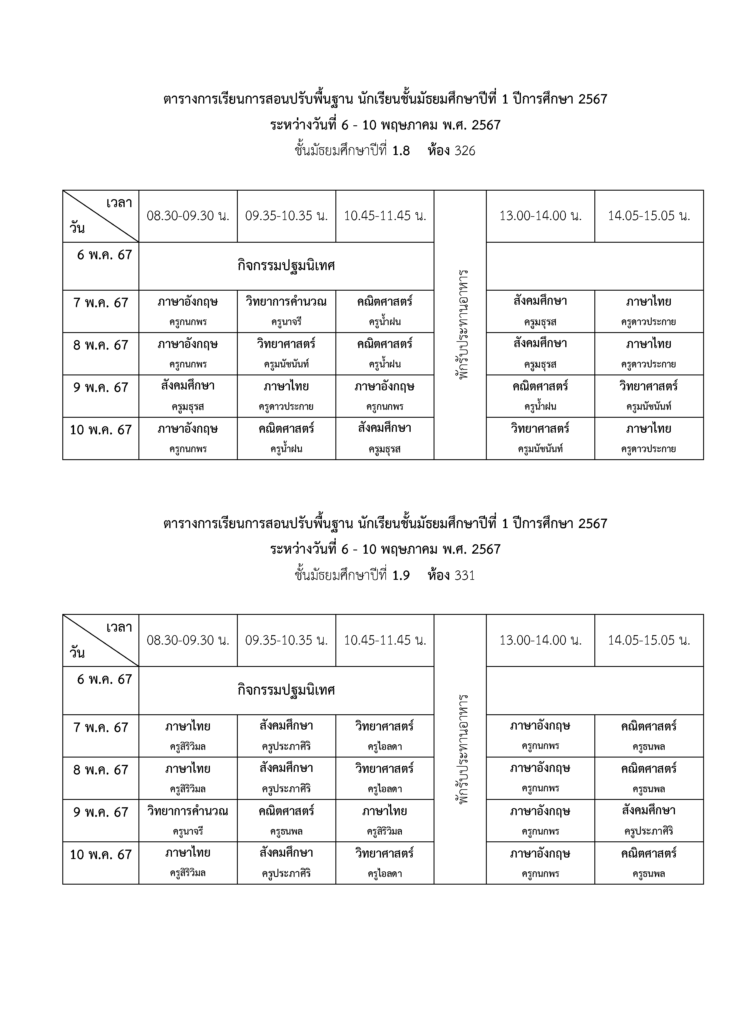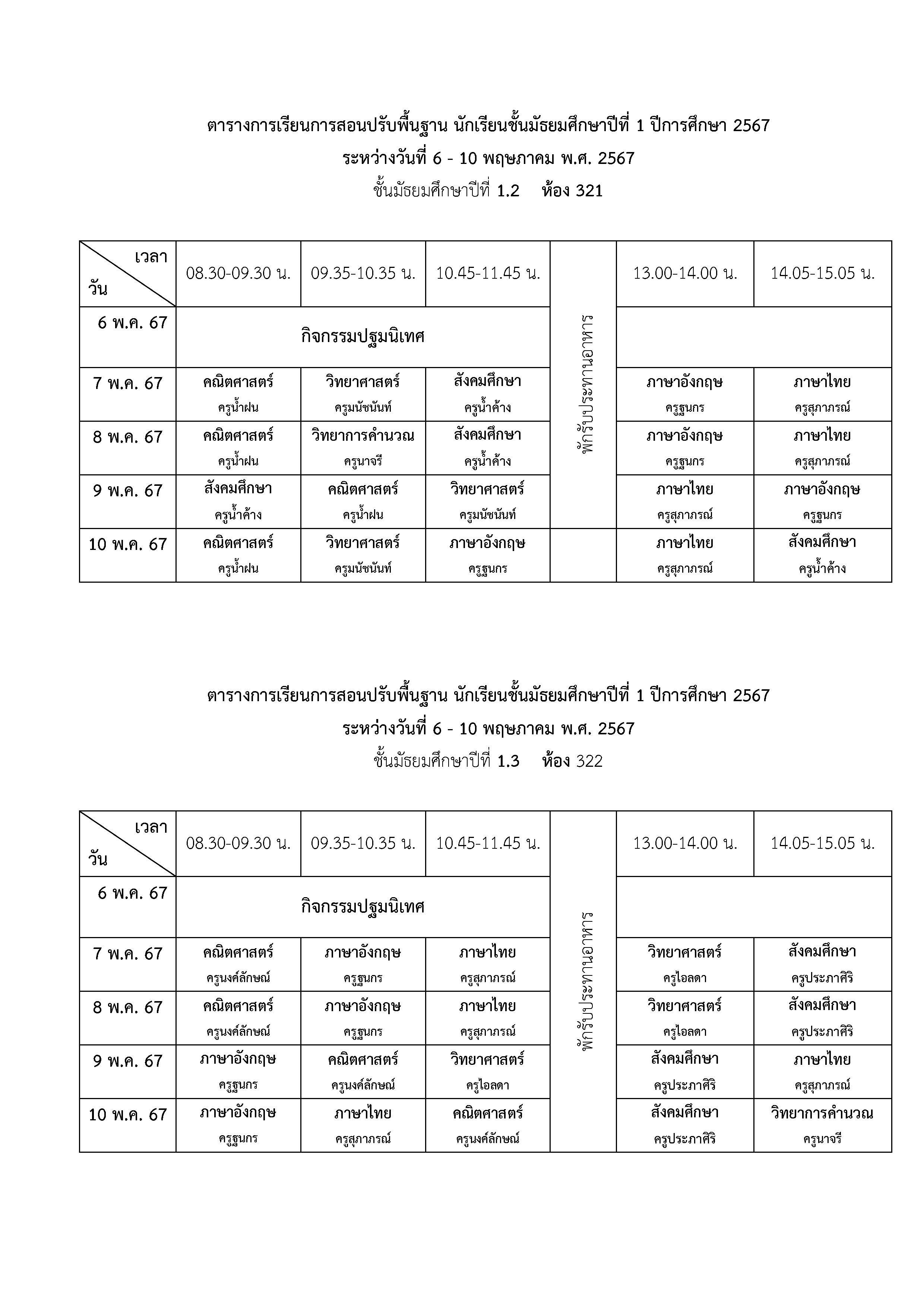 ตารางการเรียนการสอนปรับพื้นฐาน นักเรียนชั้นมัธยมศึกษาปีที่ 1 ปีการศึกษา 2567