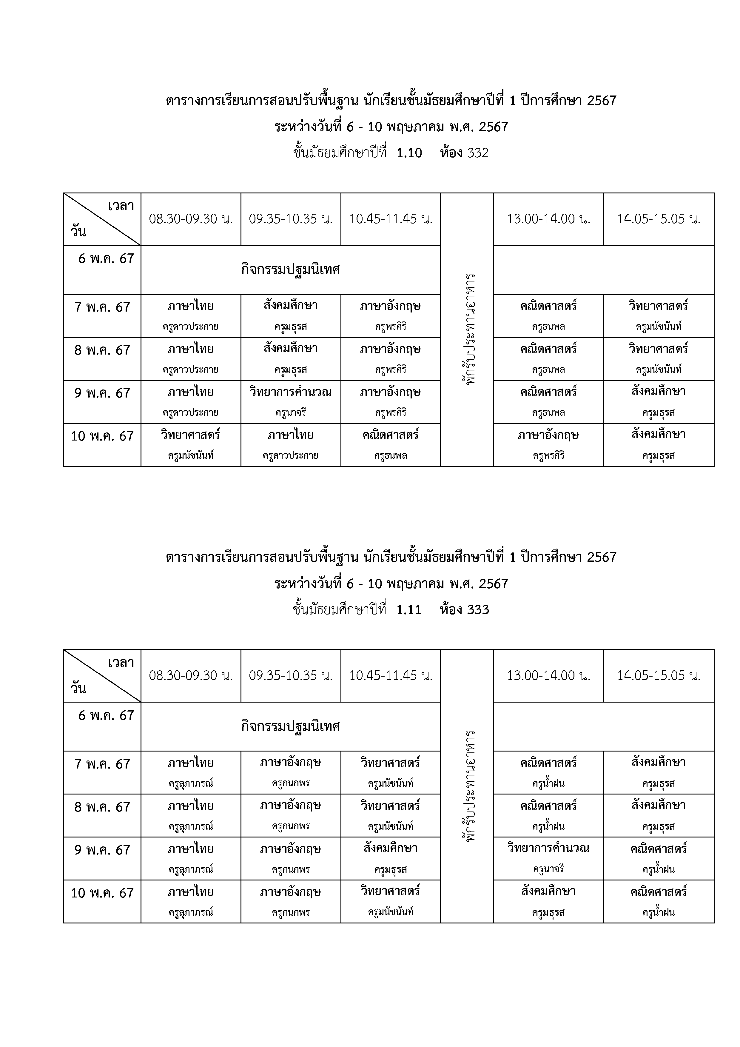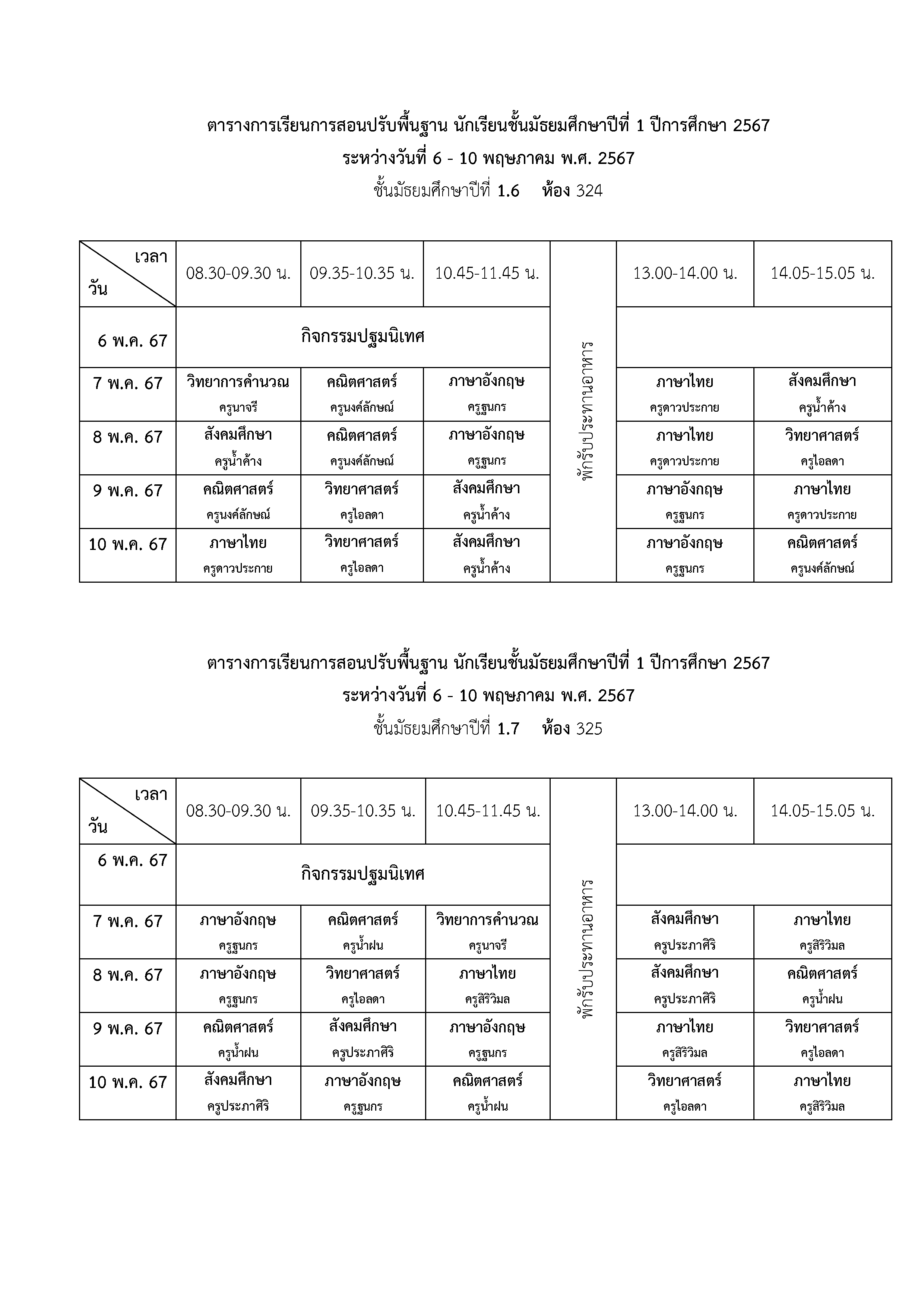 ตารางการเรียนการสอนปรับพื้นฐาน นักเรียนชั้นมัธยมศึกษาปีที่ 1 ปีการศึกษา 2567 ระหว่างวันที่ 6 - 10 พฤษภาคม พ.ศ. 2567