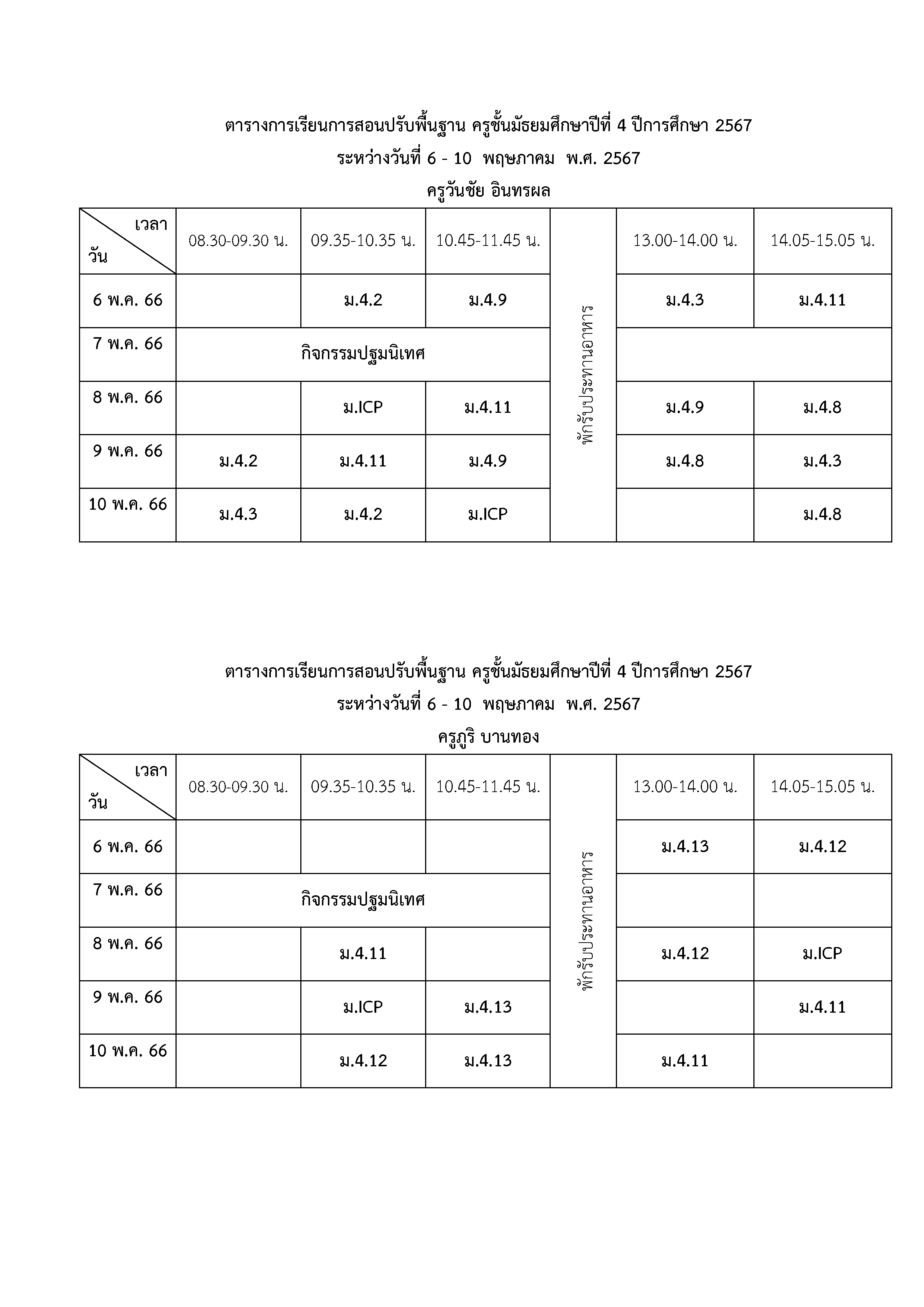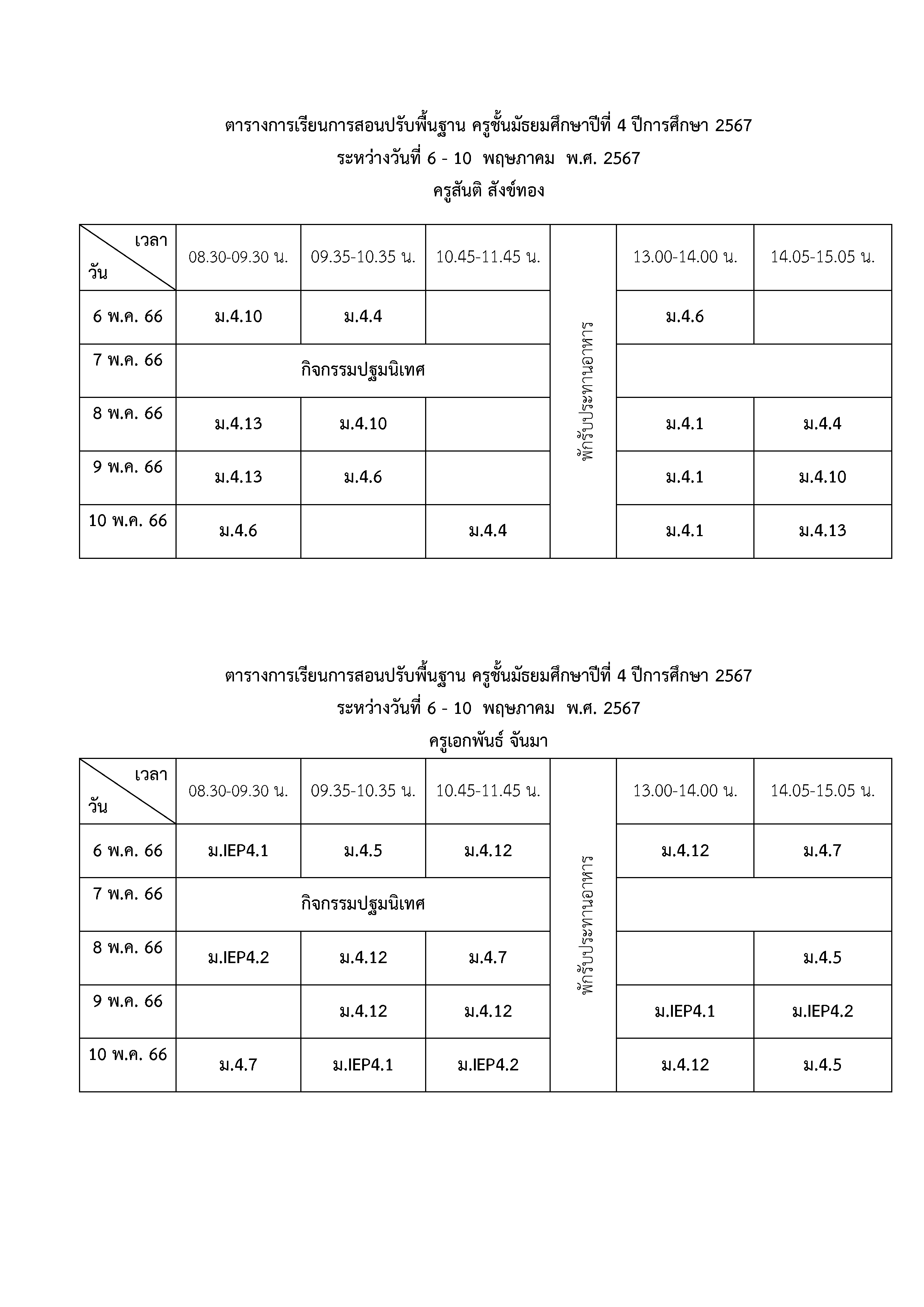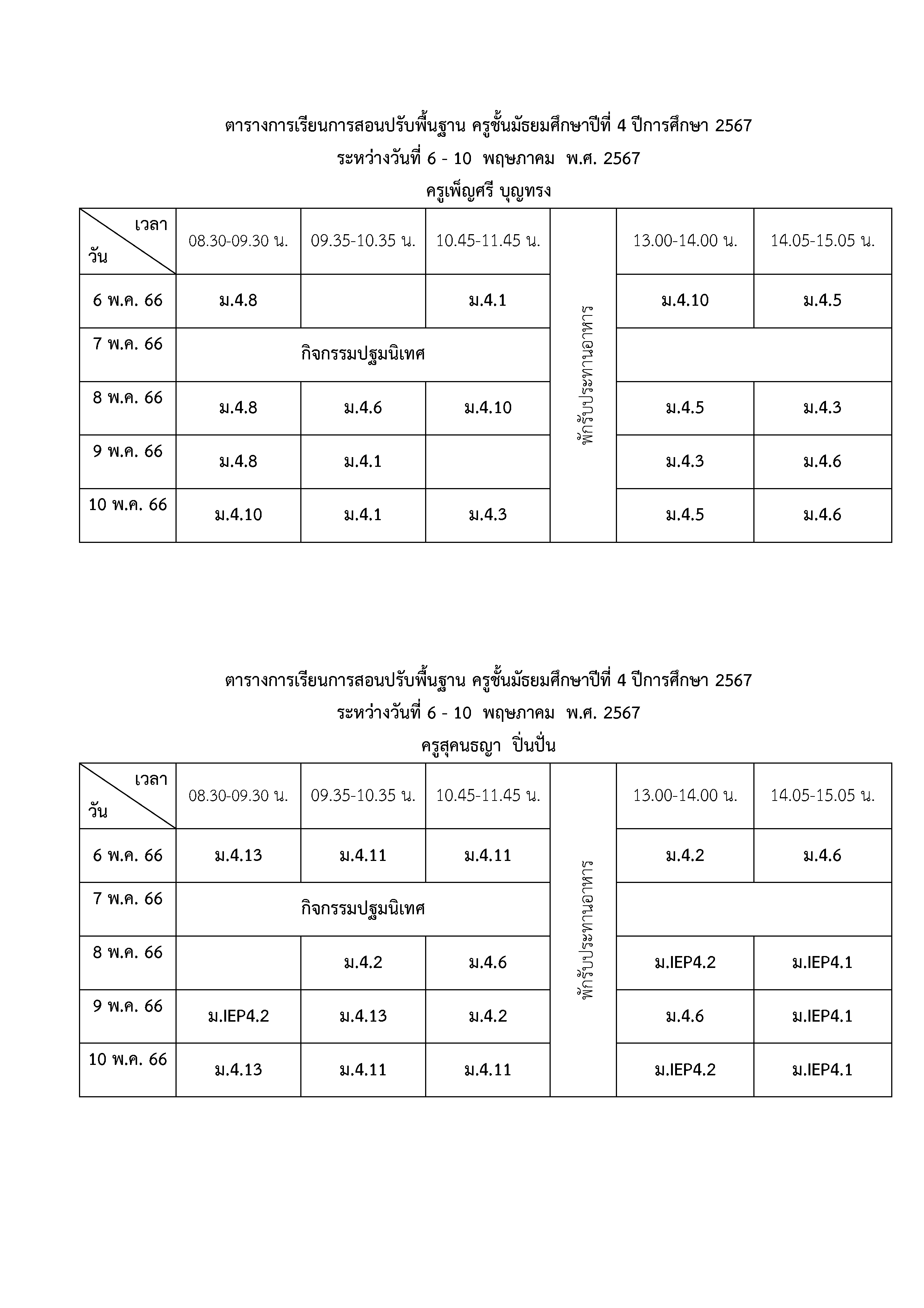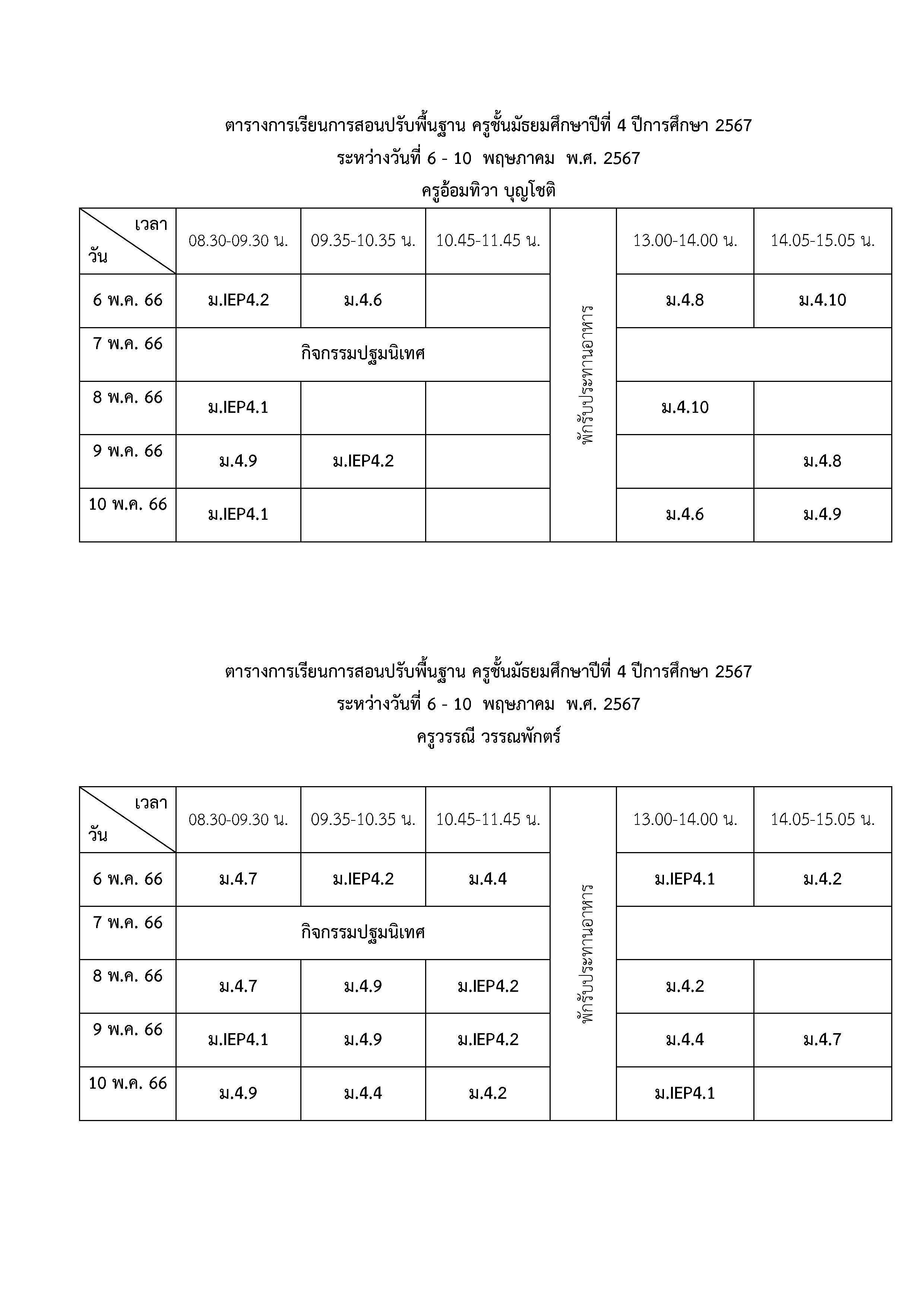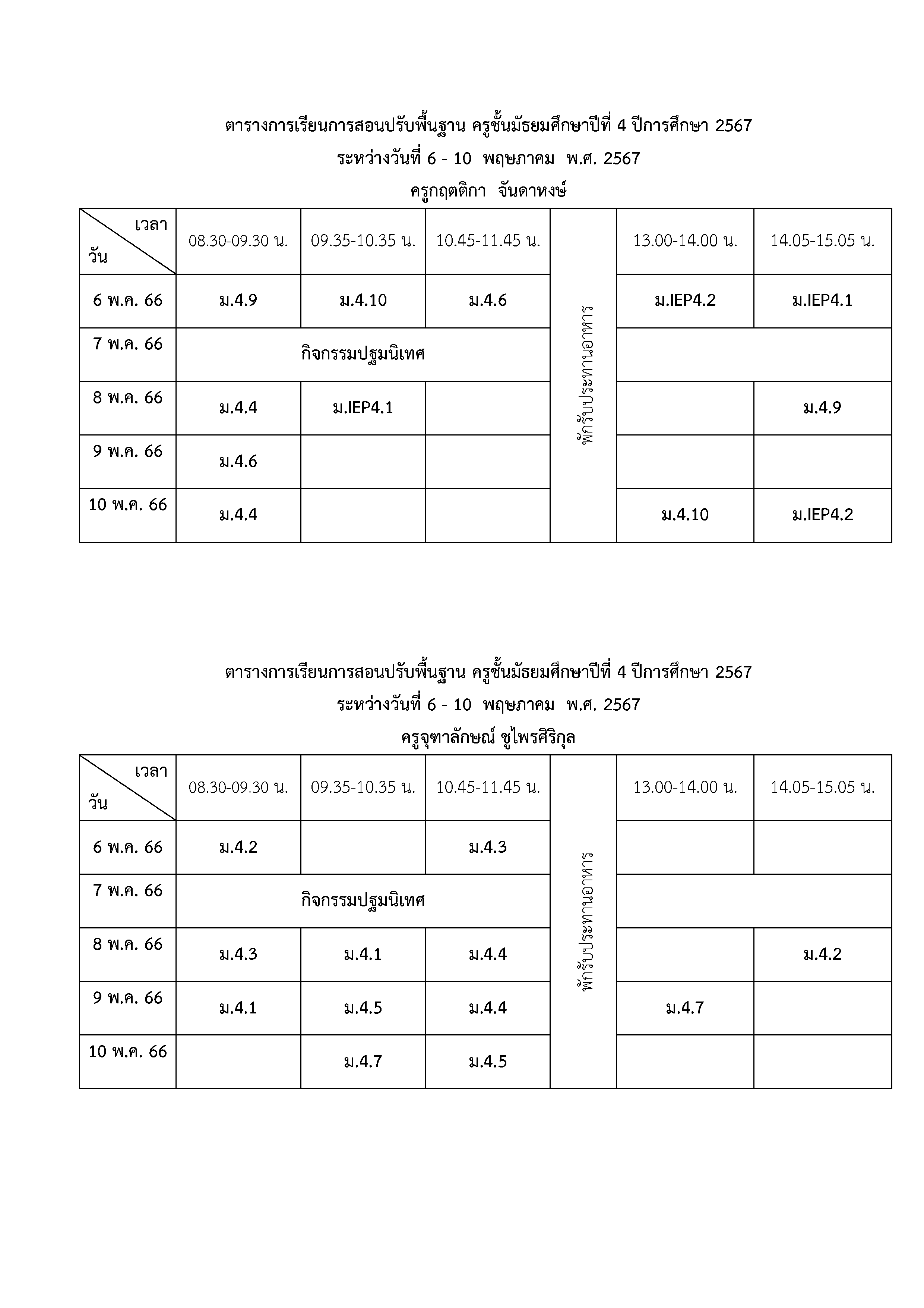 ตารางสอนปรับพื้นฐานของครู ชั้นมัธยมศึกษาปีที่ 4 ปีการศึกษา 2567