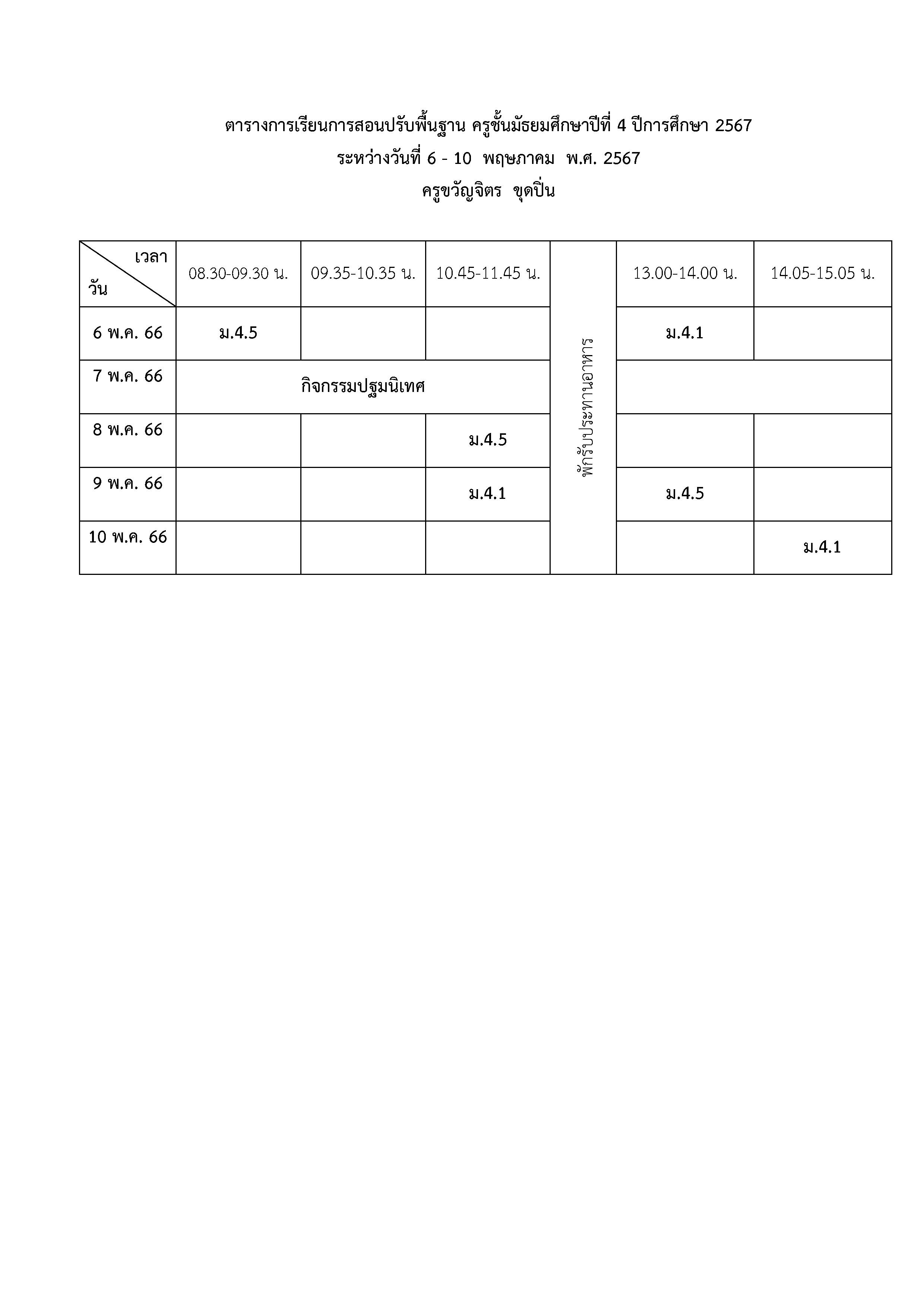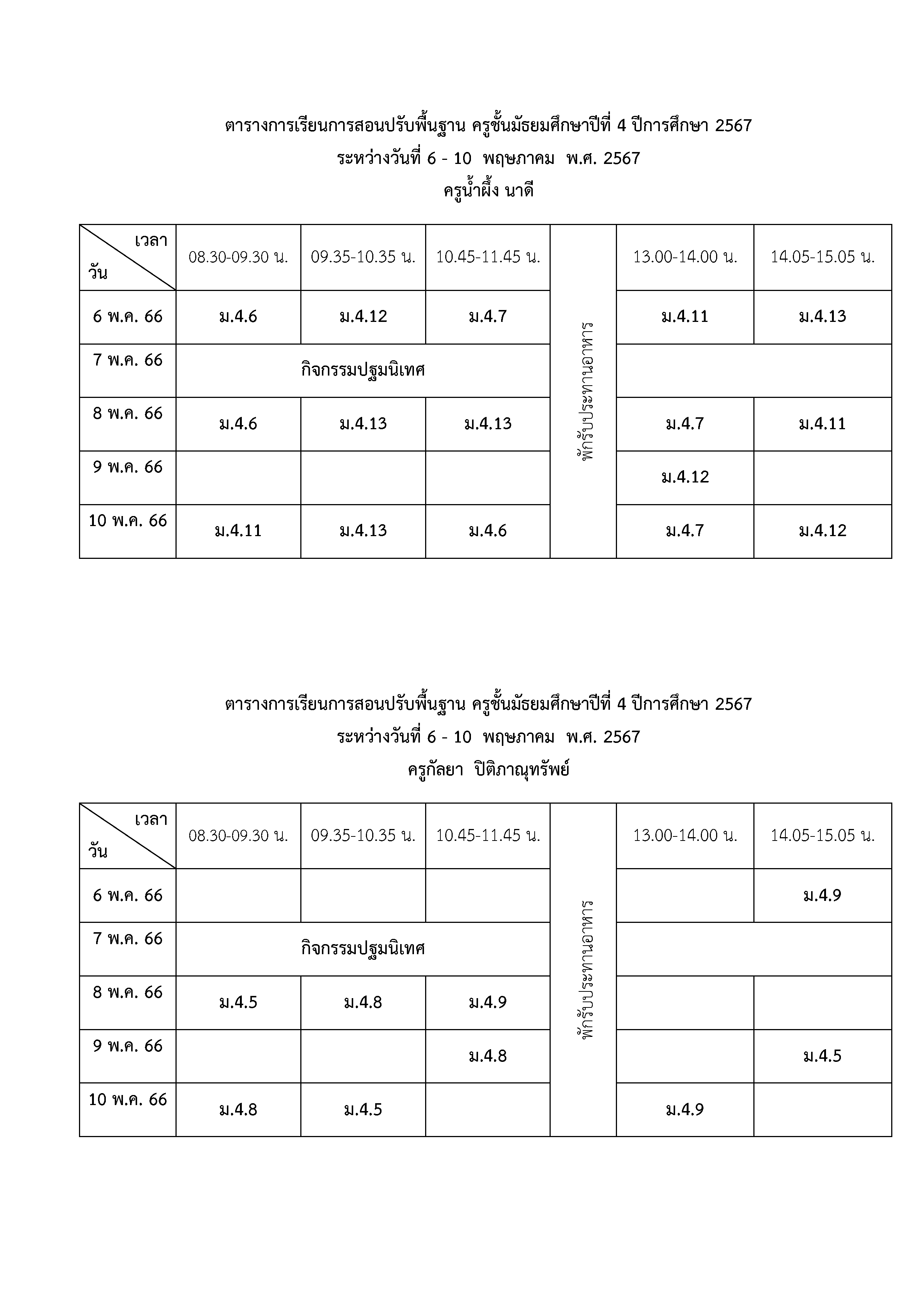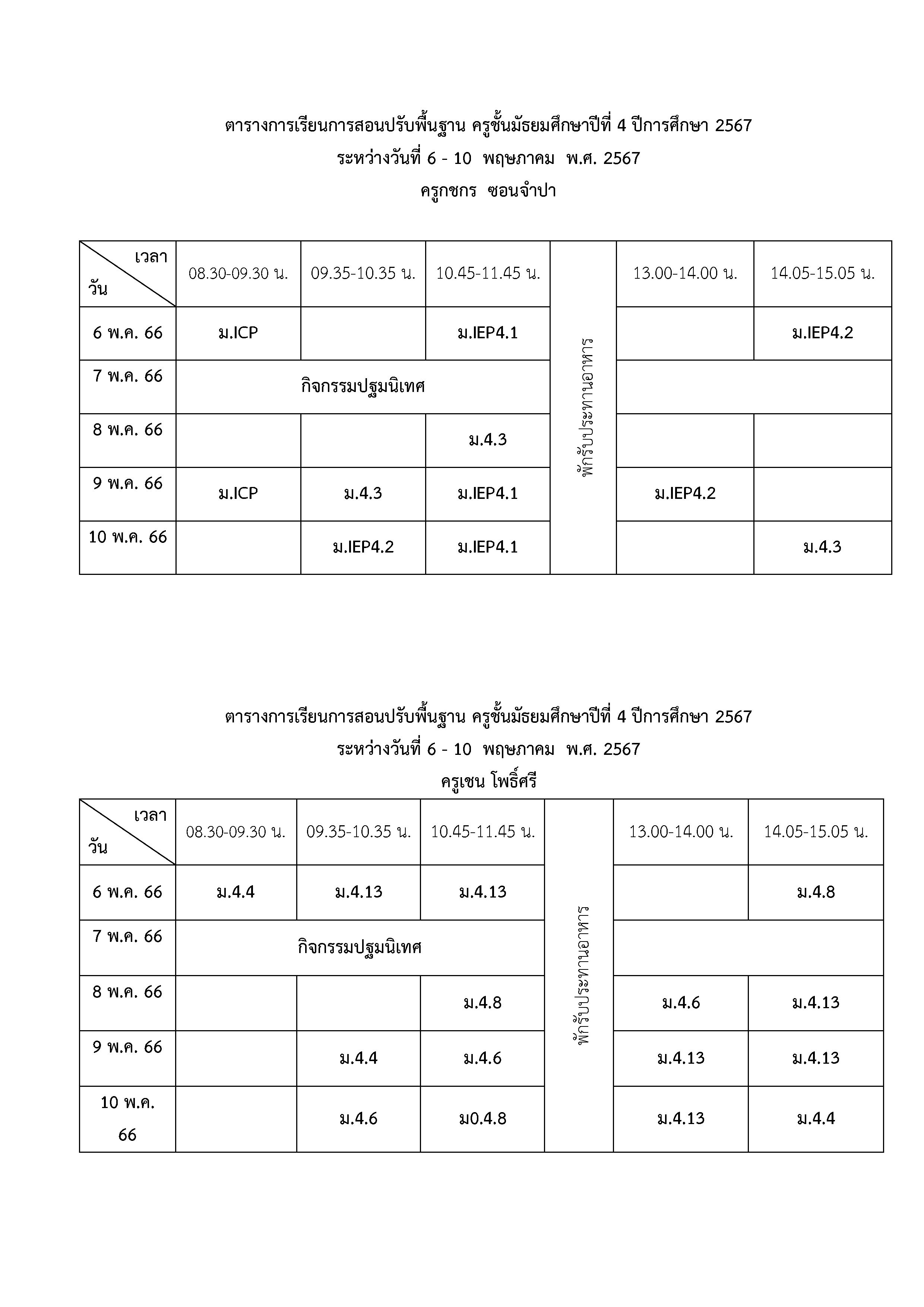 ตารางสอนปรับพื้นฐานของครู ชั้นมัธยมศึกษาปีที่ 4 ปีการศึกษา 2567 ระหว่างวันที่ 6 - 10 พฤษภาคม พ.ศ. 2567