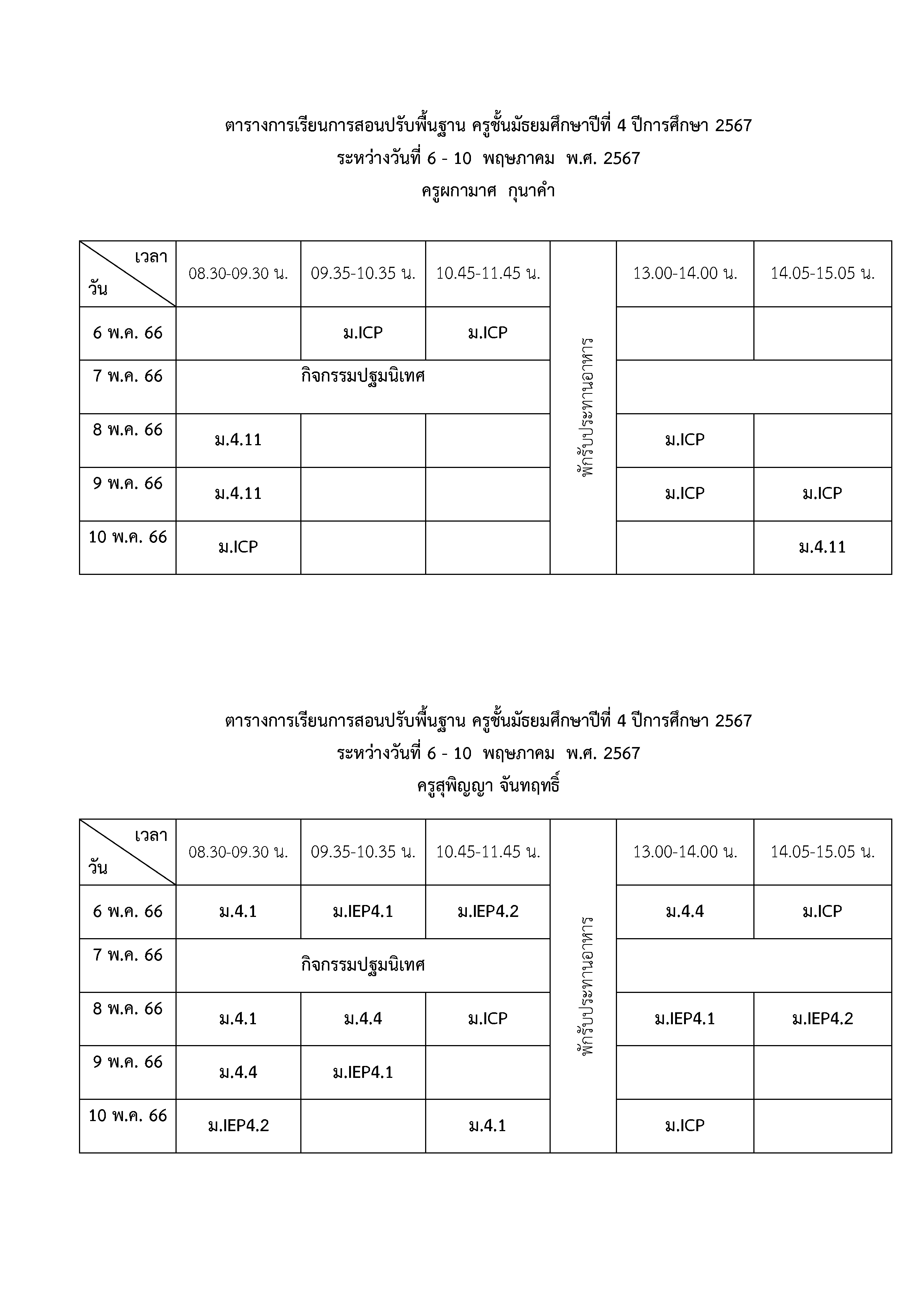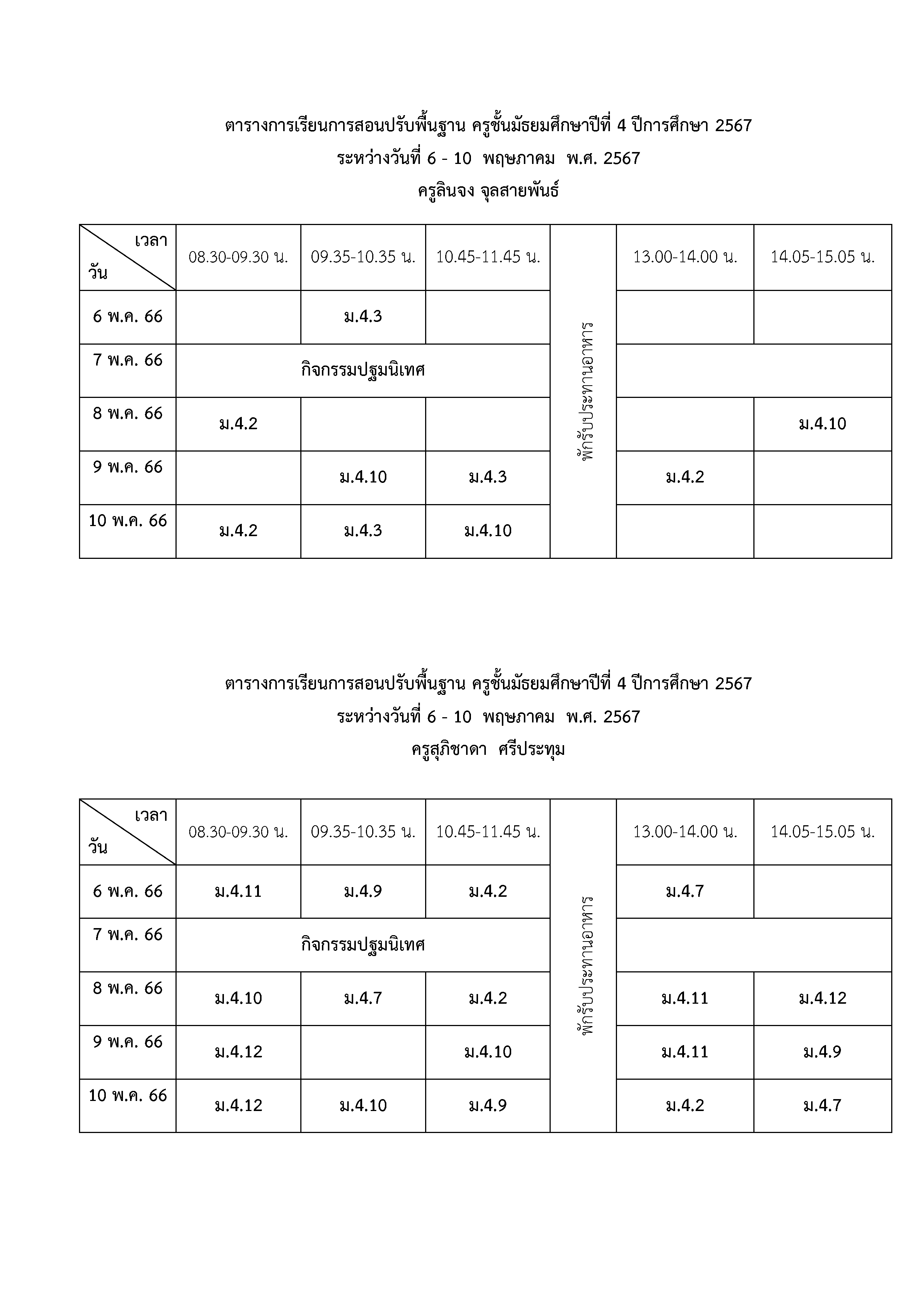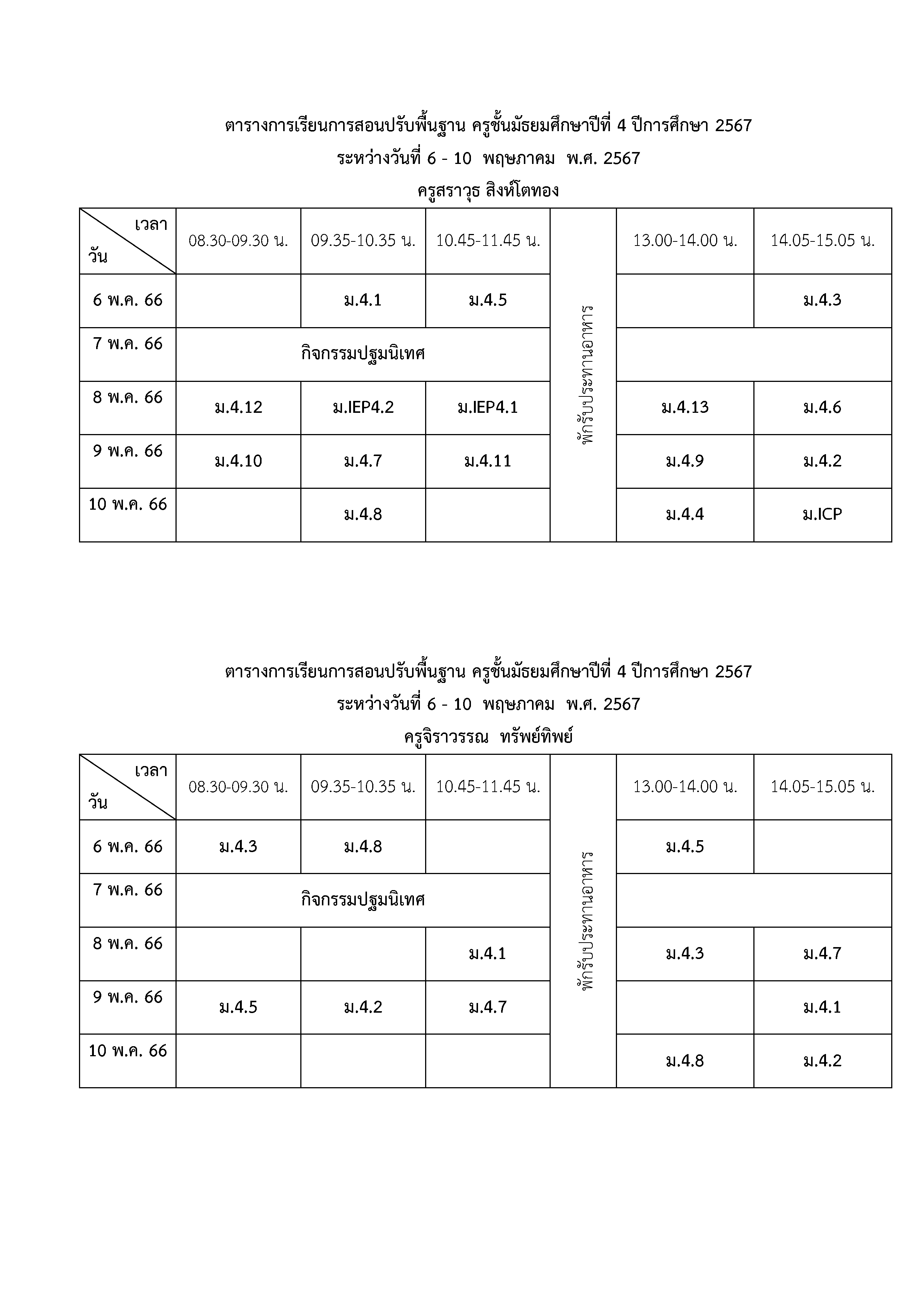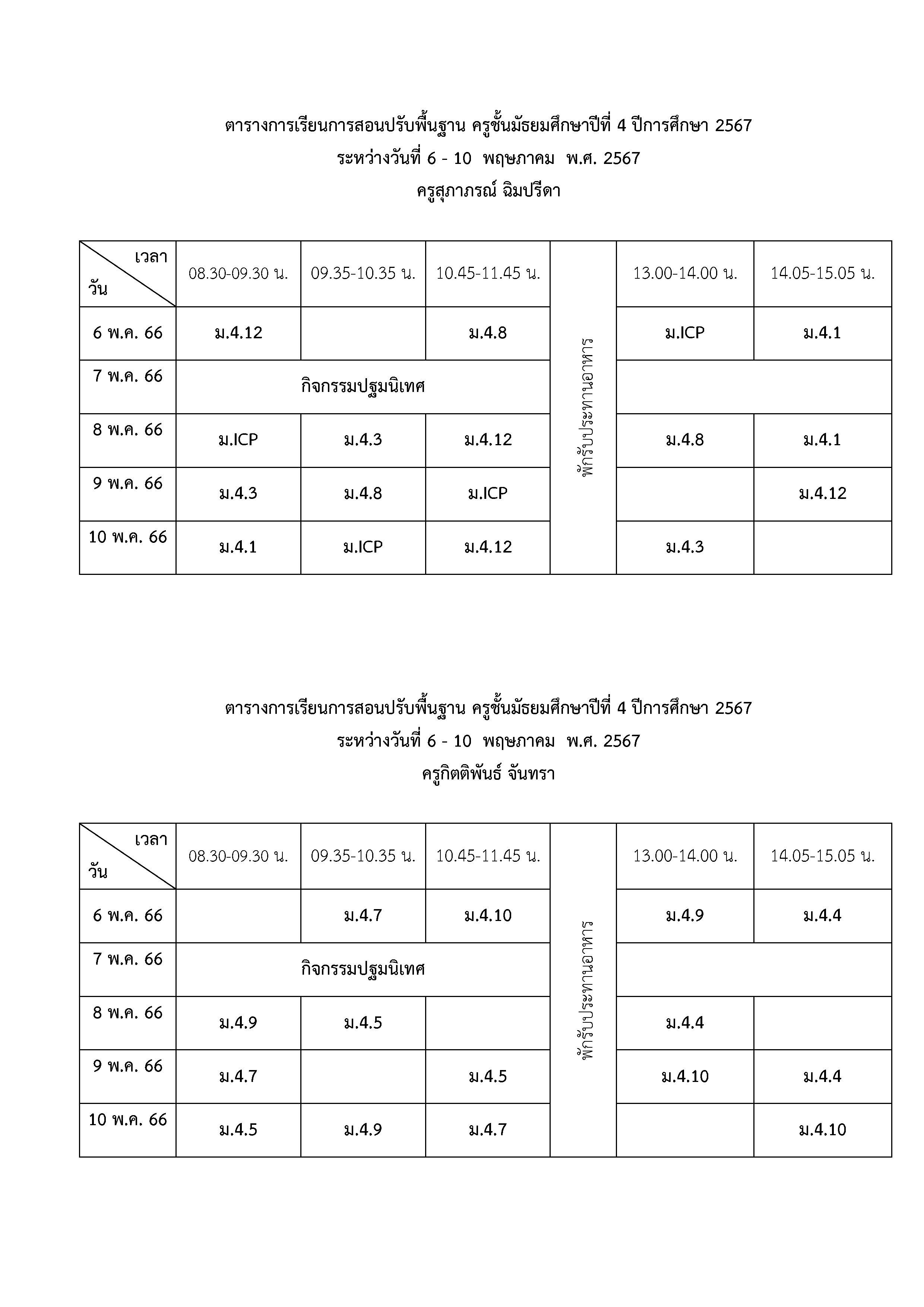 ตารางสอนปรับพื้นฐานของครู ชั้นมัธยมศึกษาปีที่ 4 ปีการศึกษา 2567 ระหว่างวันที่ 6 - 10 พฤษภาคม พ.ศ. 2567