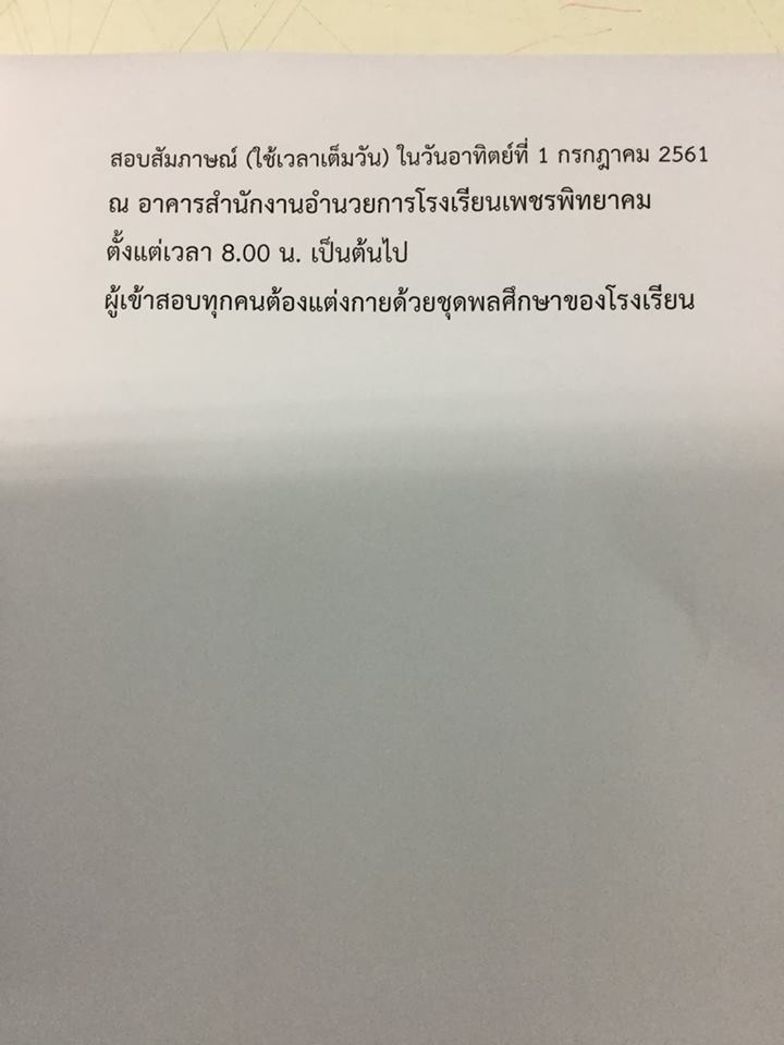 สอบสัมภาษณ์ (ใช้เวลาเต็มวัน) ในวันอาทิตย์ที่ 1 กรกฎาคม 2561 ณ อาคารสำนักงานอำนวยการโรงเรียนเพชรพิทยาคม ตั้งแต่เวลา 08.00 น. เป็นต้นไป ผู้เข้าสอบทุกคนต้องแต่งกายด้วยชุดพลศึกษาของโรงเรียน