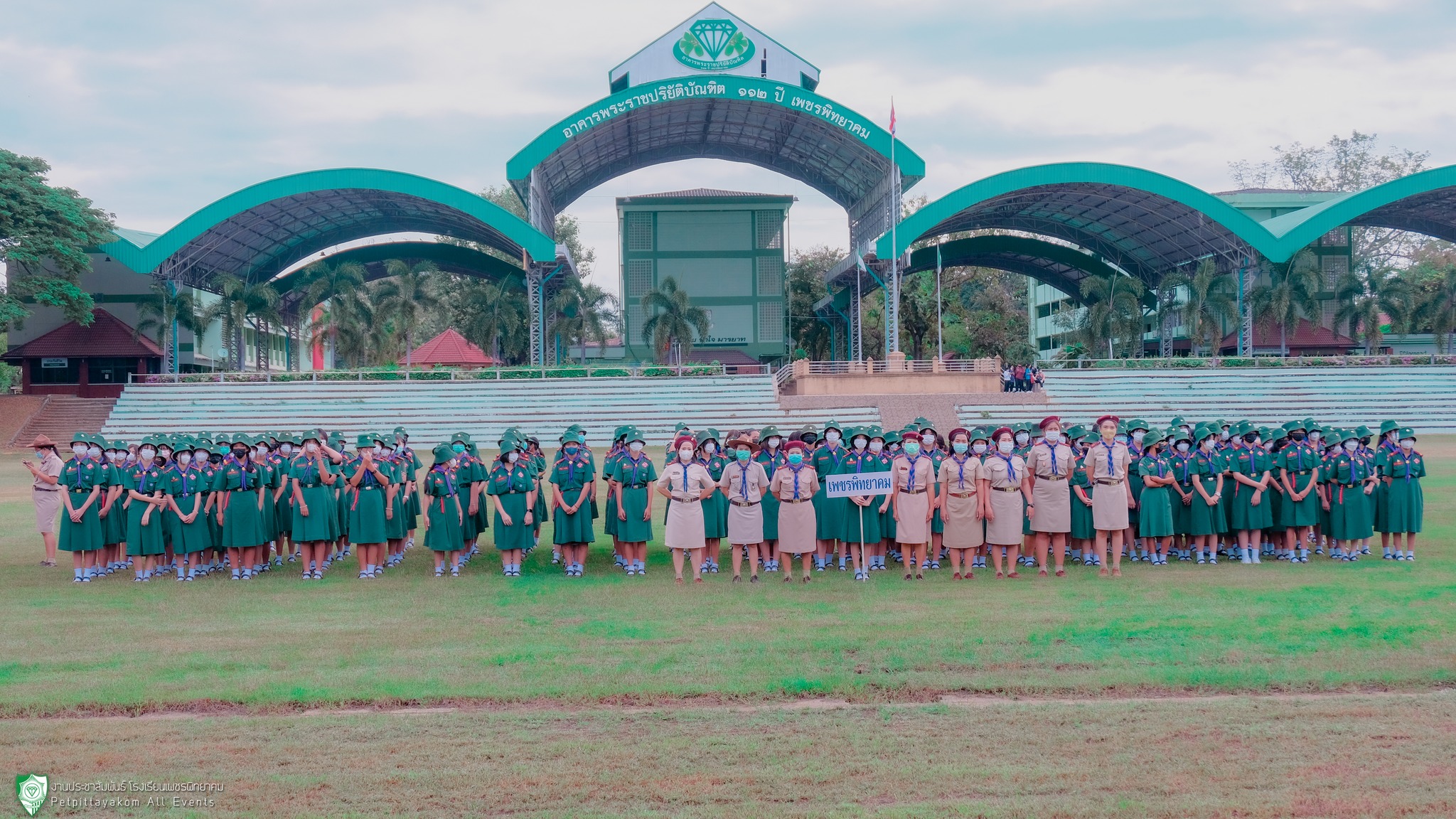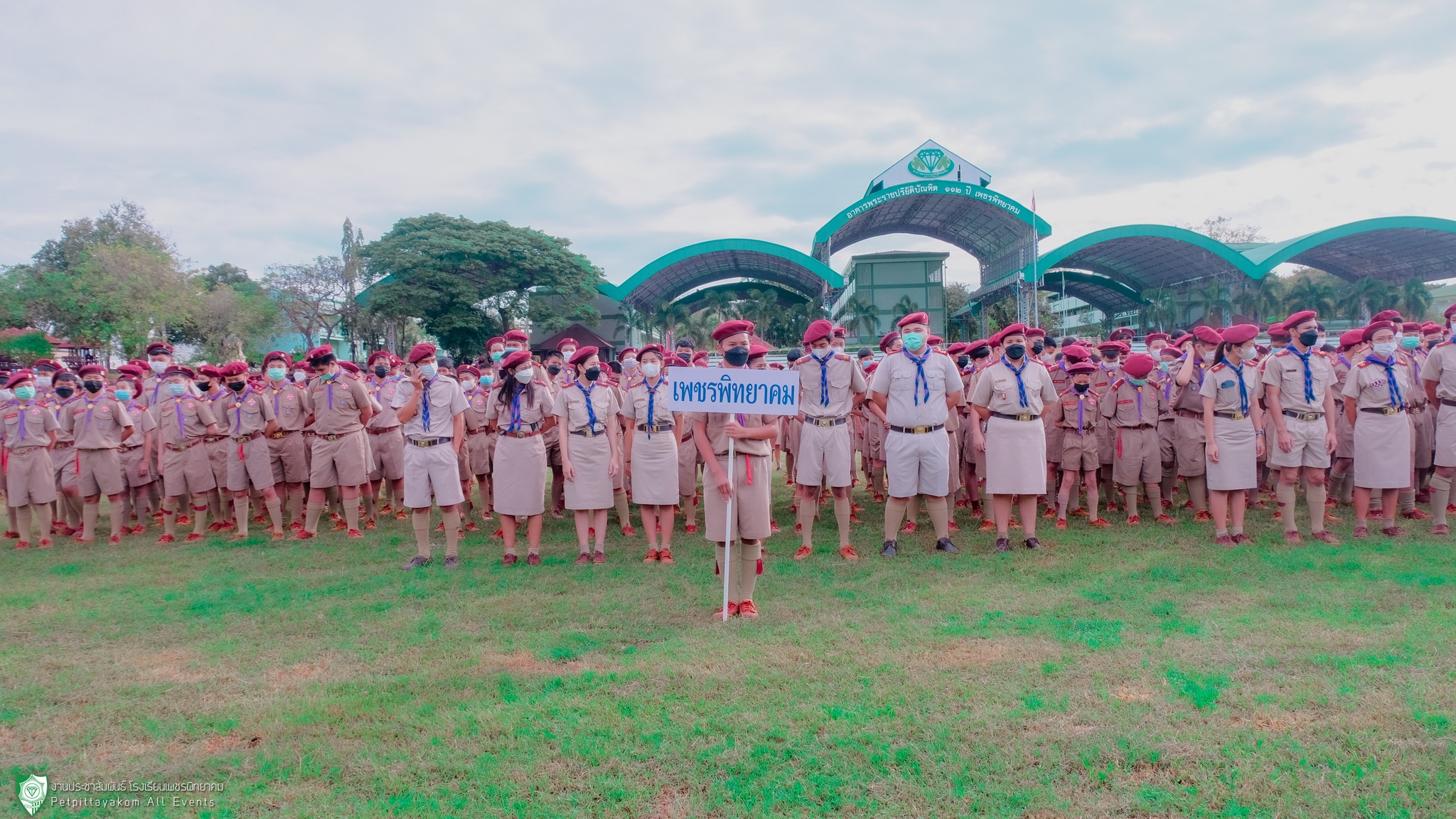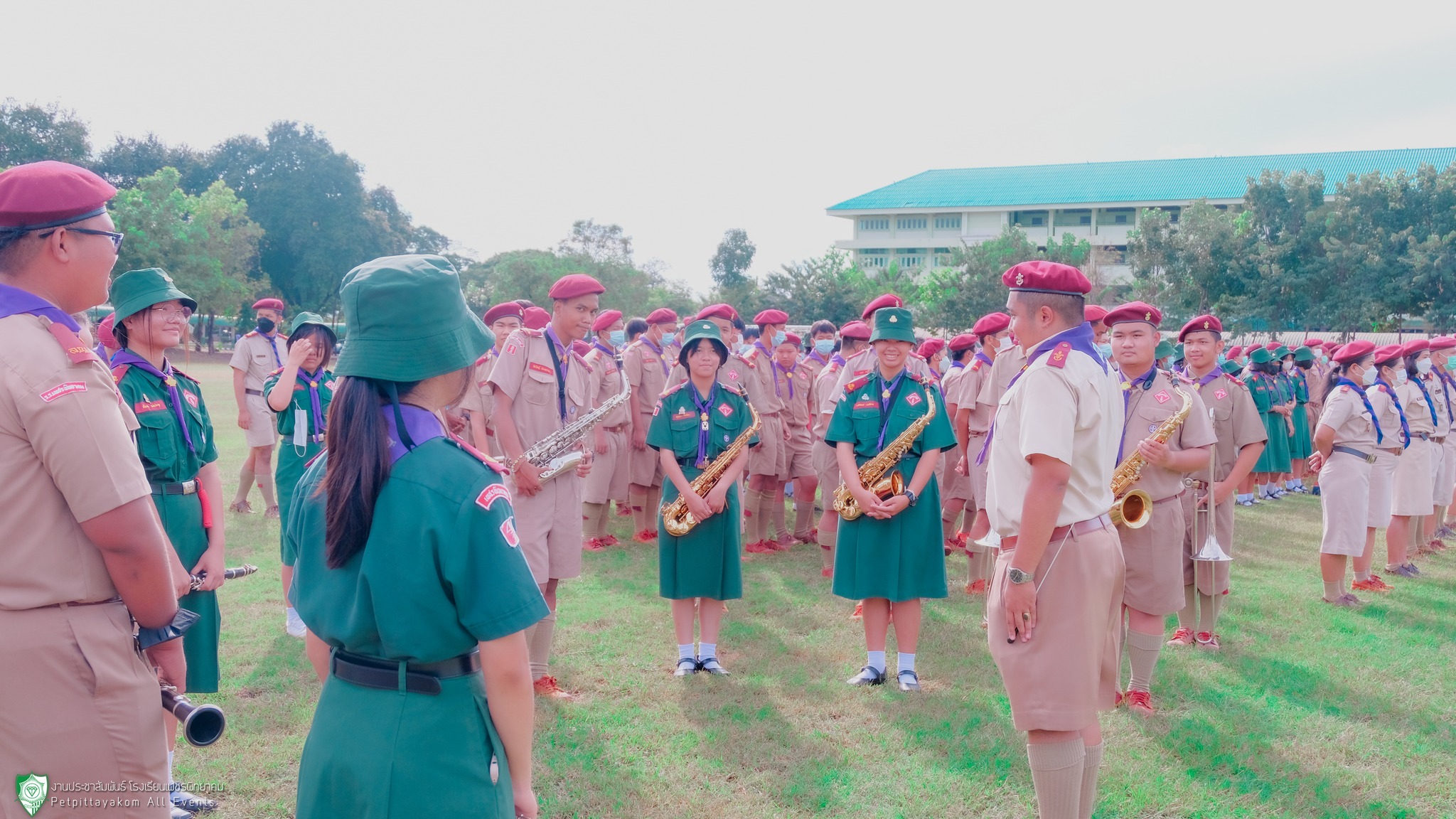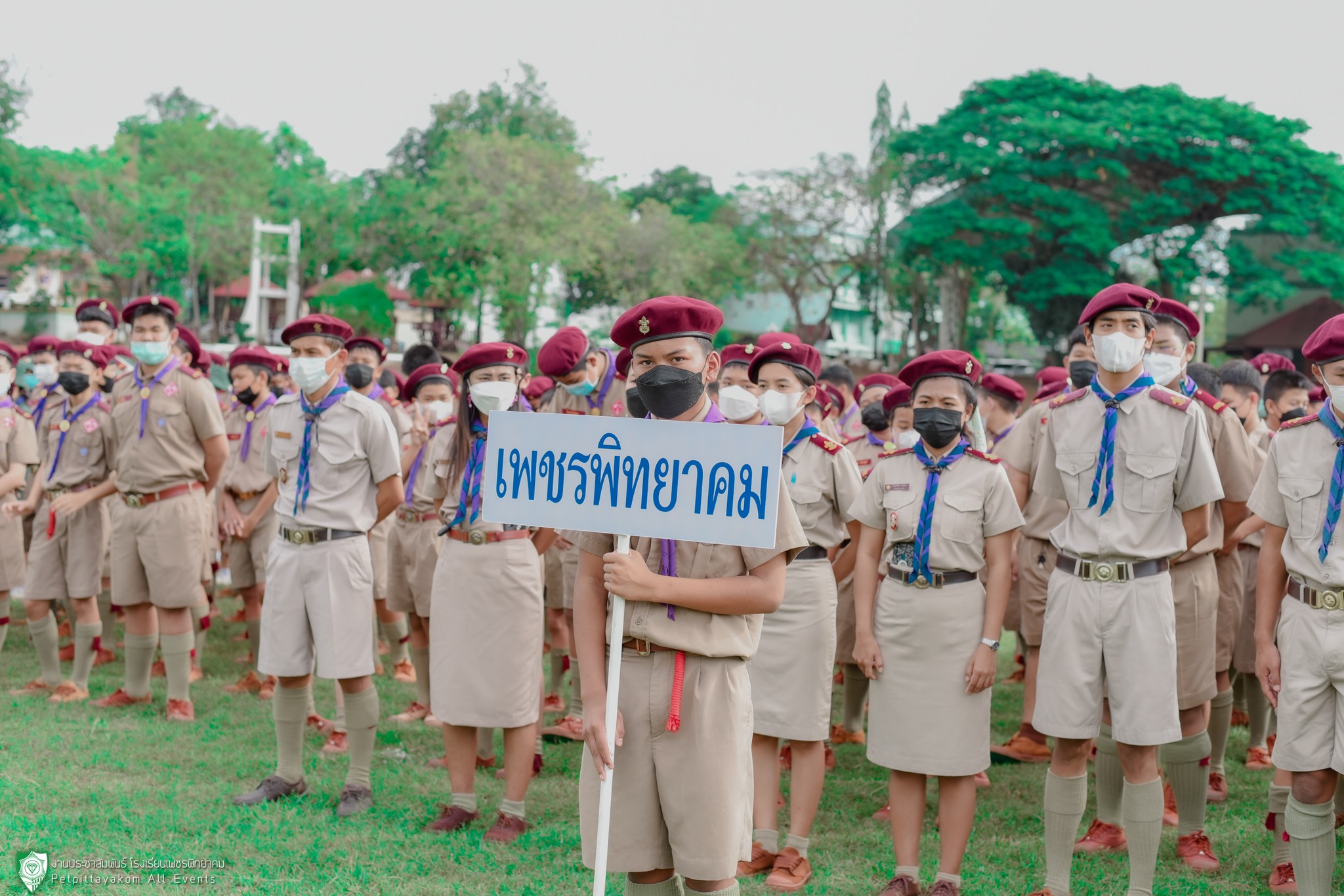 - ลูกเสือ เนตรนารี ผู้บังคับบัญชาและผู้ควบคุมแถว พร้อมกันบริเวณสนามโรงเรียนเพชรพิทยาคม