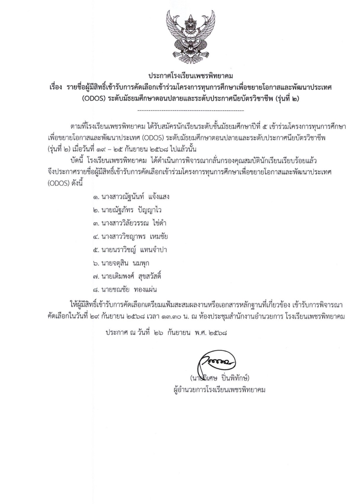 ตามที่โรงเรียนเพชรพิทยาคม ได้รับสมัครนักเรียนระดับขั้นมัธยมศึกษาปีที่ 5 เข้าร่วมโครงการทุนการศึกษา เพื่อขยายโอกาสและพัฒนาประเทศ (ODOS) ระดับมัธยมศึกษาตอนปลายและระดับประกาศนียบัตรวิชาชีพ (รุ่นที่ 2) เมื่อวันที่ 19 - 25 กันยายน 2568 ไปแล้วนั้น