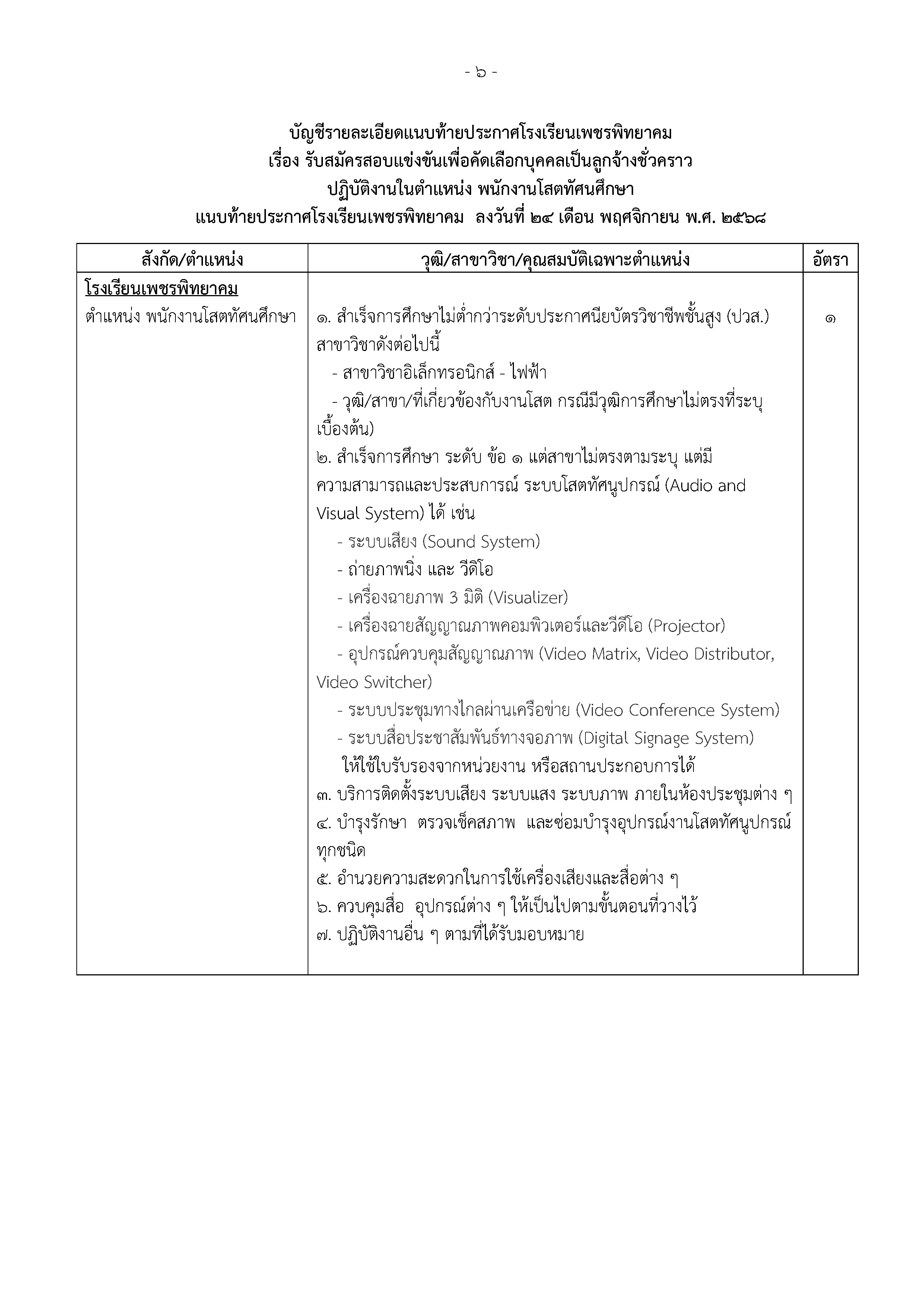 - พนักงานโสตทัศนศึกษา จำนวน 1 อัตรา ค่าตอบแทนเดือนละ 9,300 บาท