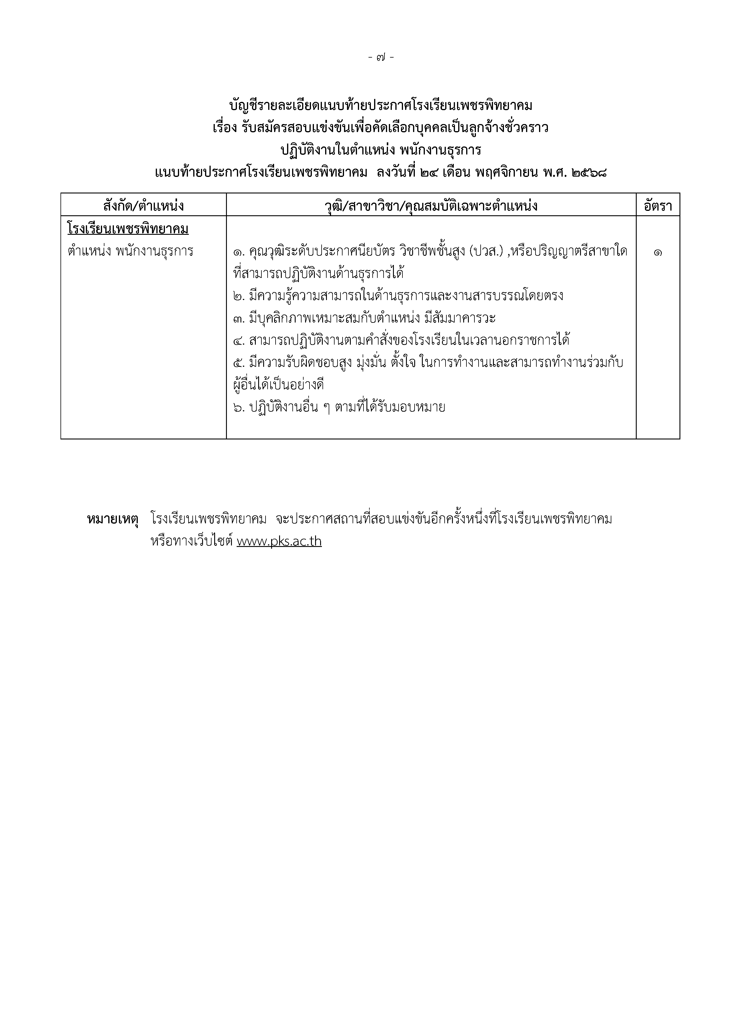 - พนักงานธุรการ จำนวน 1 อัตรา ค่าตอบแทนเดือนละ 9,300 บาท