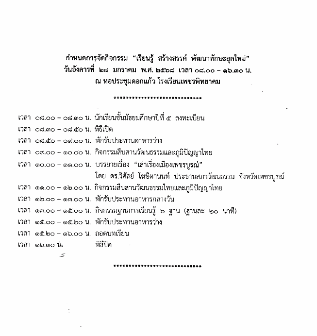 กำหนดจัดกิจกรรมค่ายวิชาการ นักเรียนชั้น มัธยมศึกษาปีที่ 5 "เรียนรู้ สร้างสรรค์ พัฒนาทักษะยุคใหม่" วันอังคารที่ 28 มกราคม 2568 เวลา 08.00 - 16.30 น. ณ หอประชุมดอกแก้ว โรงเรียนเพชรพิทยาคม