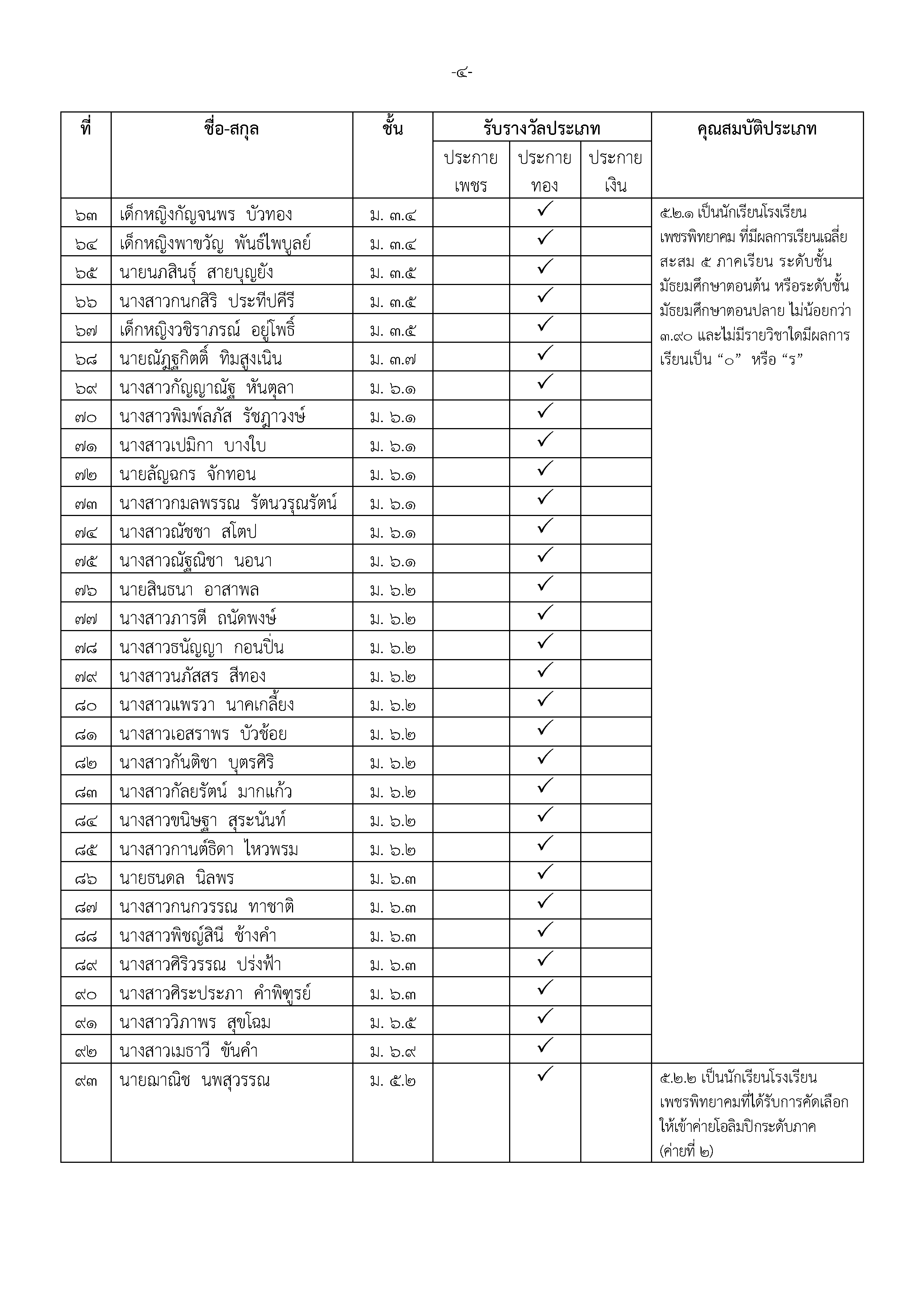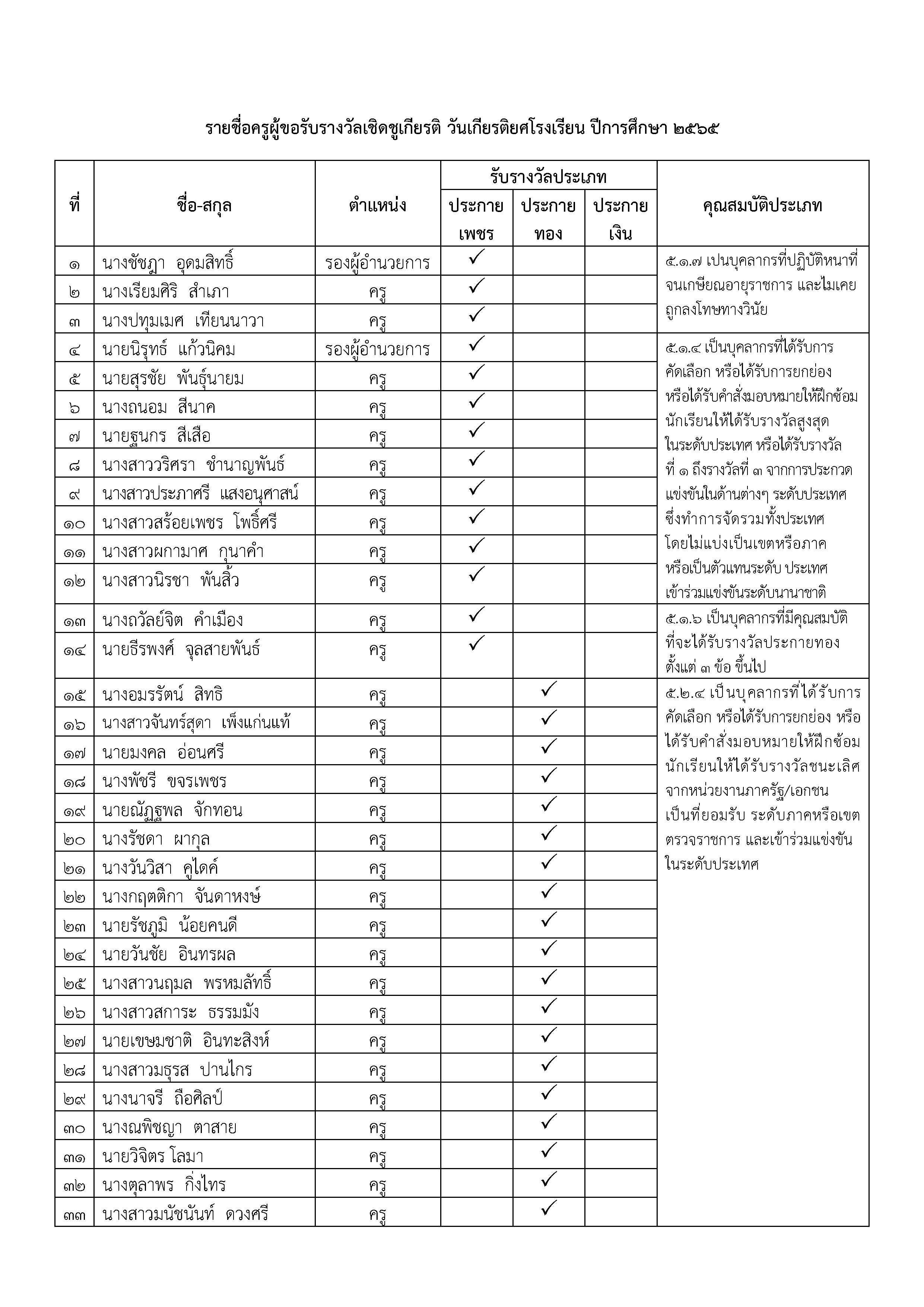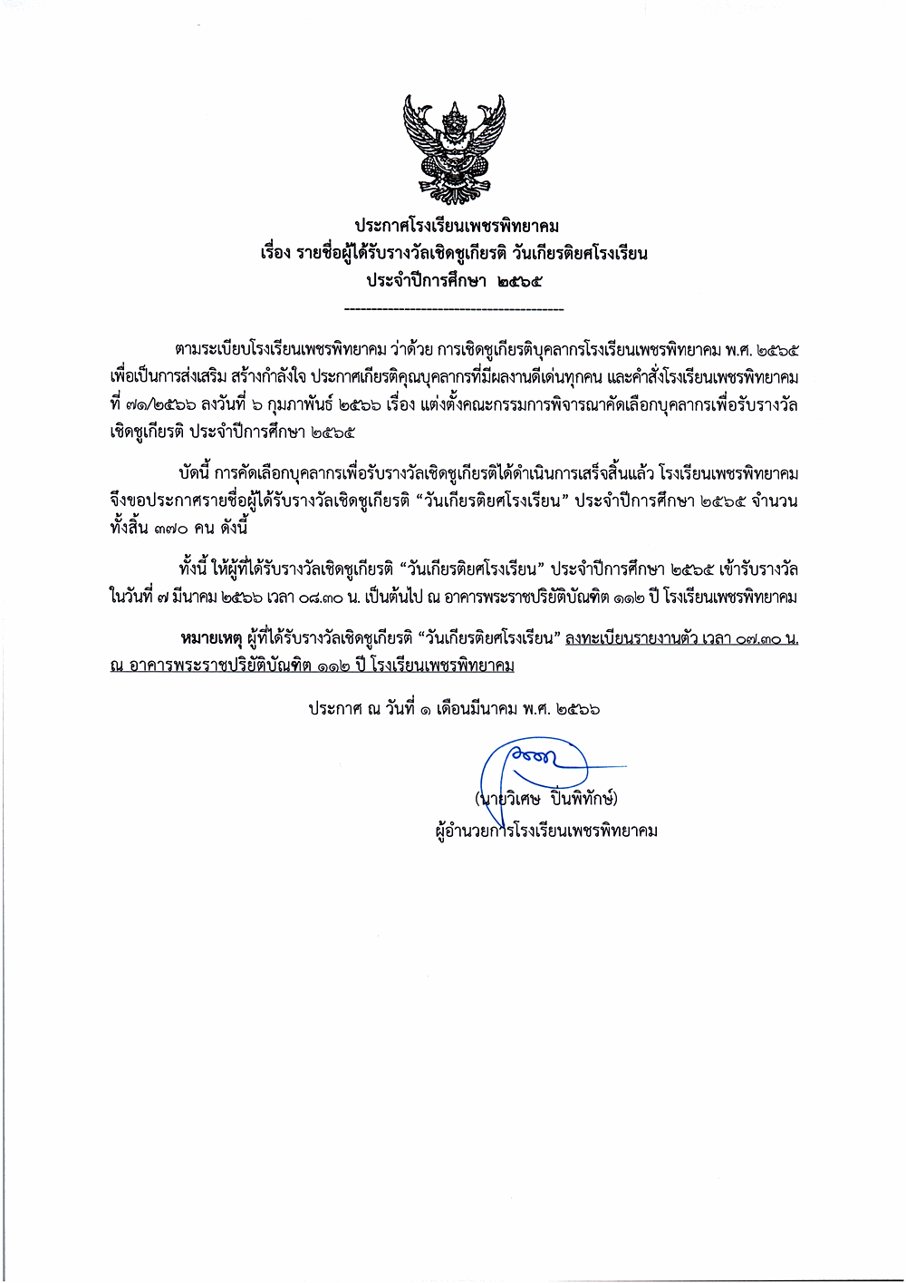 ประกาศโรงเรียนเพชรพิทยาคม เรื่อง รายชื่อผู้ได้รับรางวัลเชิดชูเกียรติ วันเกียรติยศโรงเรียน ประจำปีการศึกษา 2565