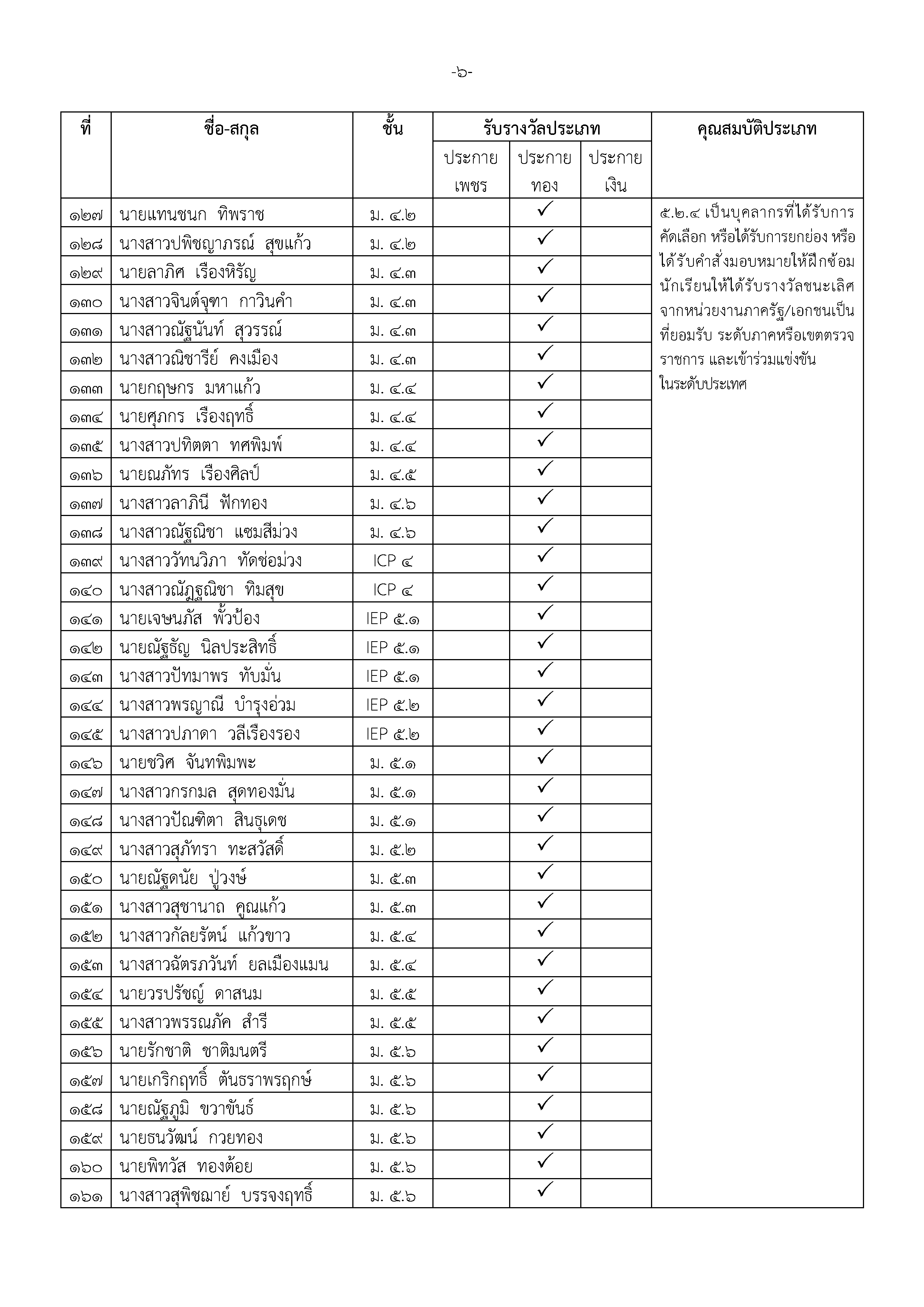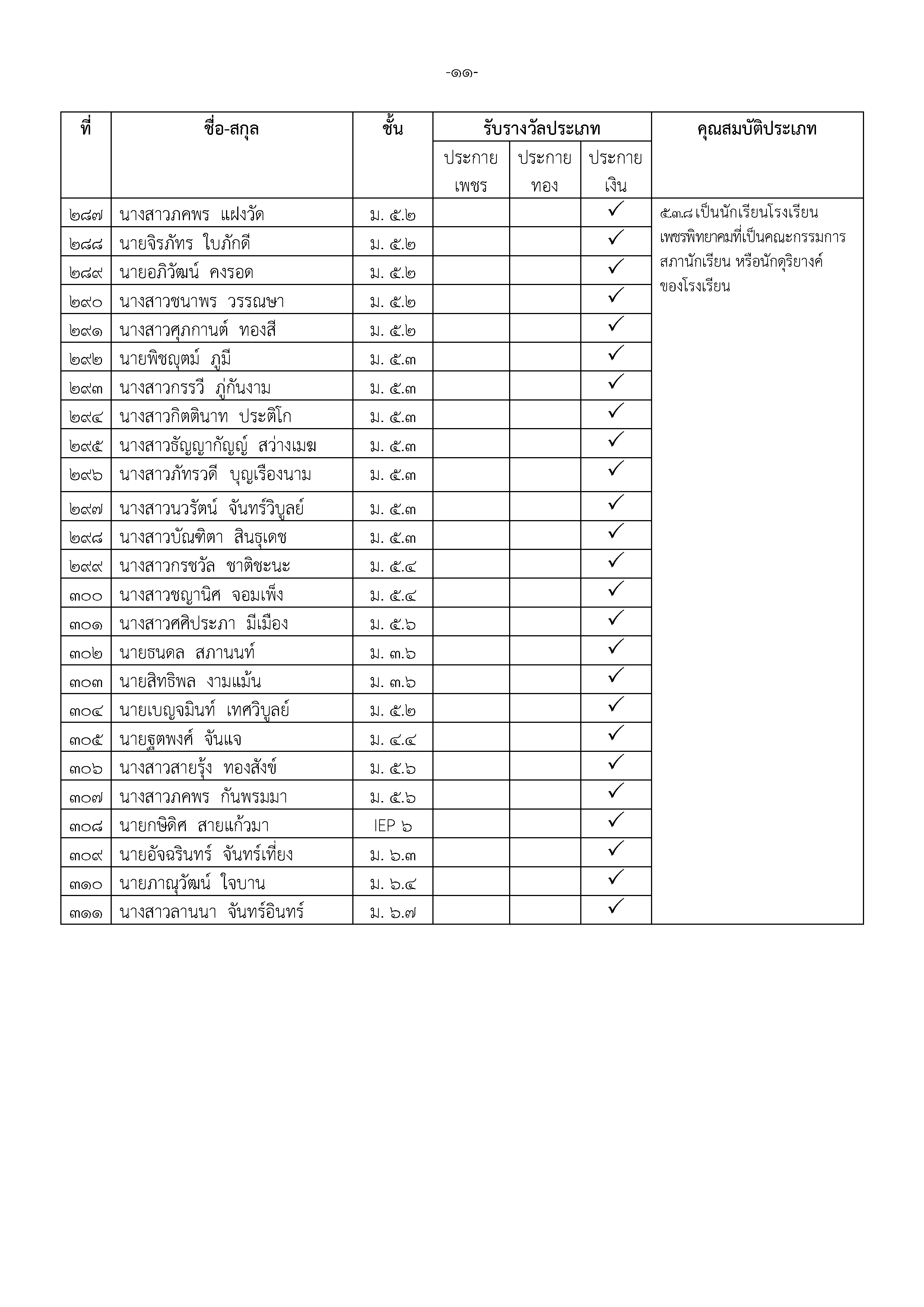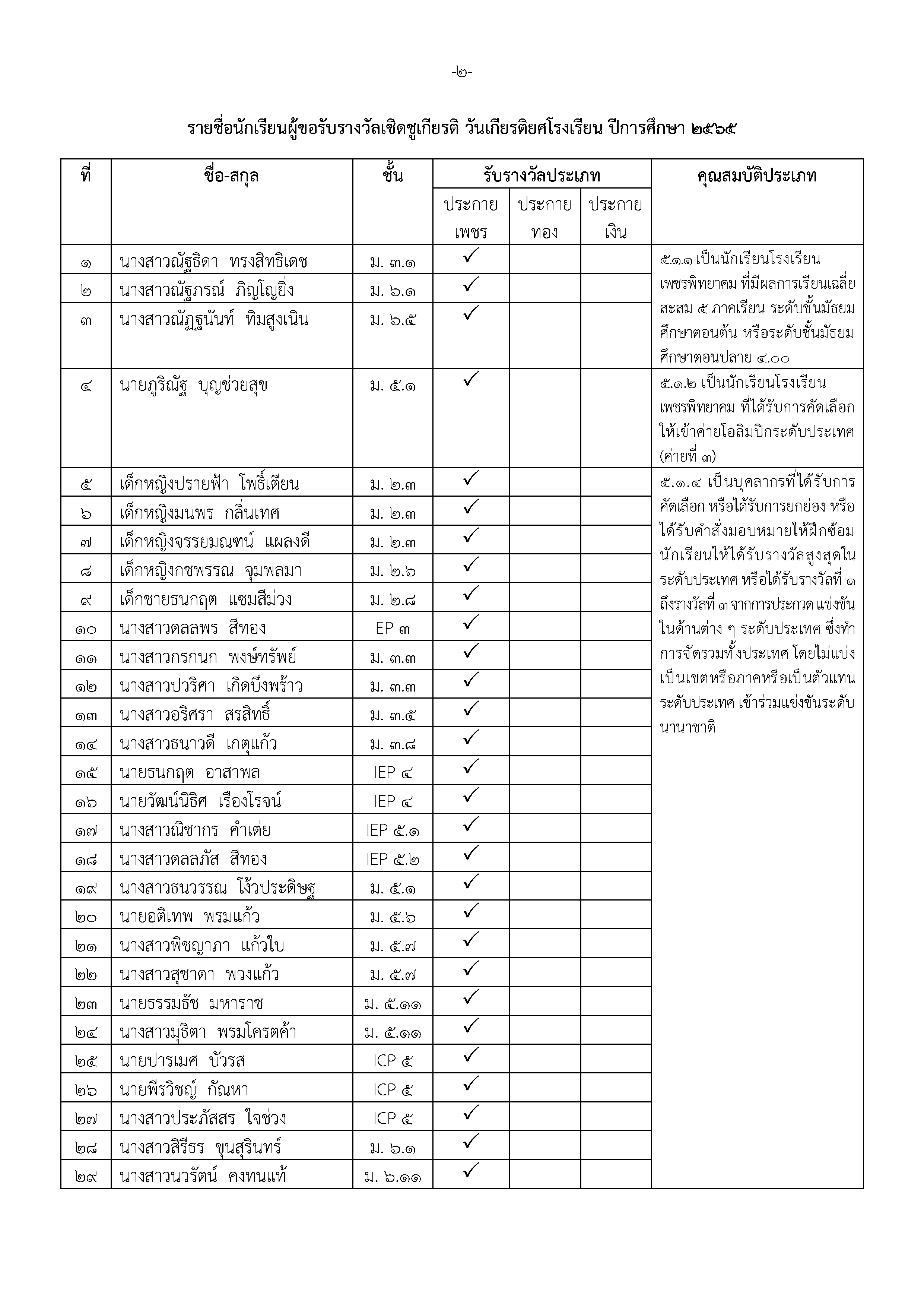 เรื่อง รายชื่อผู้ได้รับรางวัลเชิดชูเกียรติ วันเกียรติยศโรงเรียน