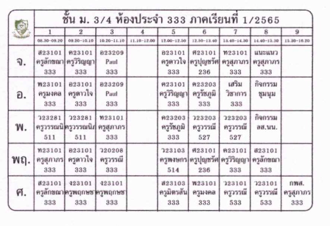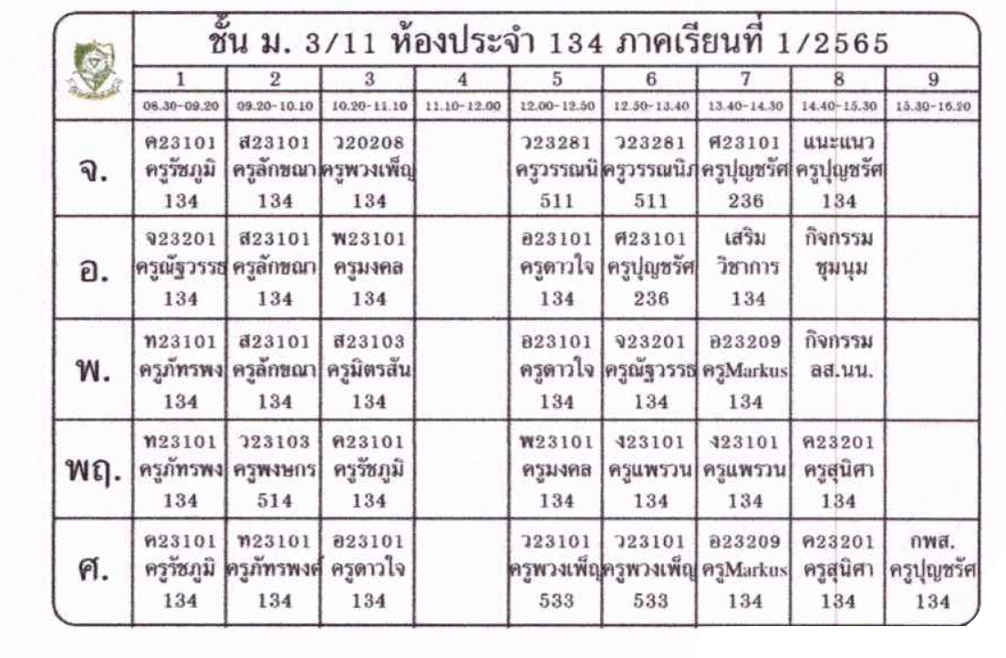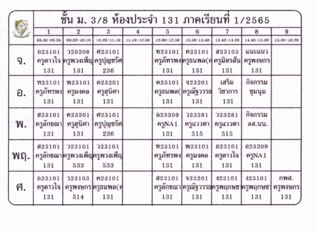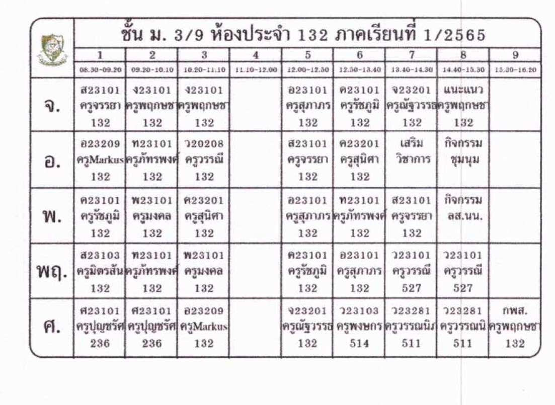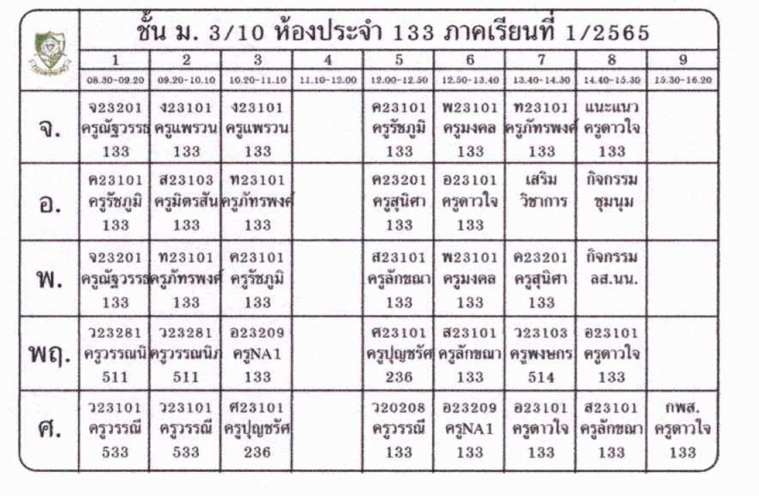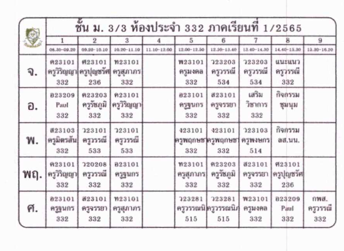ตารางเรียนนักเรียน ชั้น ม.3 ภาคเรียนที่ 1 ปีการศึกษา 2565
