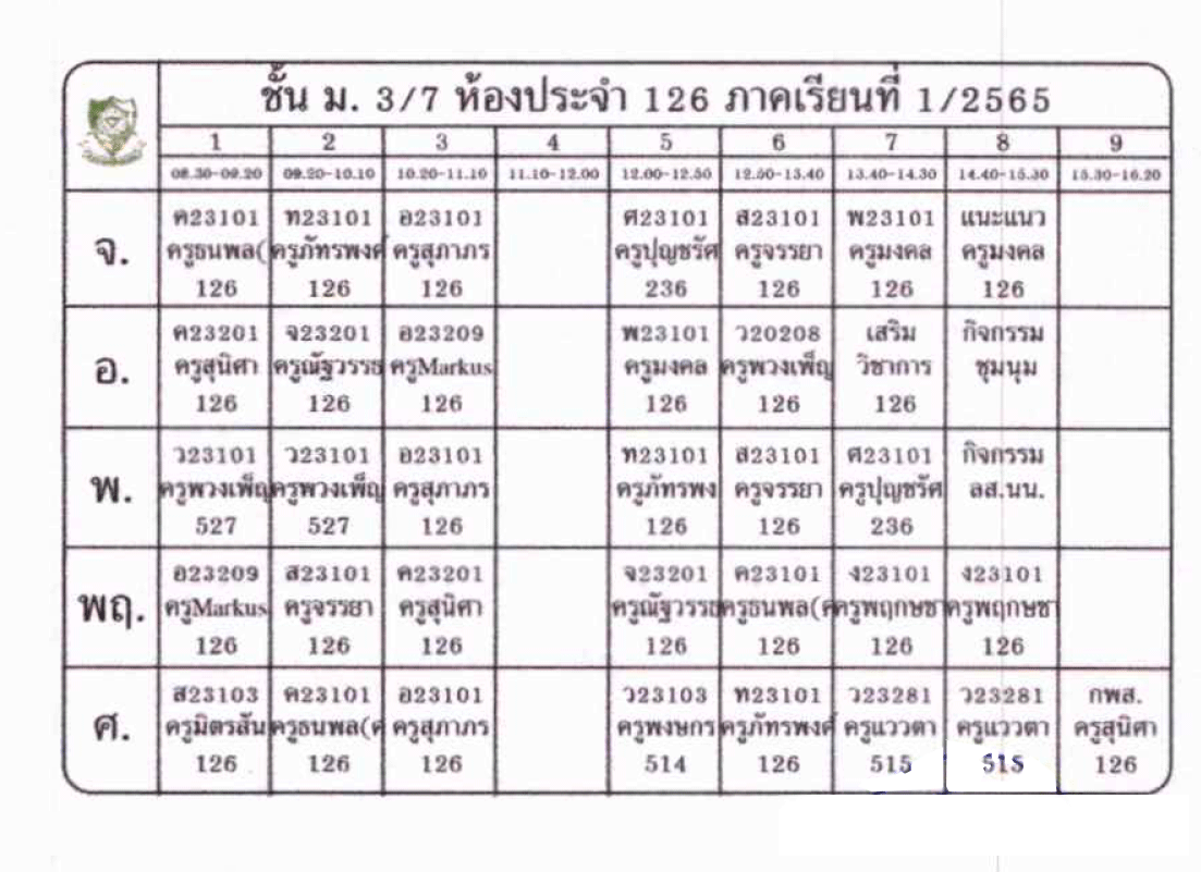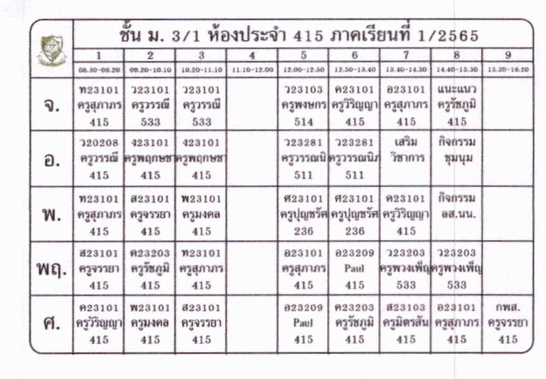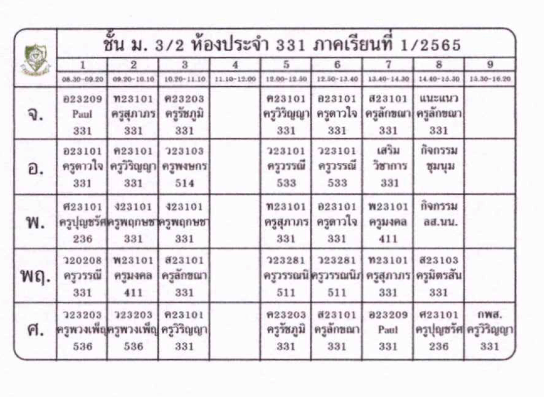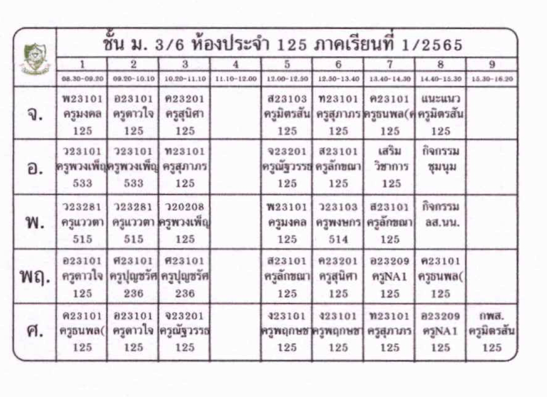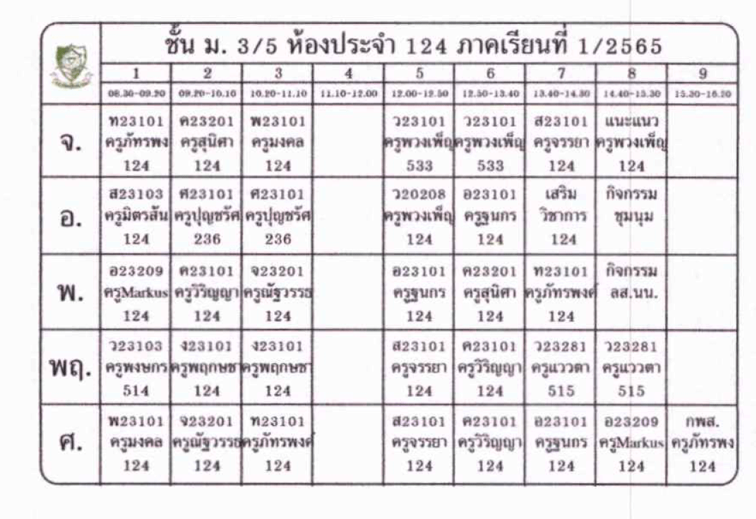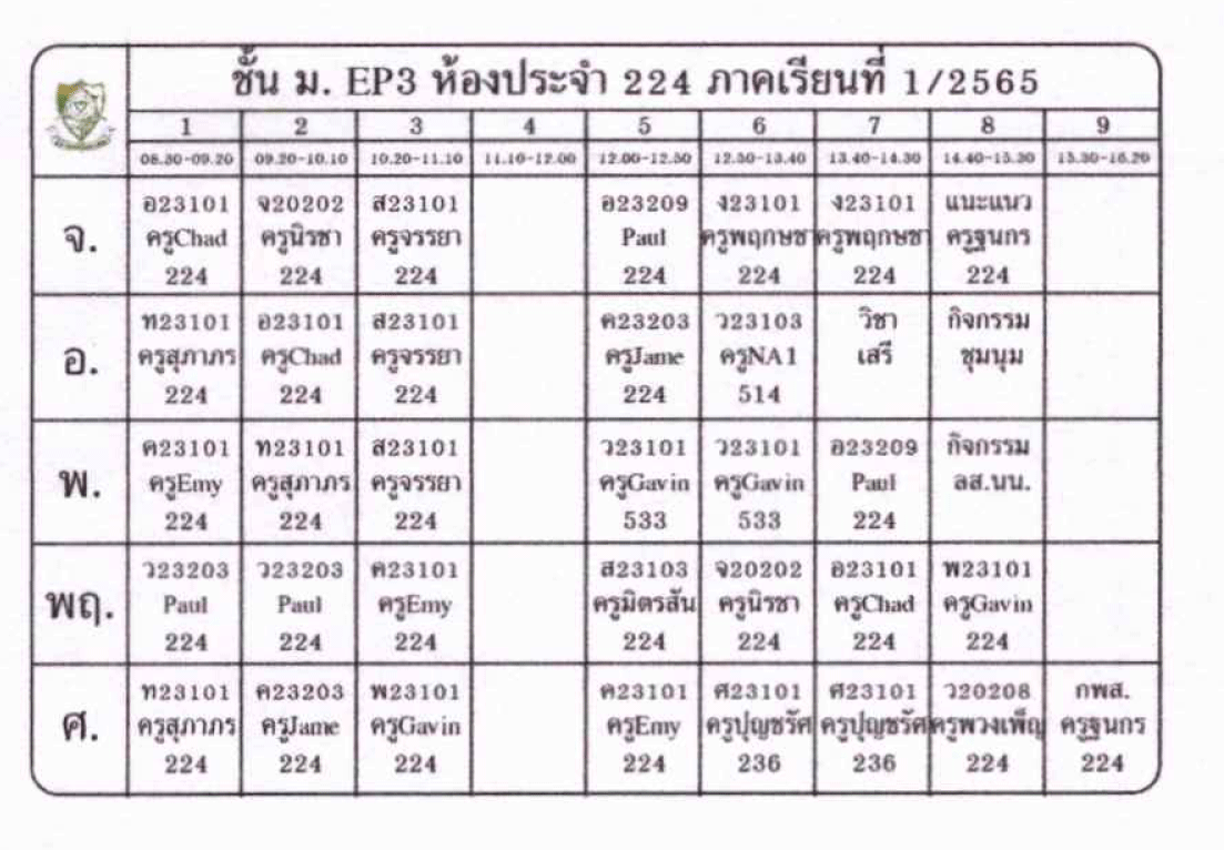 ตารางเรียนนักเรียน ชั้น ม.3 ภาคเรียนที่ 1 ปีการศึกษา 2565