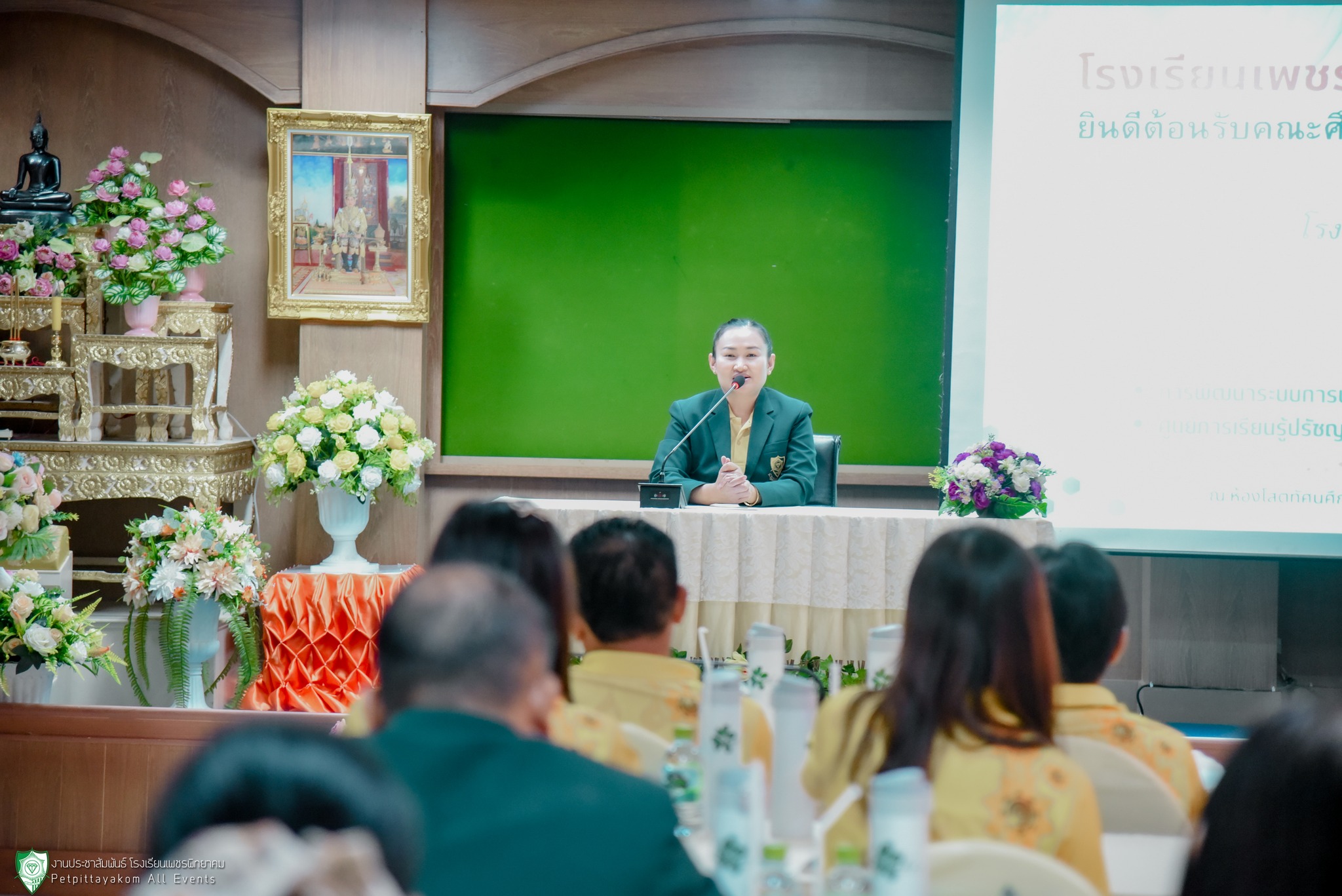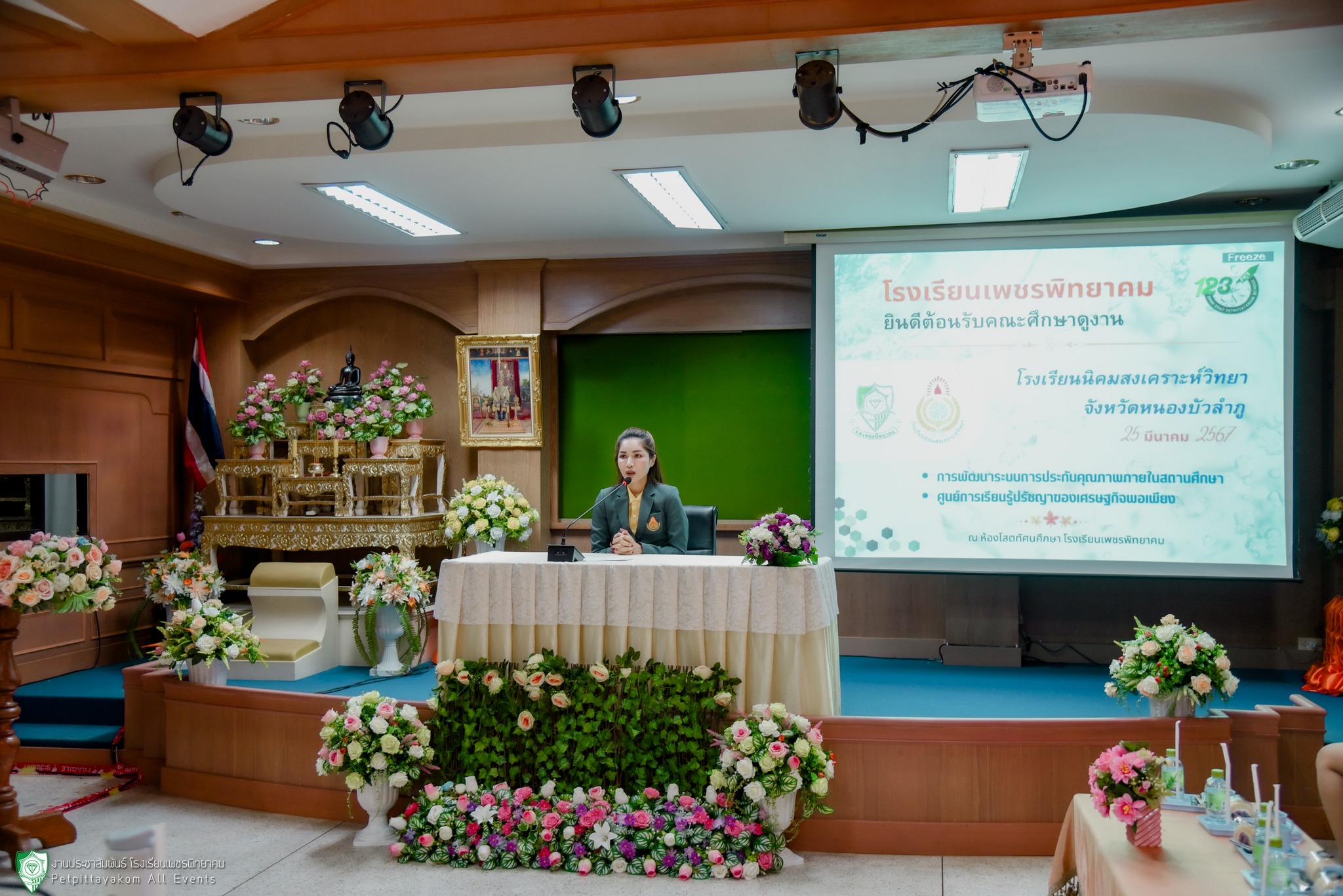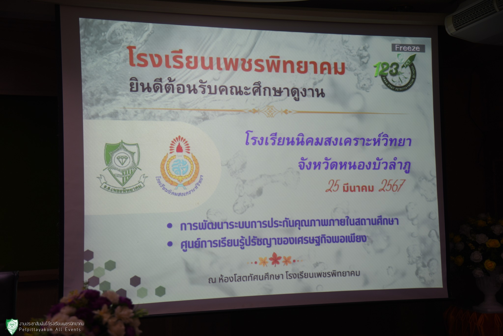 โรงเรียนเพชรพิทยาคม นำโดยนางสาวบุหรัน ขวัญพรม รองผู้อำนวยการโรงเรียนเพชรพิทยาคม พร้อมด้วยฝ่ายบริหาร และคณะครูร่วมต้อนรับคณะศึกษาดูงาน แลกเปลี่ยนเรียนรู้ด้านการบริหารงานวิชาการ งานประกันคุณภาพทางการศึกษา และศูนย์การเรียนตามหลักปรัชญาของเศรษฐกิจพอเพียง ด้านการศึกษา กับคณะศึกษาดูงานโรงเรียนนิยมสงเคราะห์วิทยานำโดย ผอ.ปริญญา ถุนพุฒดม ผู้อำนวยการโรงเรียนนิยมสงเคราะห์วิทยา จังหวัดหนองบัวลำภู พร้อมด้วยคณะครูเข้าร่วมกิจกรรม เมื่อวันที่ 25 มีนาคม 2567 ณ ห้องโสตทัศนศึกษา โรงเรียนเพชรพิทยาคม