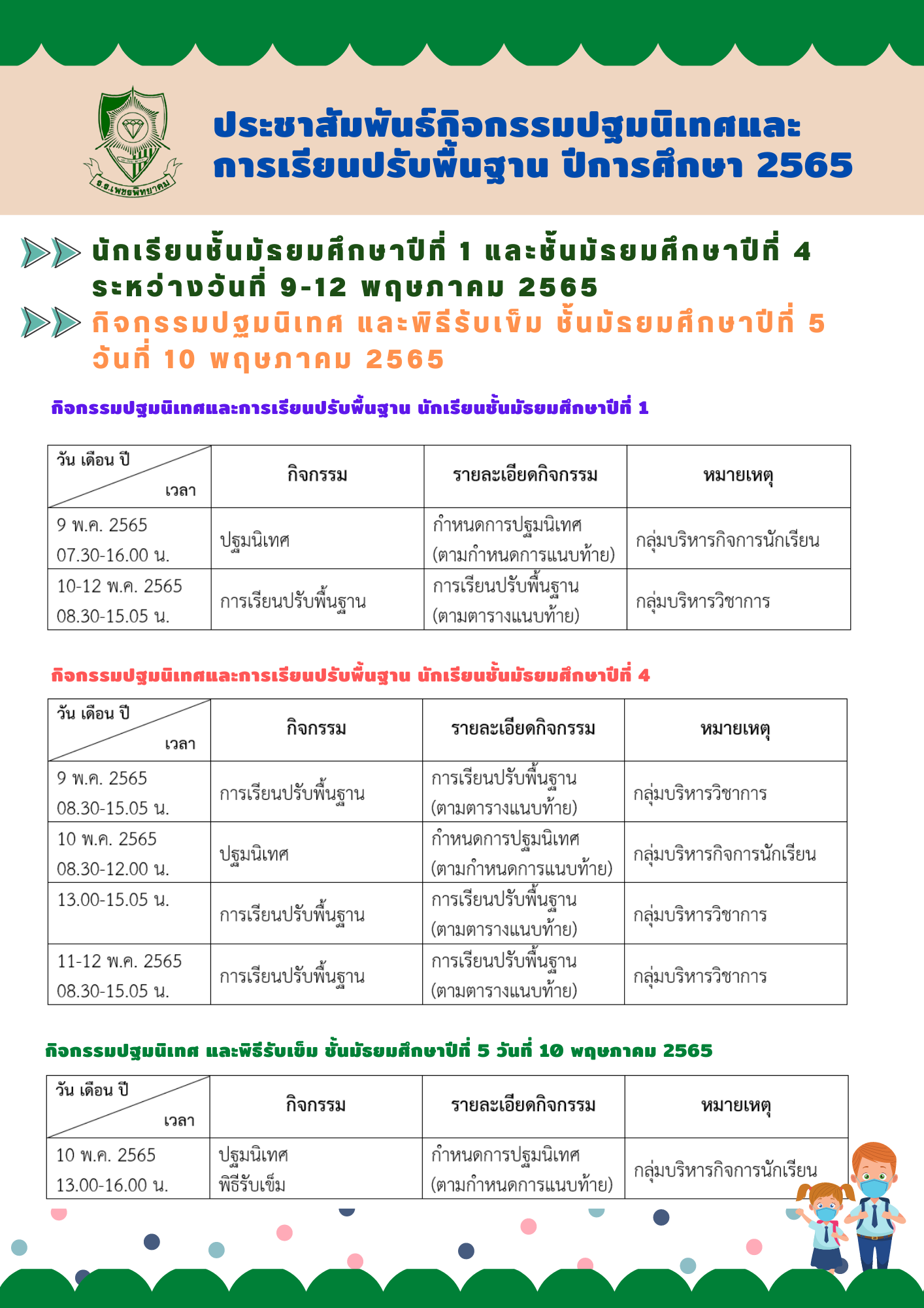กิจกรรมปฐมนิเทศ และพิธีรับเข็ม ชั้นมัธยมศึกษาปีที่ 5 เอกสารแนบ :: กำหนดการปฐมนิเทศนักเรียน เอกสารแนบ : ตารางเรียนปรับพื้นฐาน ม.1 เอกสารแนบ : ตารางเรียนปรับพื้นฐาน ม.4