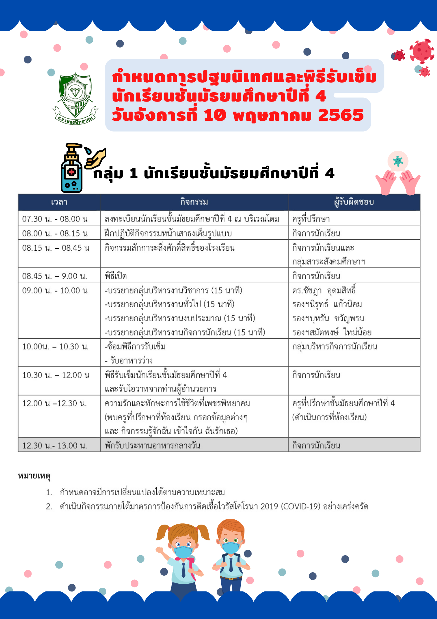 กำหนดการปฐมนิเทศและพิธีรับเข็มนักเรียนชั้นมัธยมศึกษาปีที่ 4 วันอังคารที่ 10 พฤษภาคม 2565 กลุ่ม 1 นักเรียนชั้นมัธยมศึกษาปีที่ 4 ปีการศึกษา 2565
