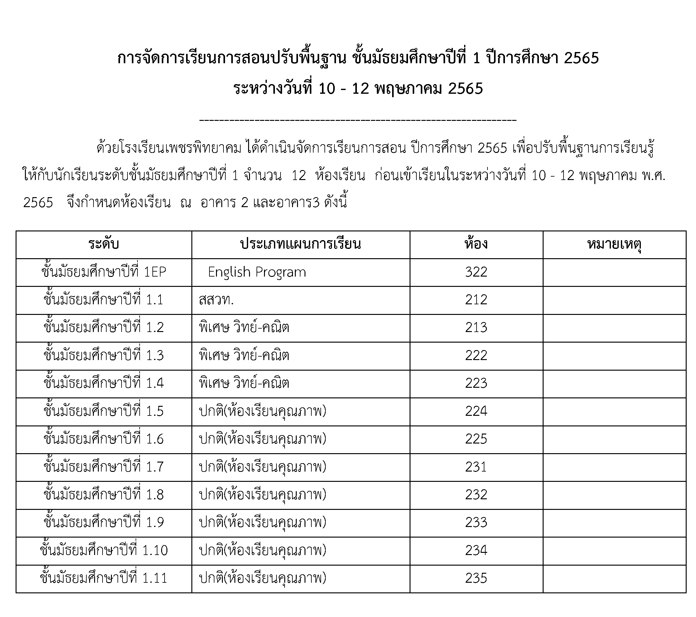 ด้วยโรงเรียนเพชรพิทยาคม ได้ดำเนินจัดการเรียนการสอน ปีการศึกษา 2565 เพื่อปรับพื้นฐานการเรียนรู้ ให้กับนักเรียนระดับชั้นมัธยมศึกษาปีที่ 1 จำนวน 12 ห้องเรียน ก่อนเข้าเรียนในระหว่างวันที่ 10 - 12 พฤษภาคม พ.ศ.2565 จึงกำหนดห้องเรียน ณ อาคาร 2 และอาคาร 3 ดังนี้