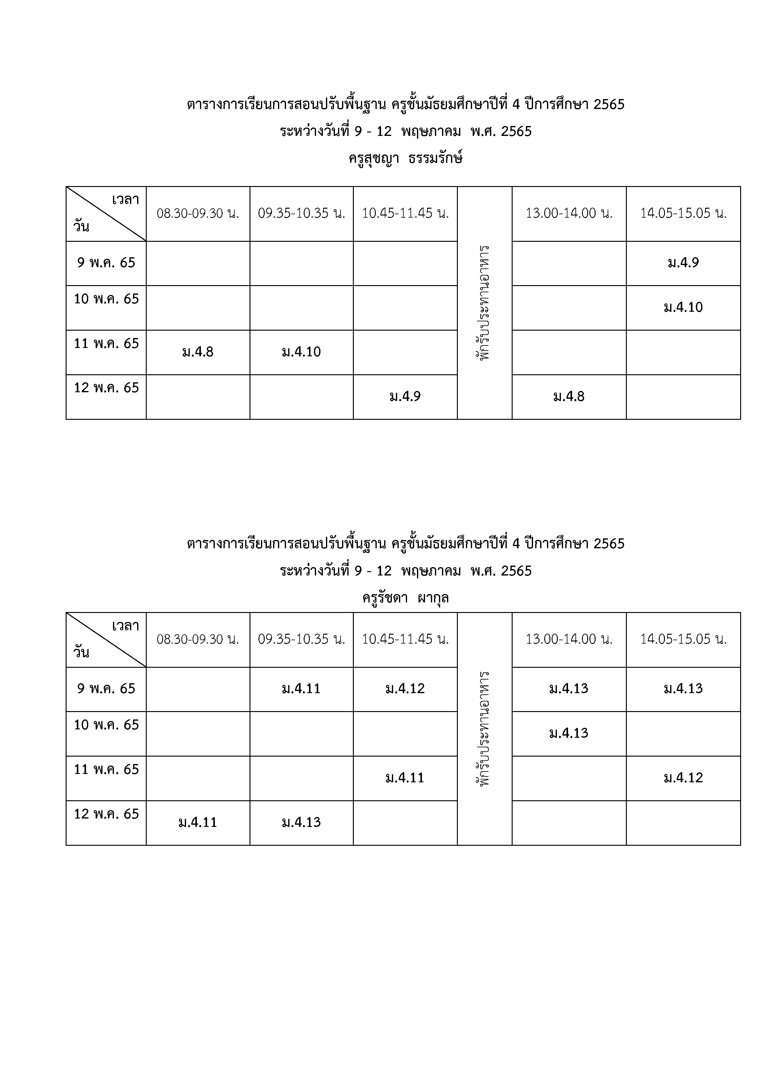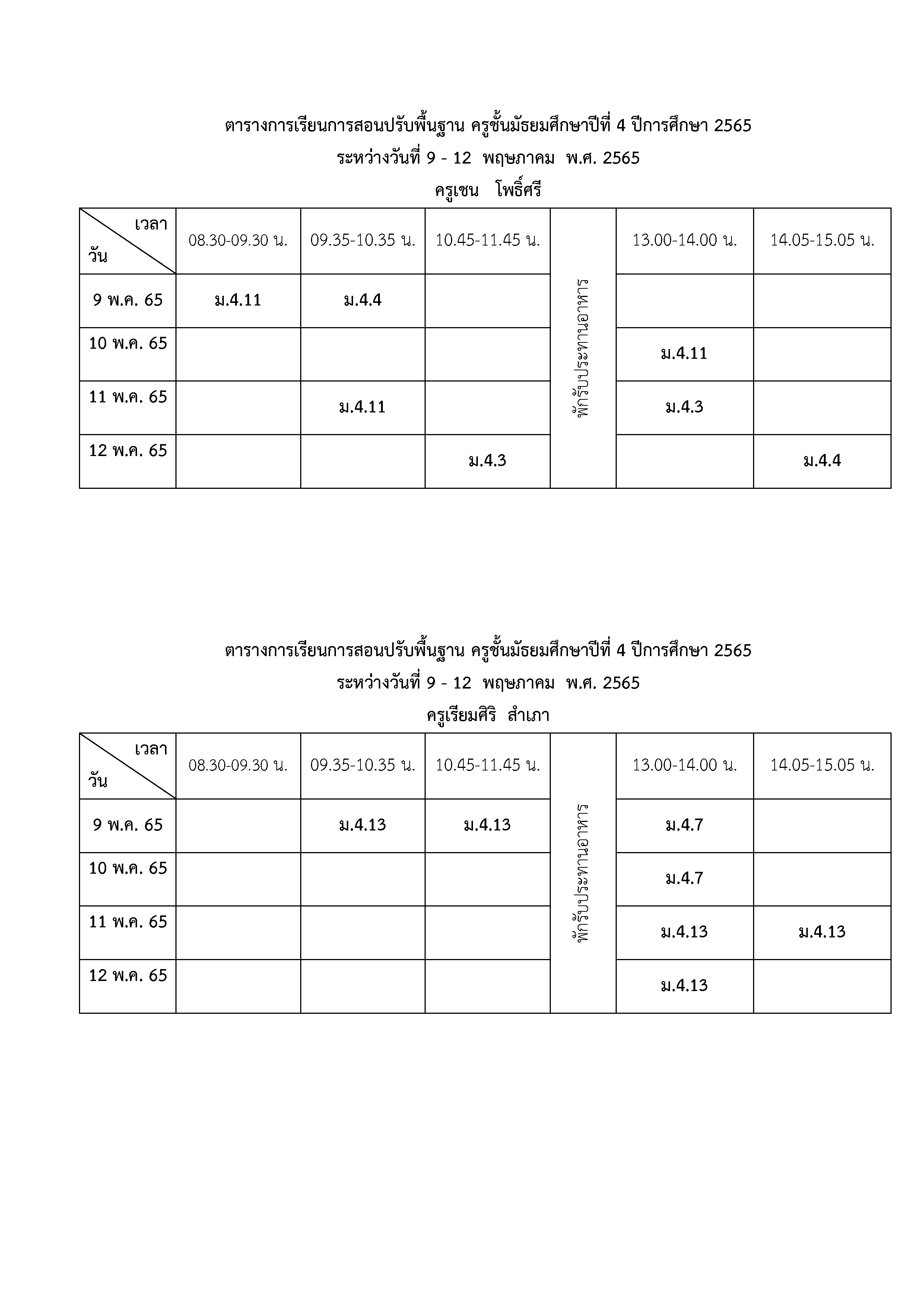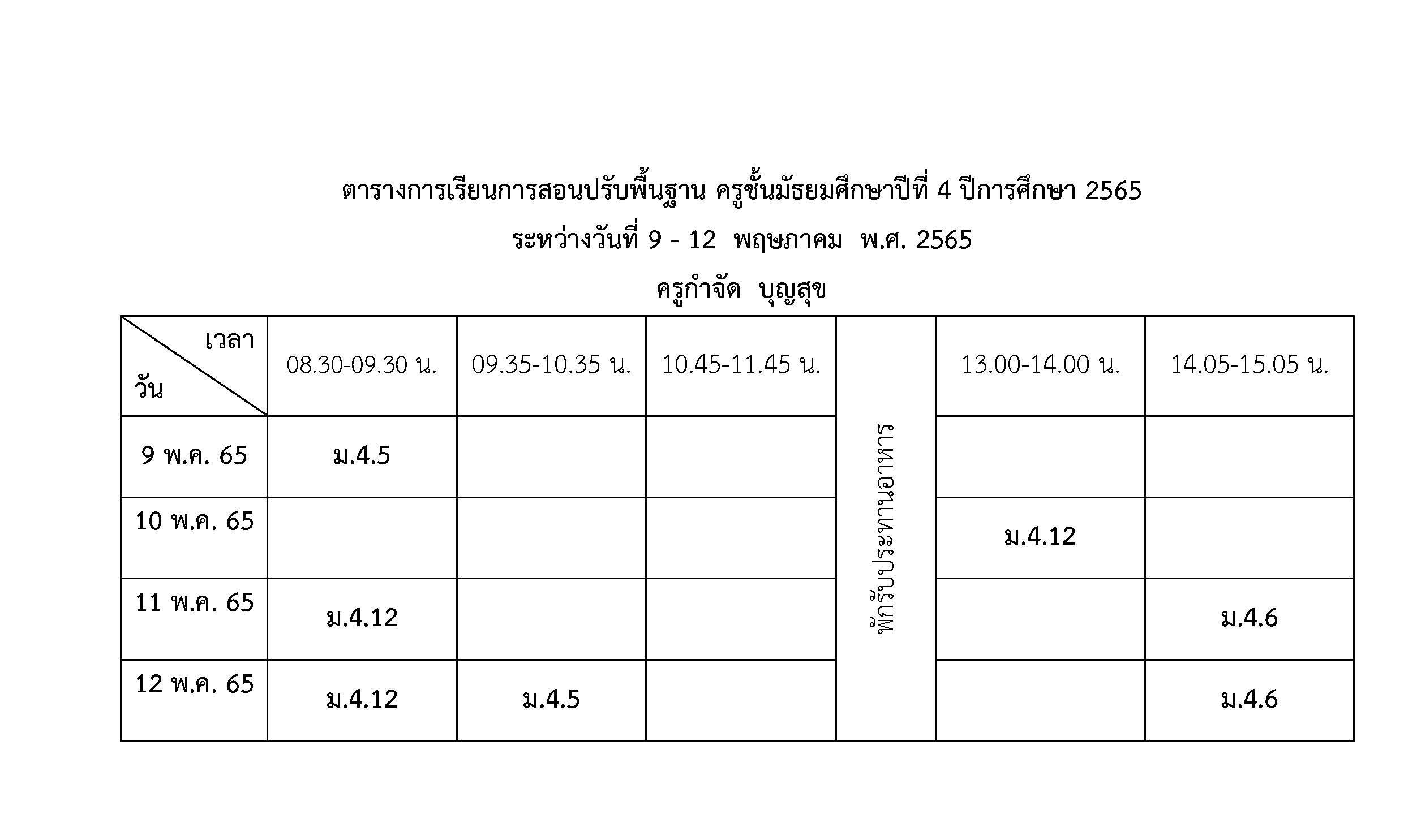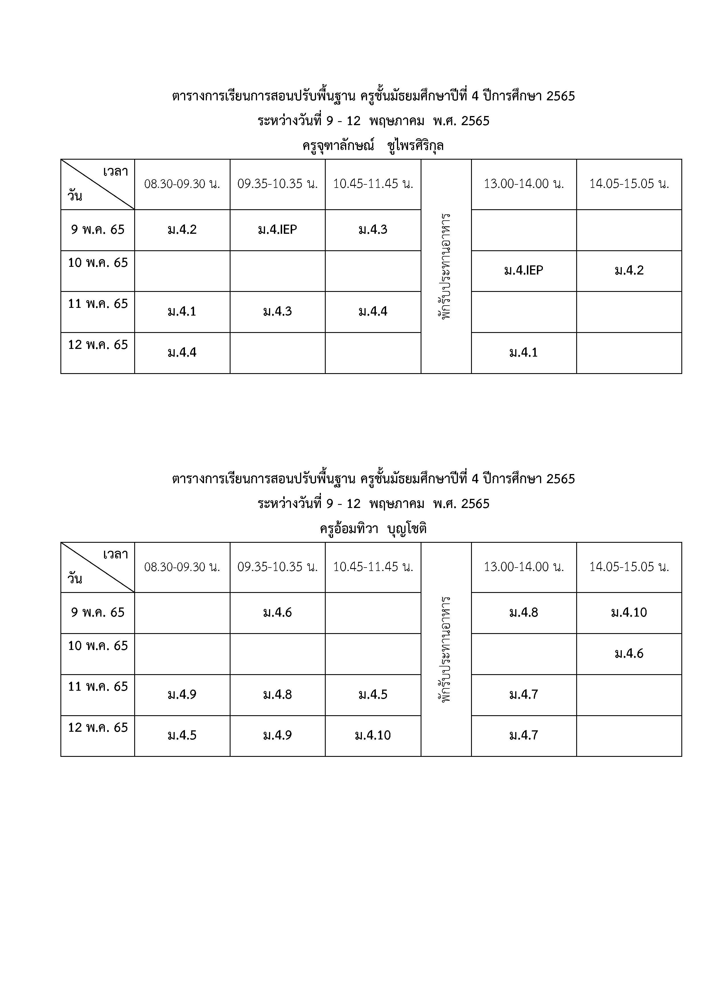 ตารางการเรียนการสอนปรับพื้นฐาน ครูชั้นมัธยมศึกษาปีที่ 4 ปีการศึกษา 2565