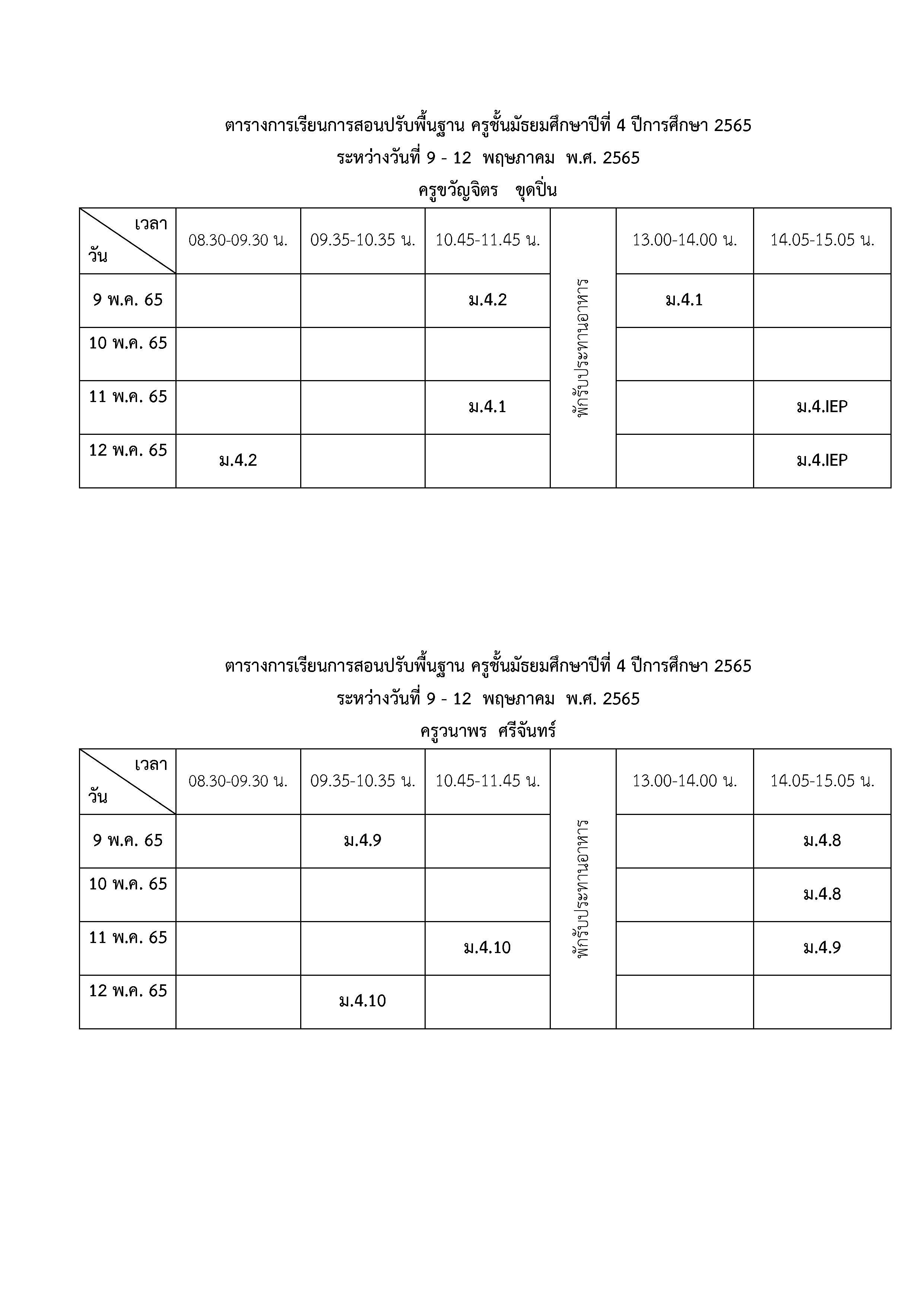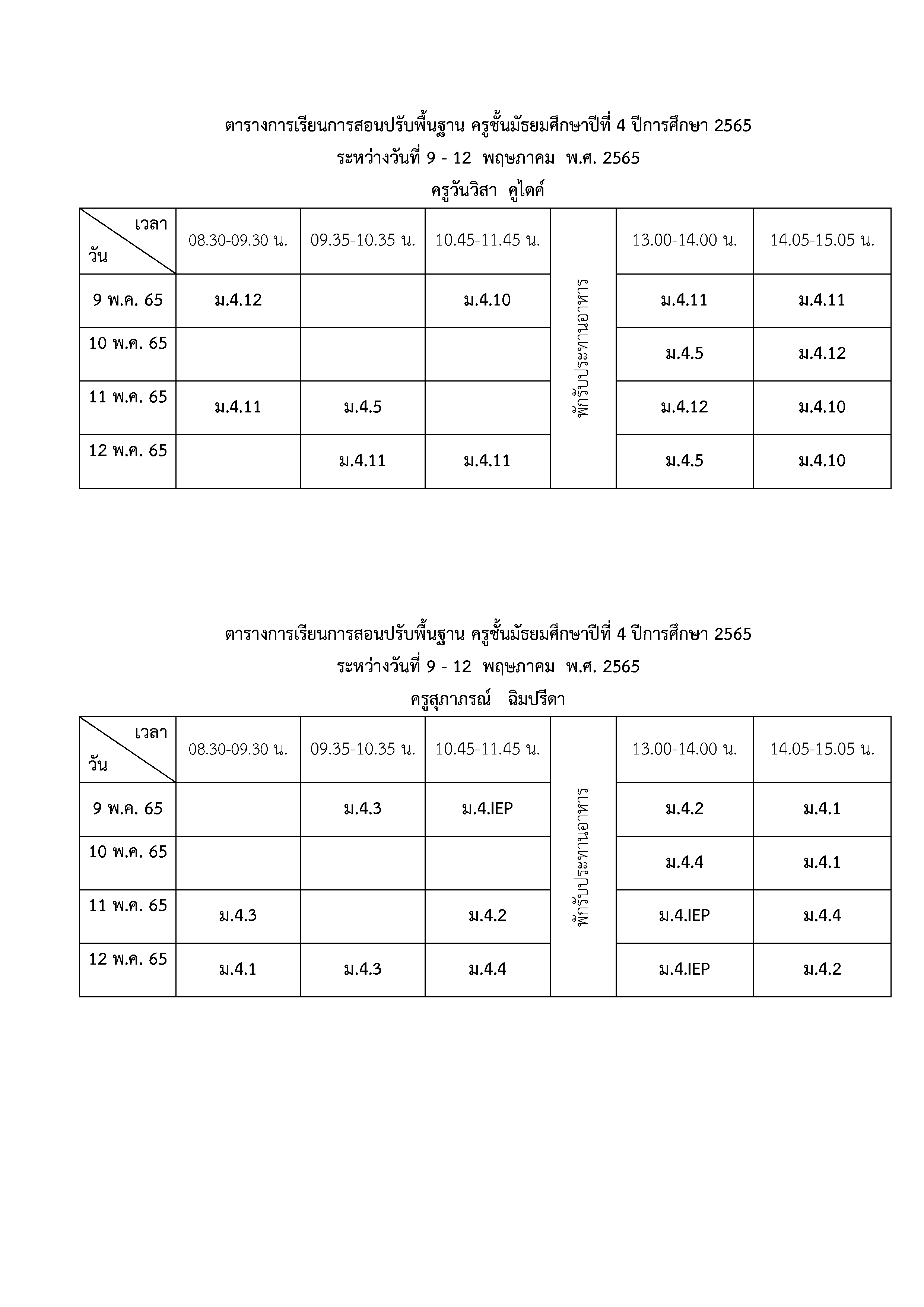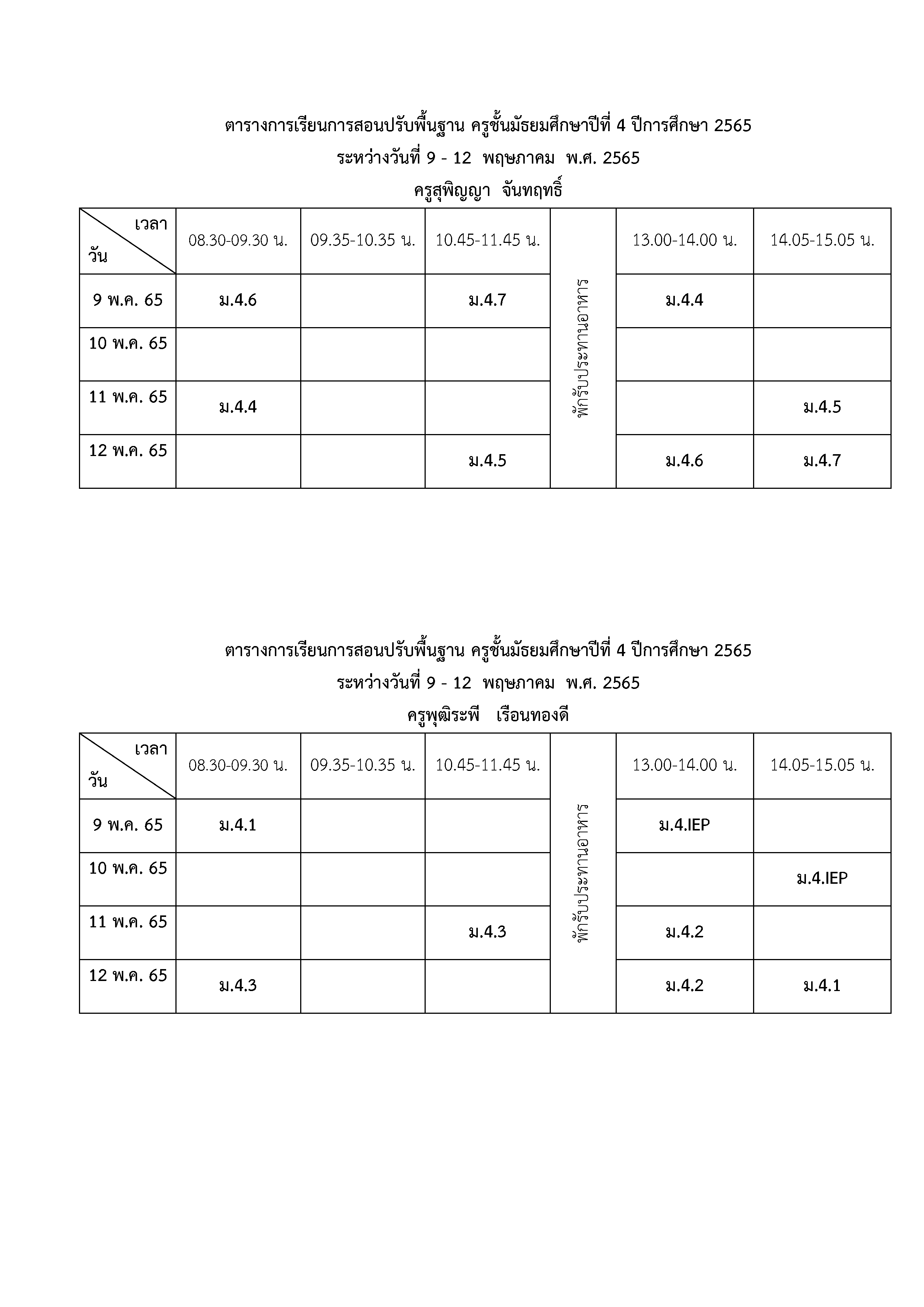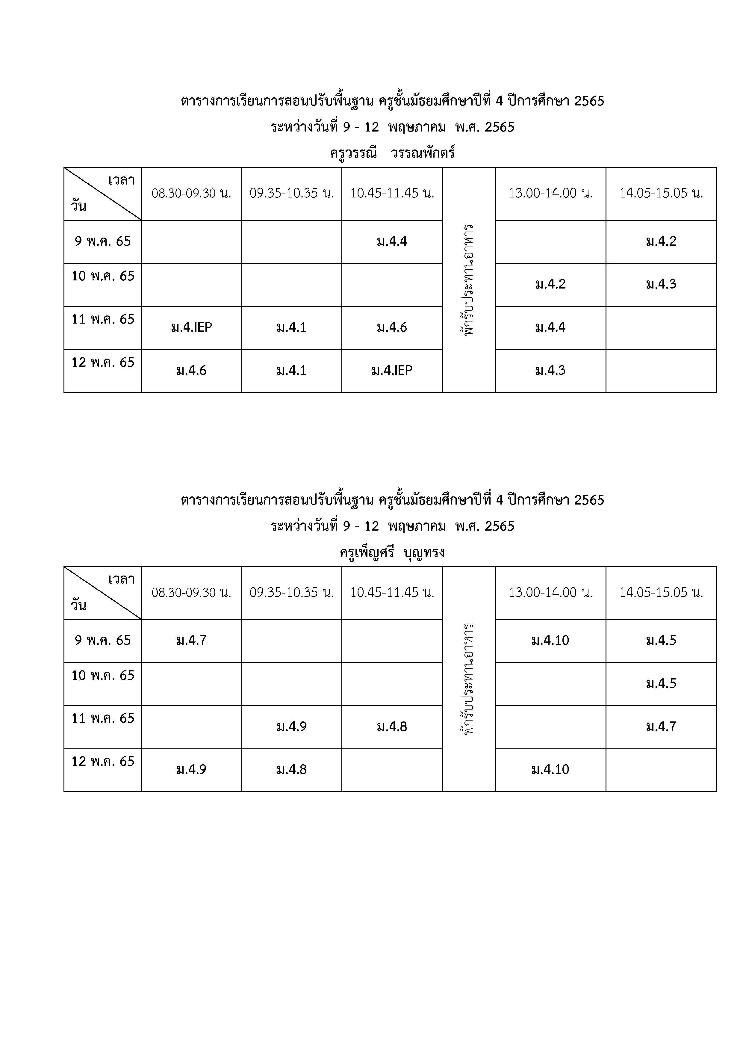 ตารางการเรียนการสอนปรับพื้นฐาน ครูชั้นมัธยมศึกษาปีที่ 4 ปีการศึกษา 2565
