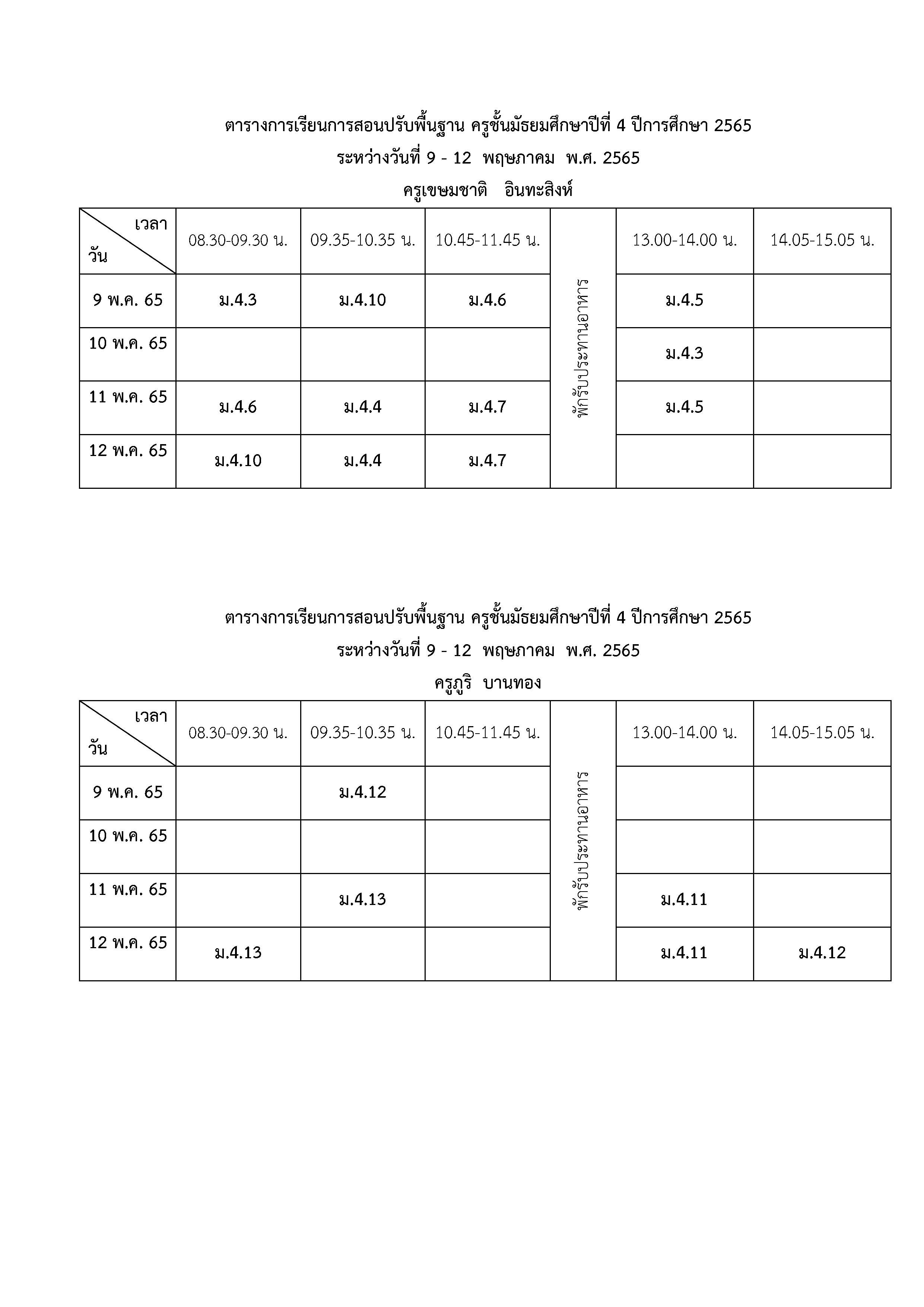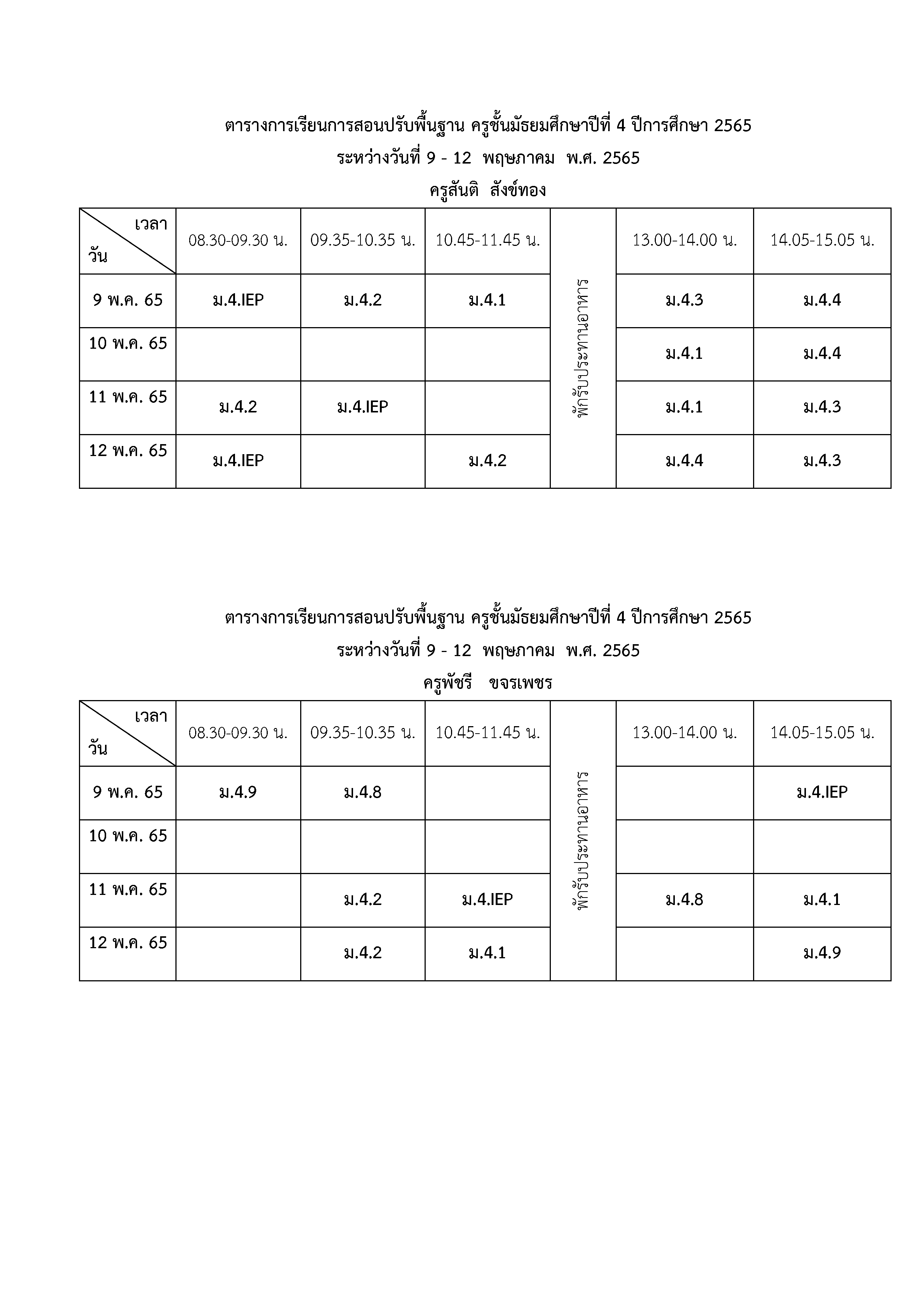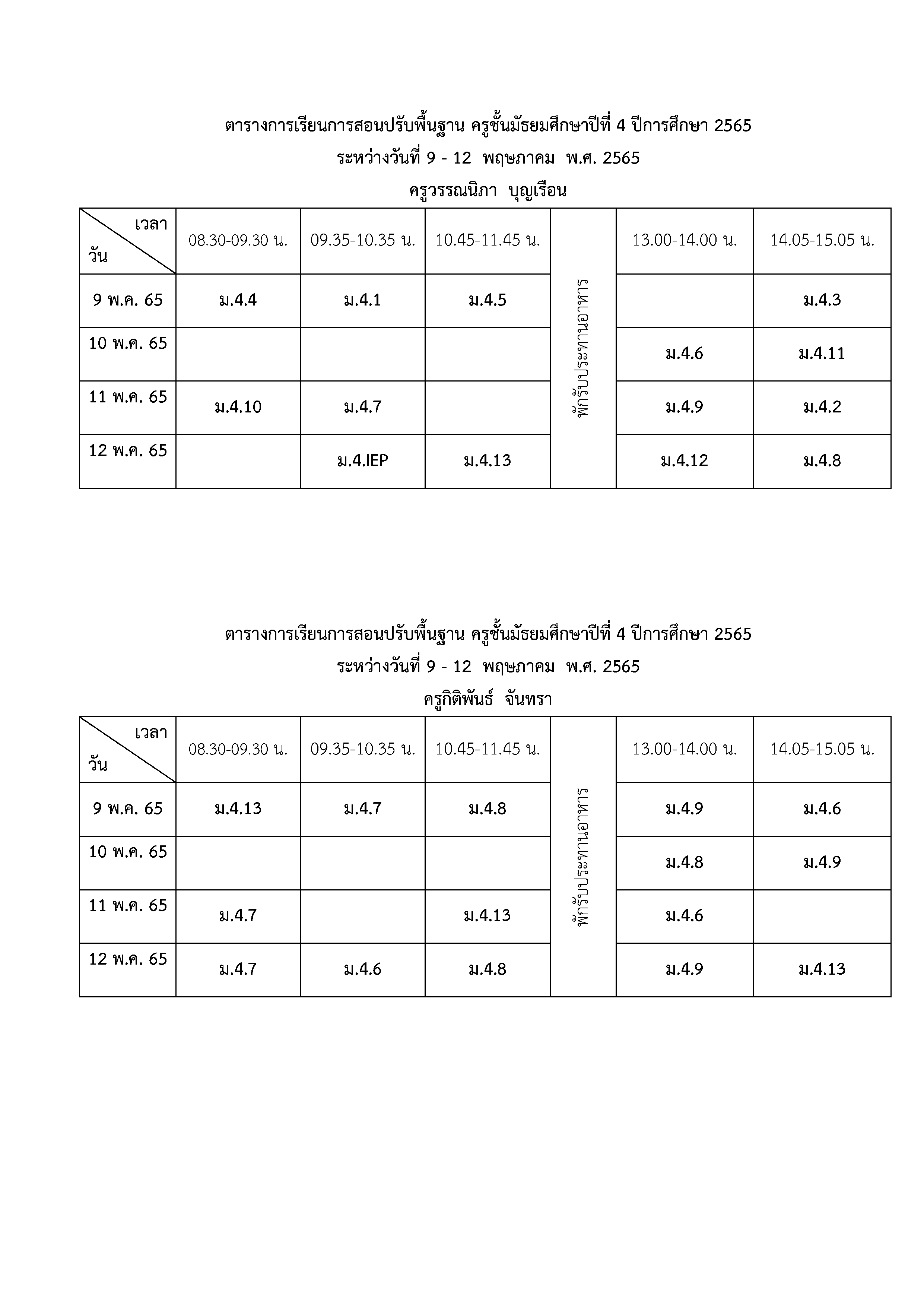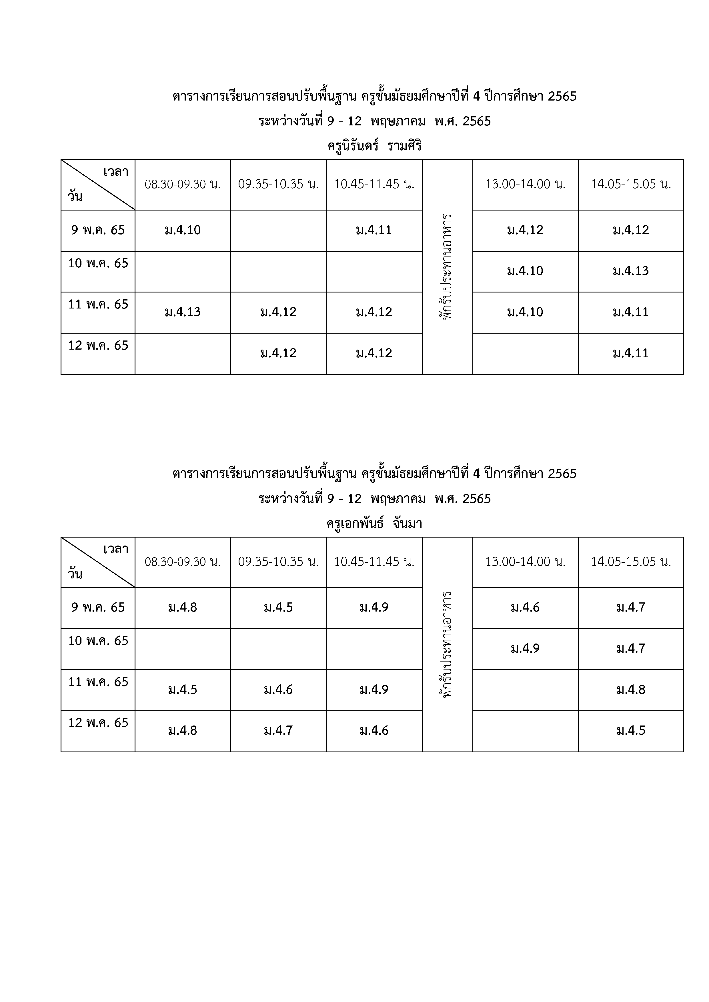 ตารางการเรียนการสอนปรับพื้นฐาน ครูชั้นมัธยมศึกษาปีที่ 4 ปีการศึกษา 2565
