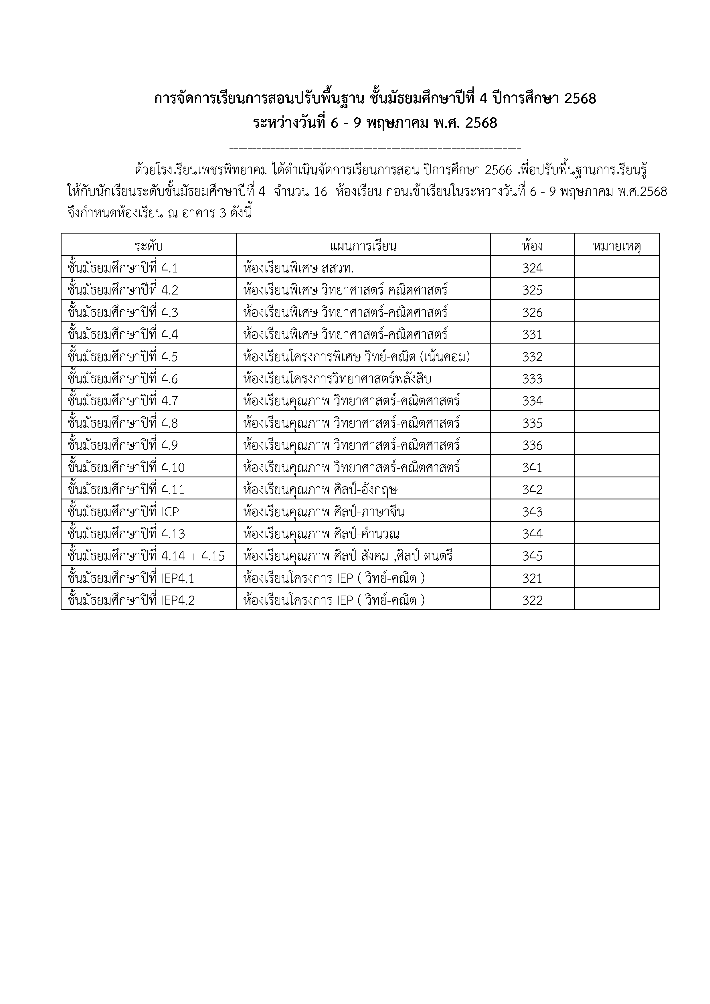 ด้วยโรงเรียนเพชรพิทยาคม ได้ดำเนินจัดการเรียนการสอน ปีการศึกษา 2568 เพื่อปรับพื้นฐานการเรียนรู้ ให้กับนักเรียนระดับชั้นมัธยมศึกษาปีที่ 4 จำนวน 16 ห้องเรียน ก่อนเข้าเรียนในระหว่างวันที่ 6 - 9 พฤษภาคม พ.ศ.2568 จึงกำหนดห้องเรียน ณ อาคาร 3 ดังนี้