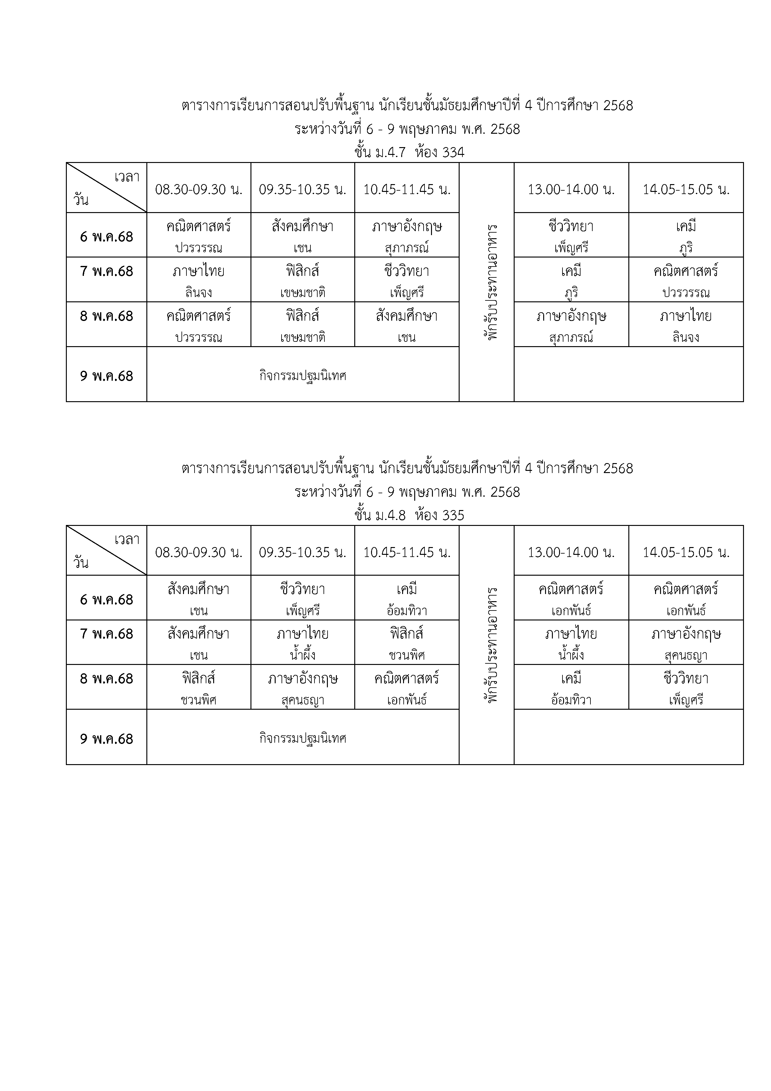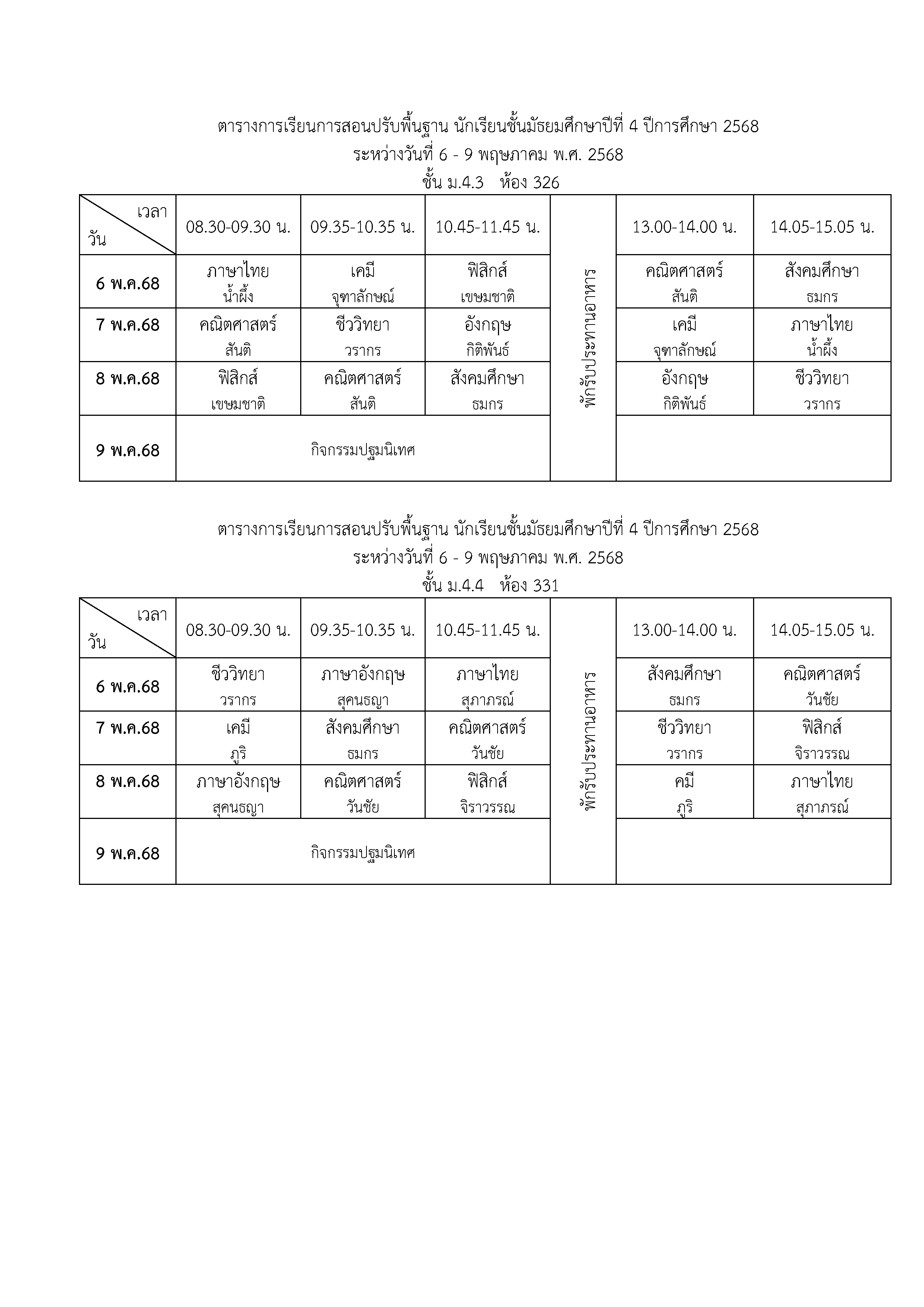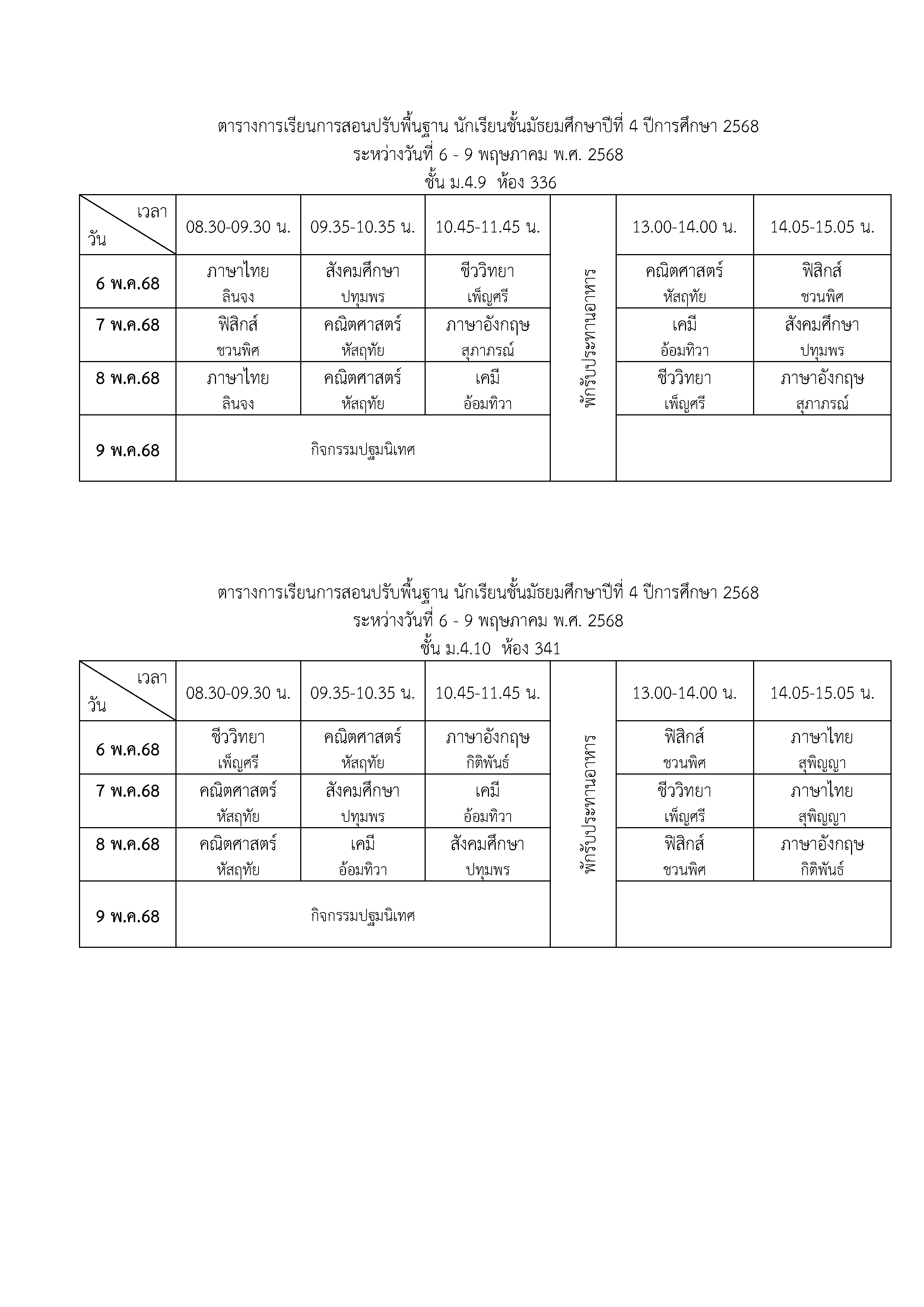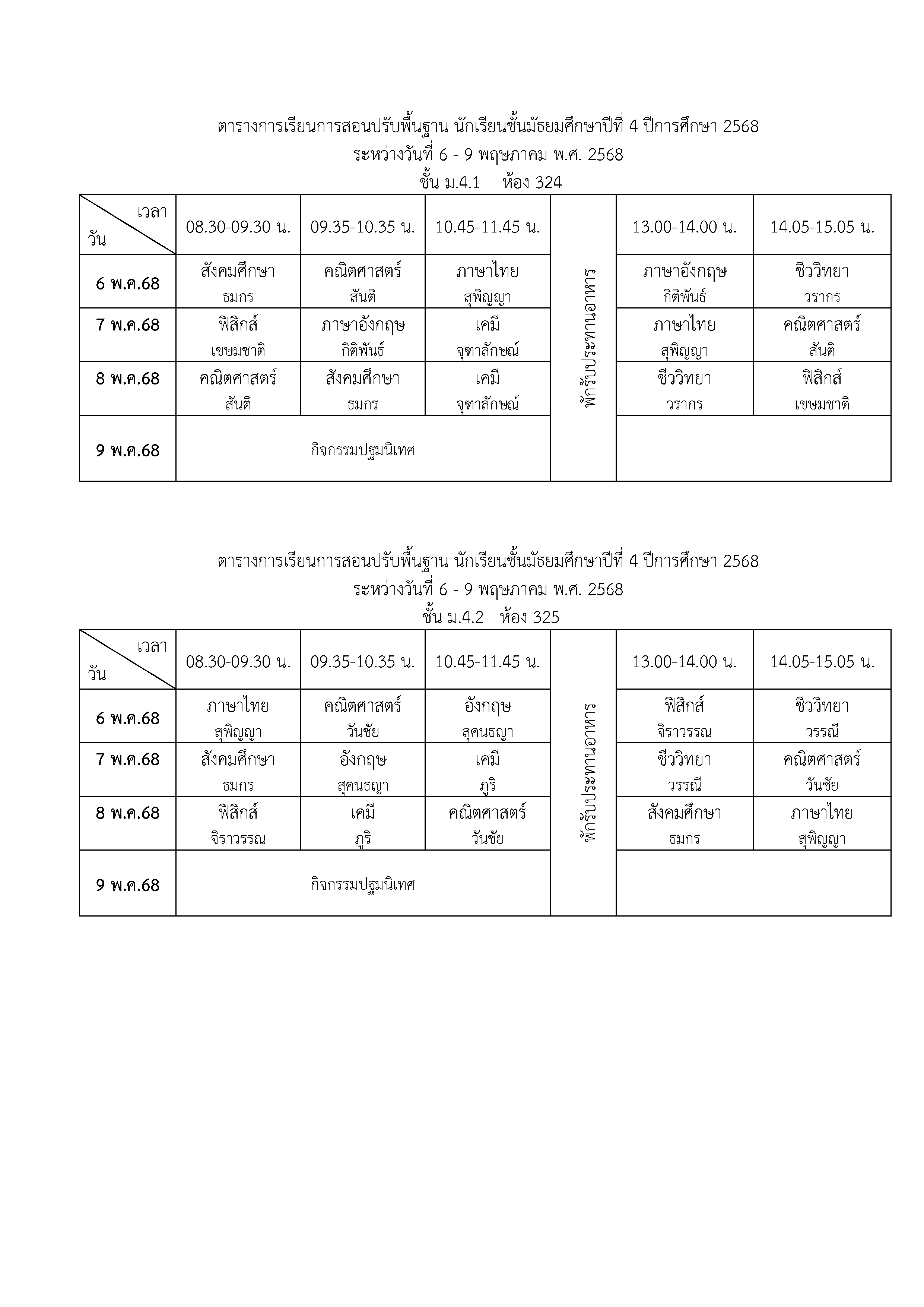 ตารางเรียนปรับพื้นฐาน ม.4 ปีการศึกษา 2568 ระหว่างวันที่ 6-9 พฤษภาคม 2568