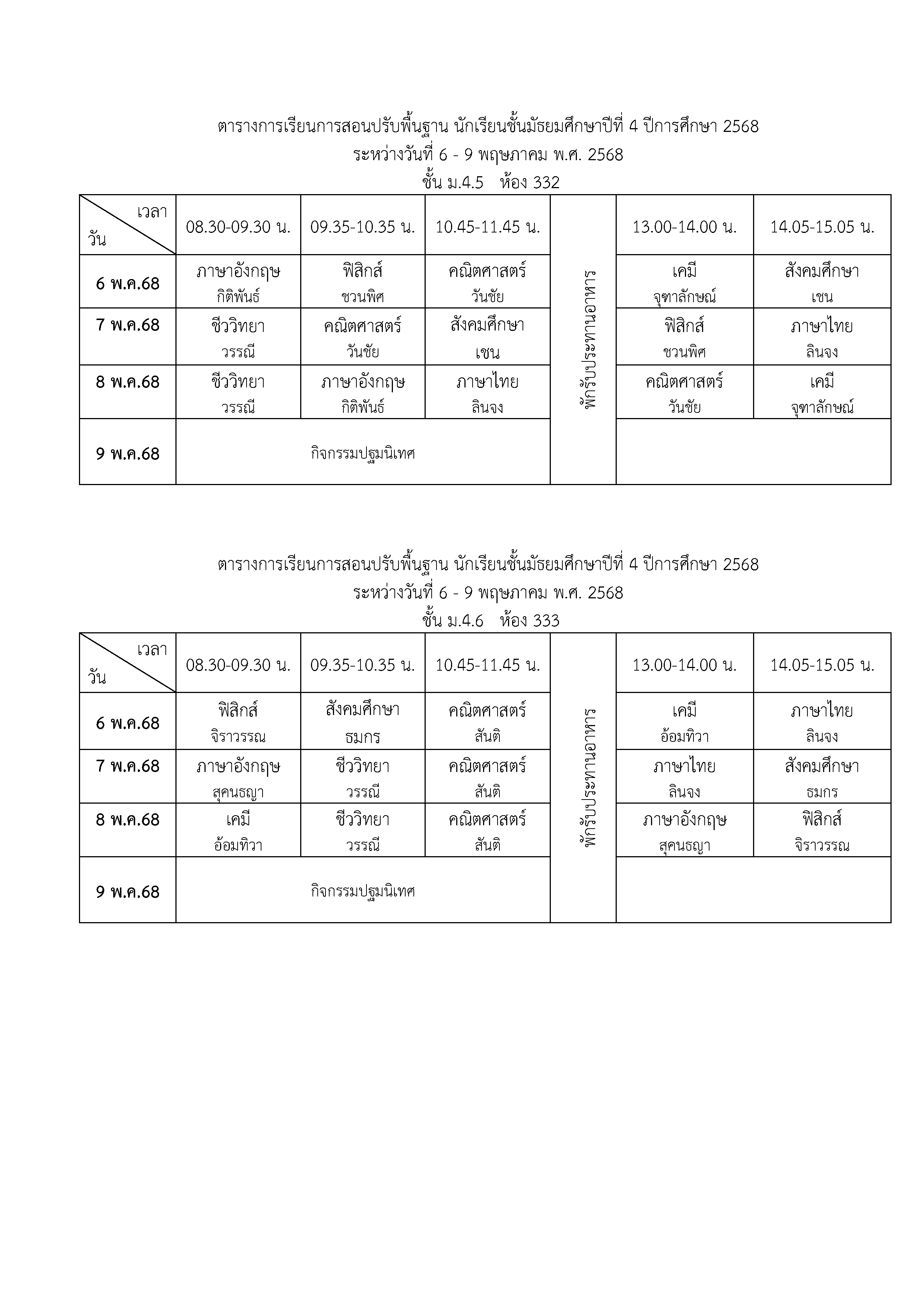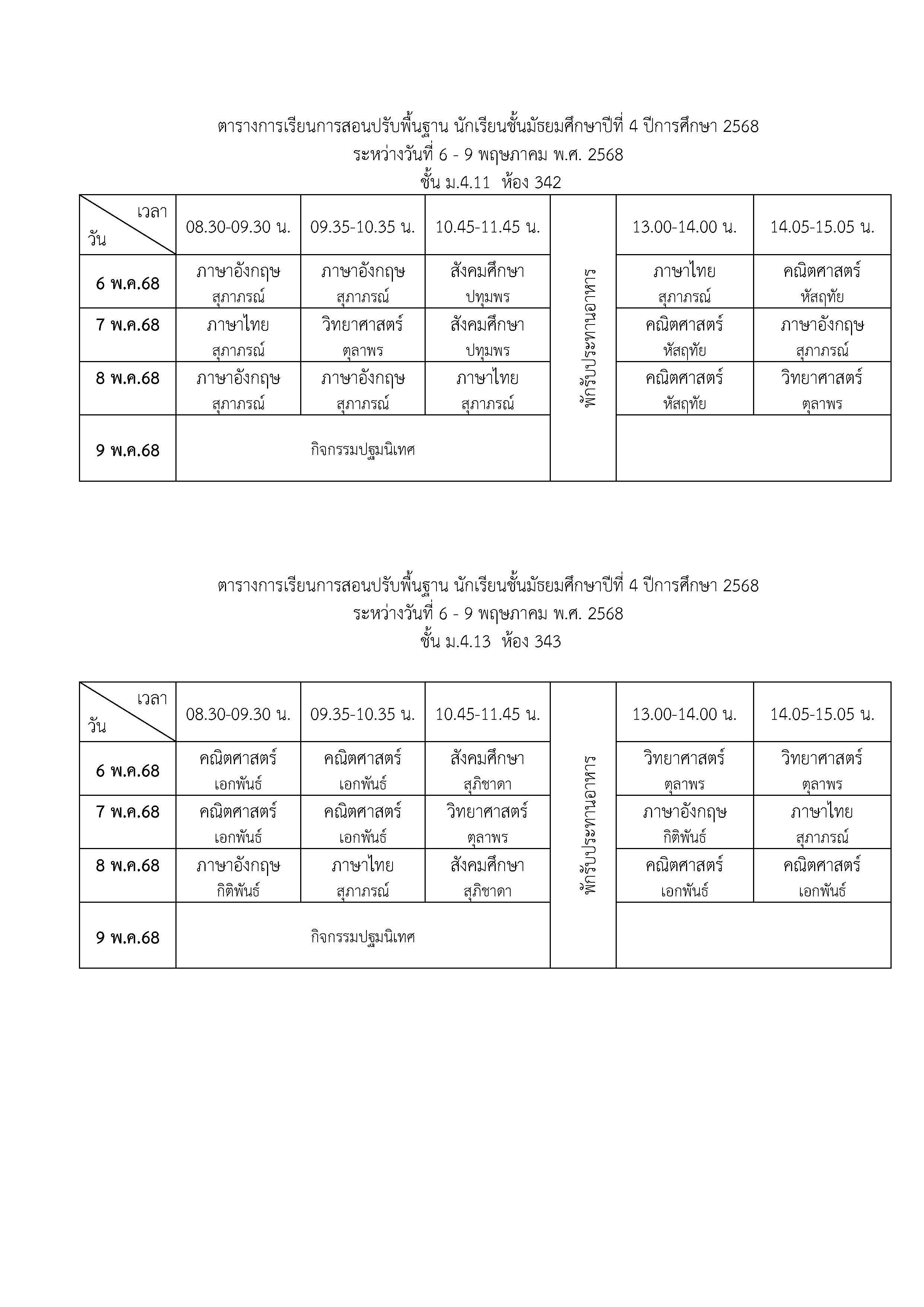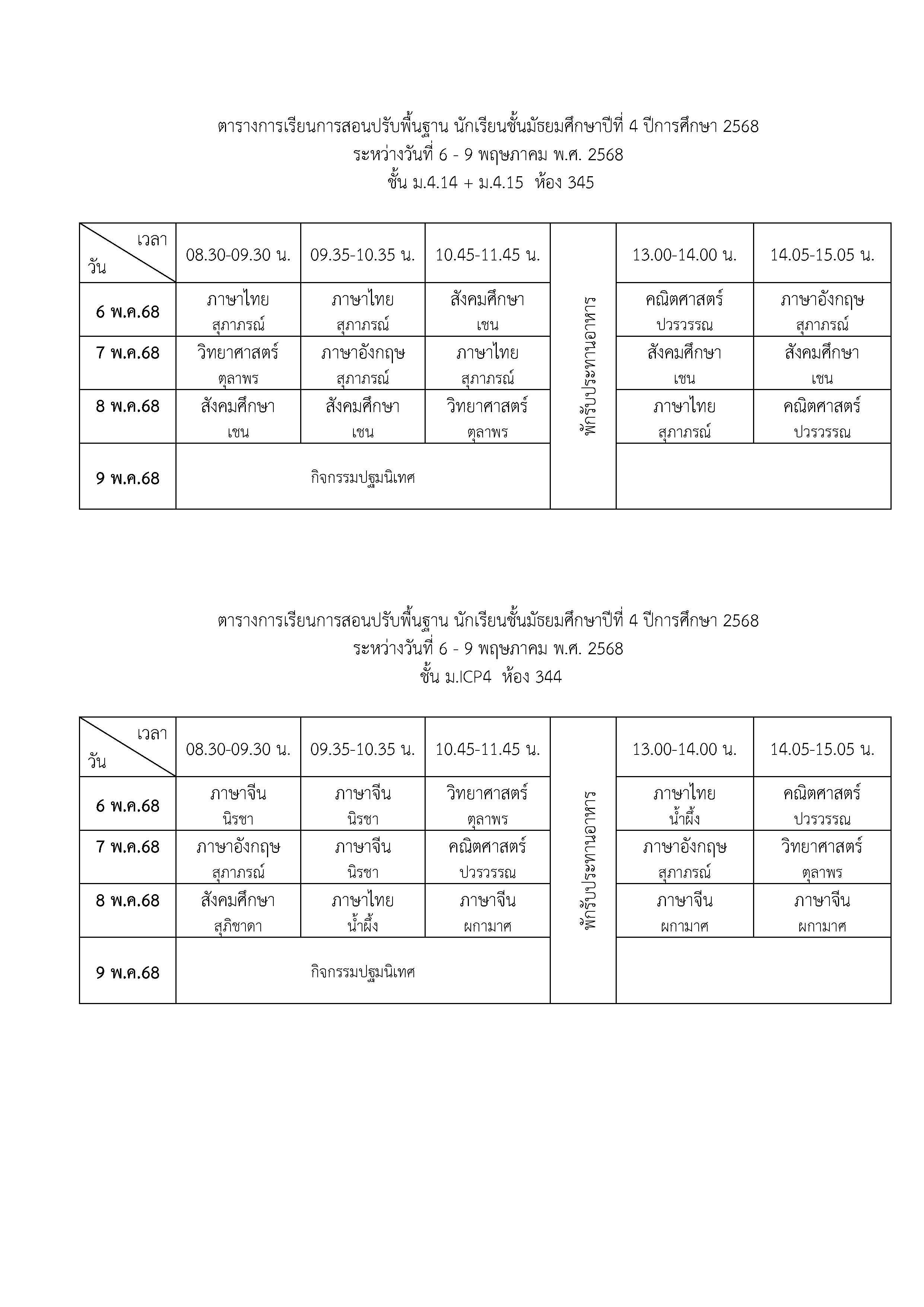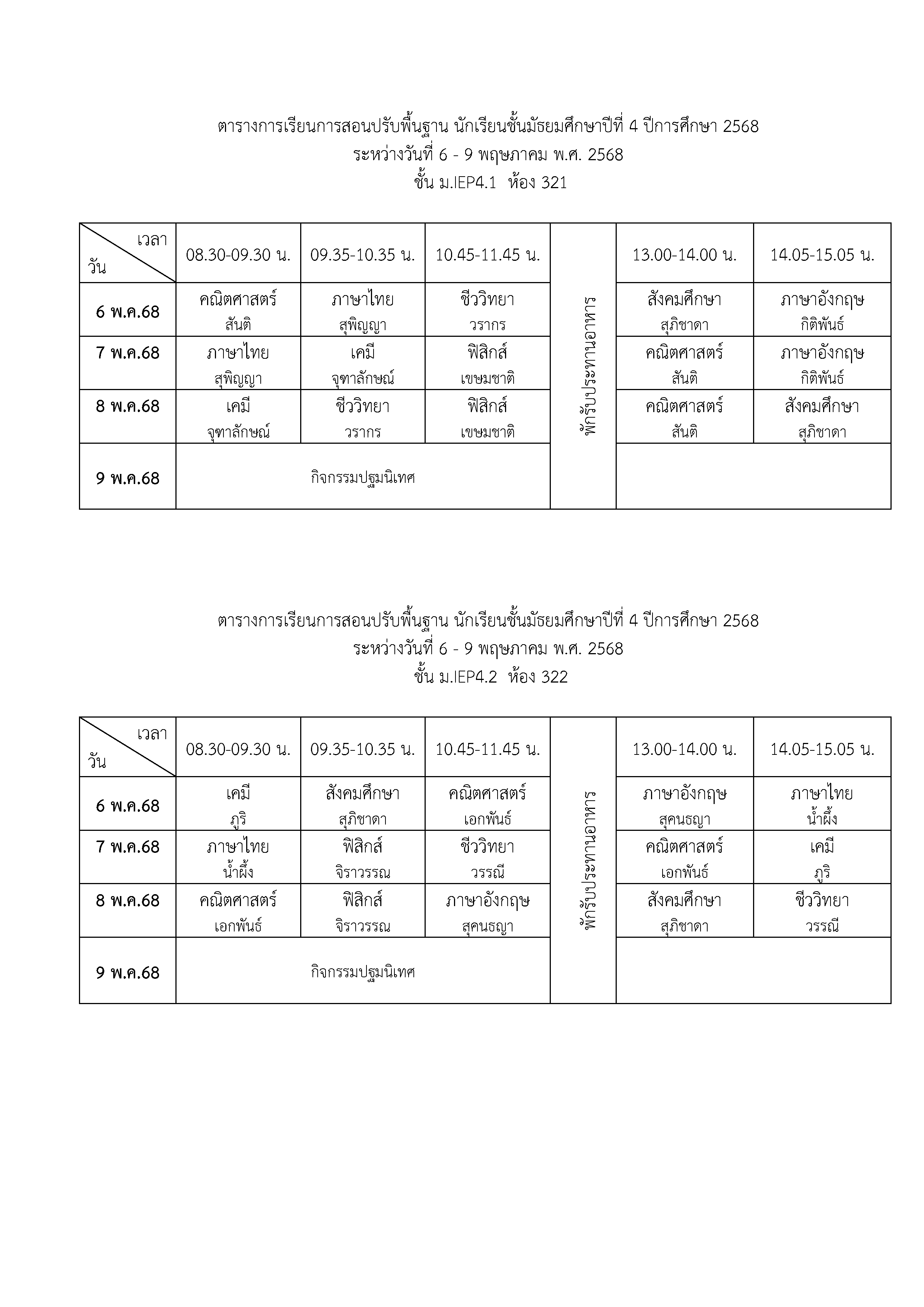 ตารางเรียนปรับพื้นฐาน ม.4 ปีการศึกษา 2568 ระหว่างวันที่ 6-9 พฤษภาคม 2568