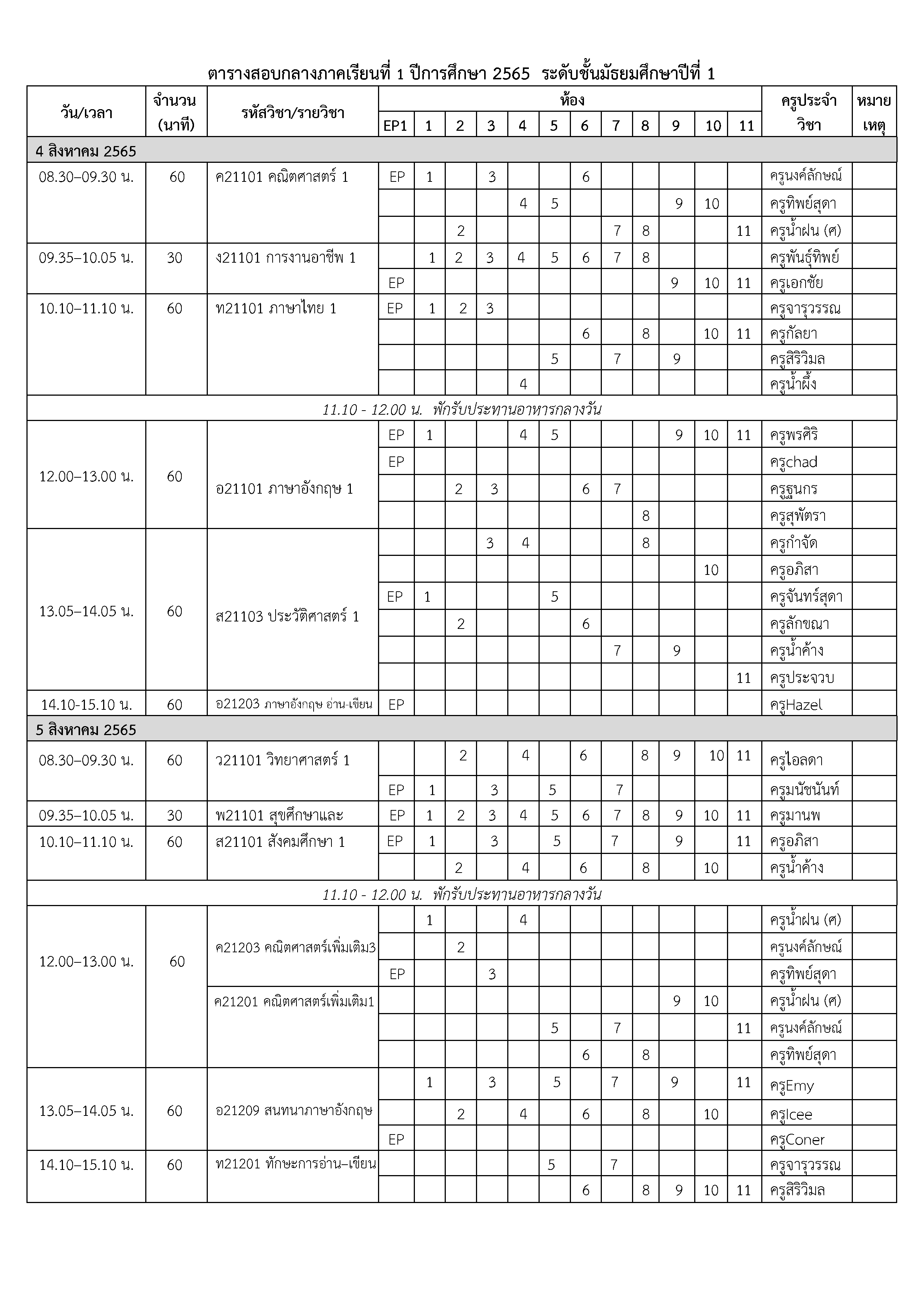 ตารางสอบกลางภาคเรียนที่ 1 ปีการศึกษา 2565 ระดับชั้นมัธยมศึกษาปีที่ 1 วันที่ 4-5 สิงหาคม 2565