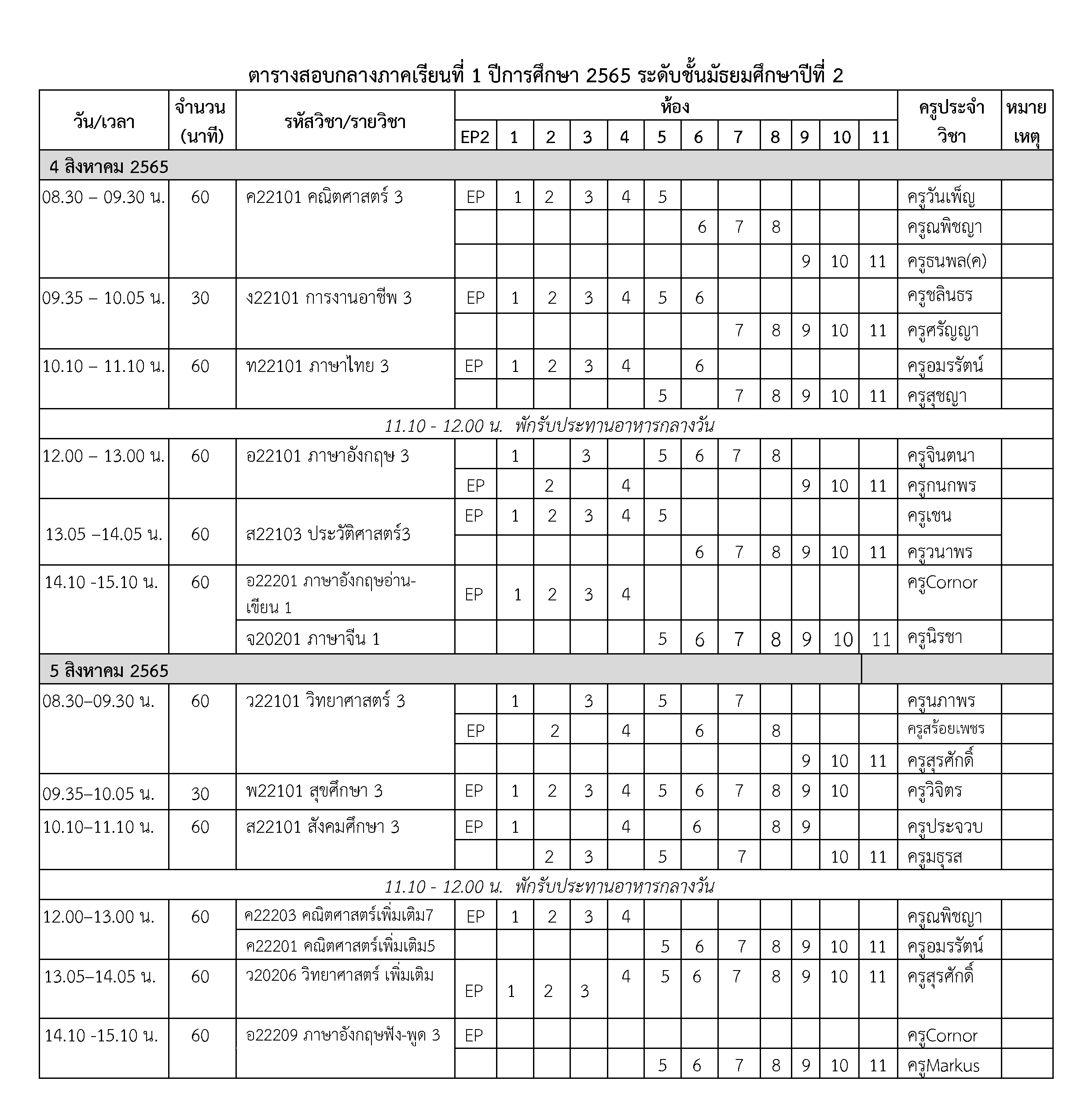 ตารางสอบกลางภาคเรียนที่ 1 ปีการศึกษา 2565 ระดับชั้นมัธยมศึกษาปีที่ 2 วันที่ 4-5 สิงหาคม 2565