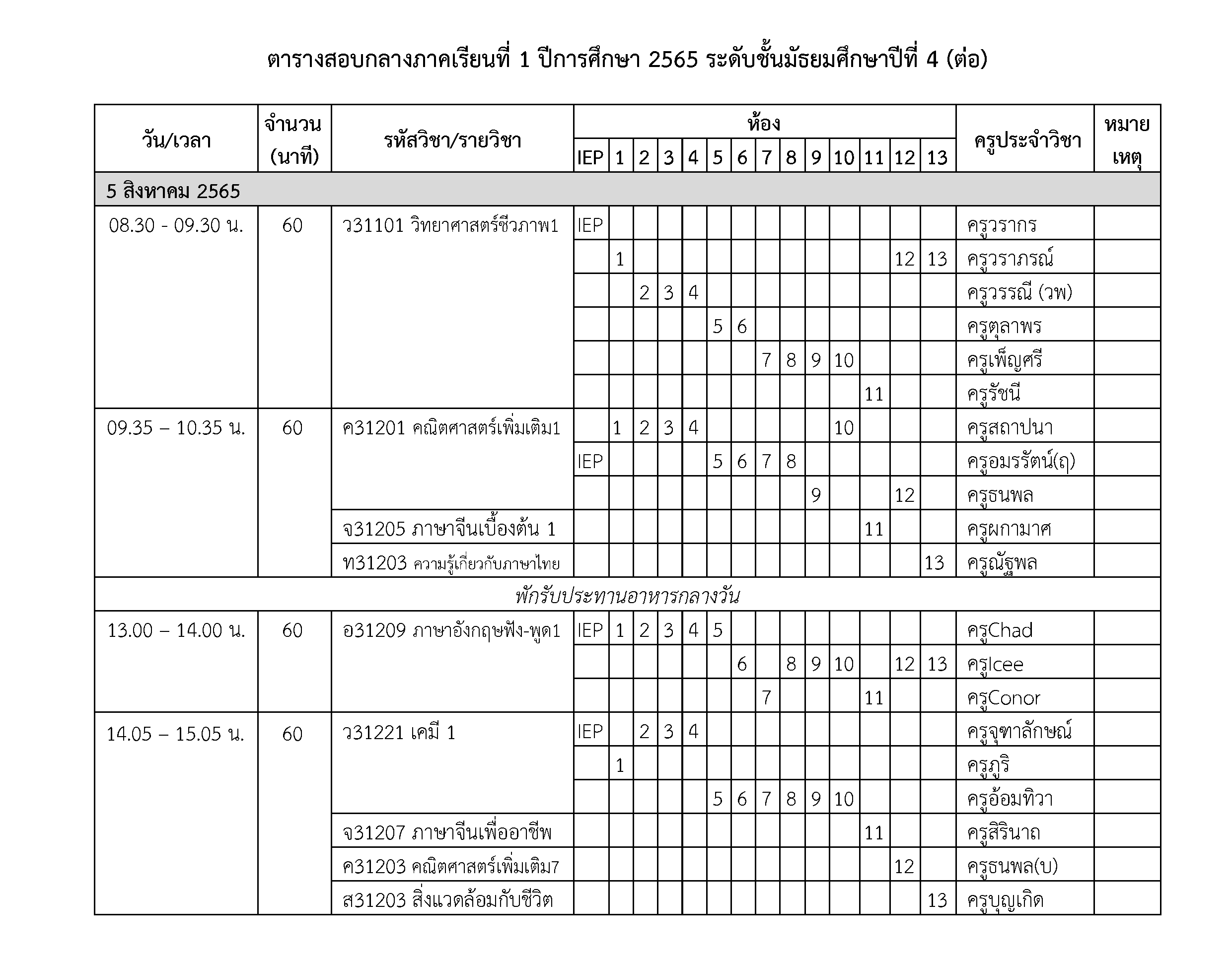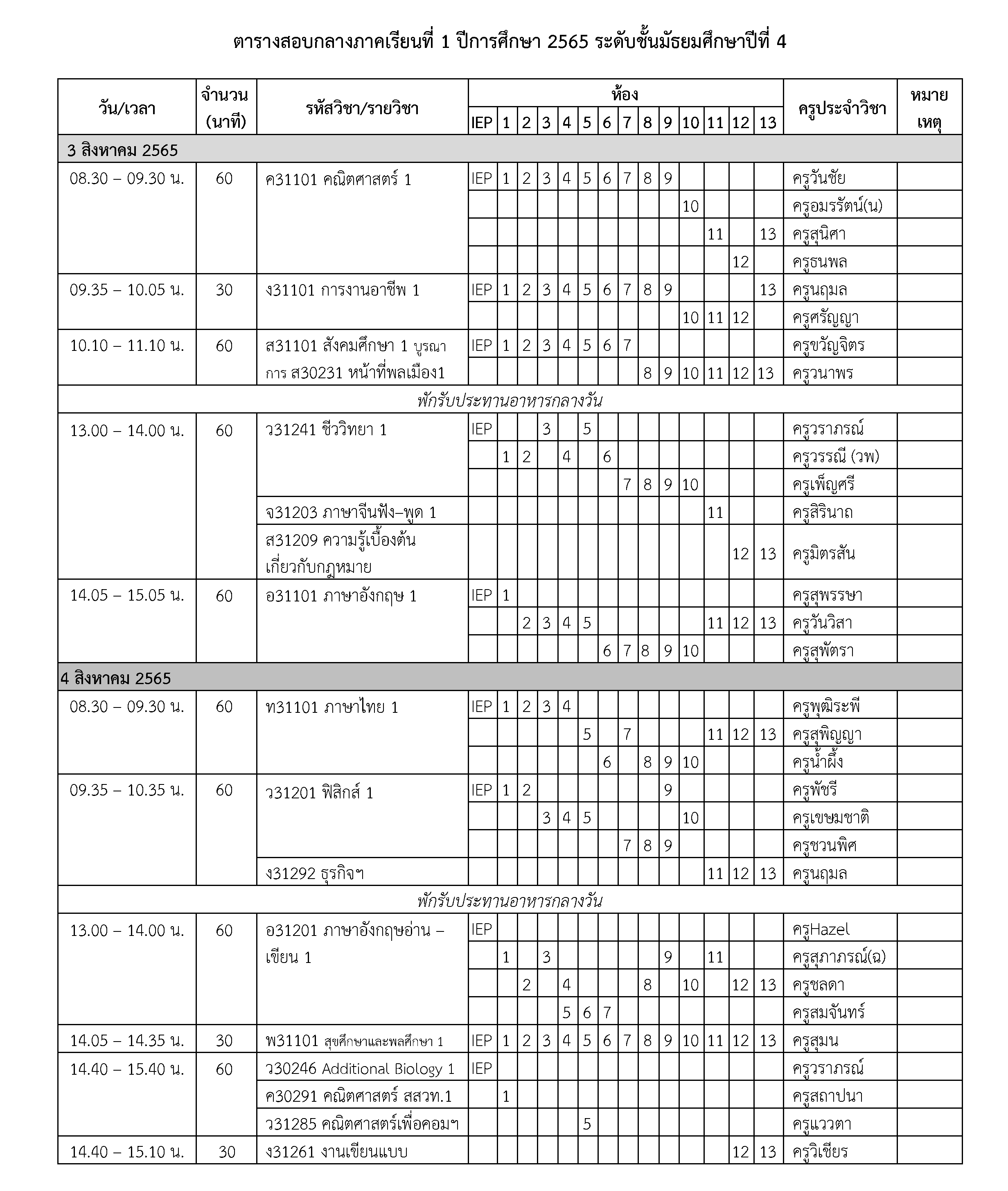 ตารางสอบกลางภาคเรียนที่ 1 ปีการศึกษา 2565 ระดับชั้นมัธยมศึกษาปีที่ 4 วันที่ 3-4-5 สิงหาคม 2565