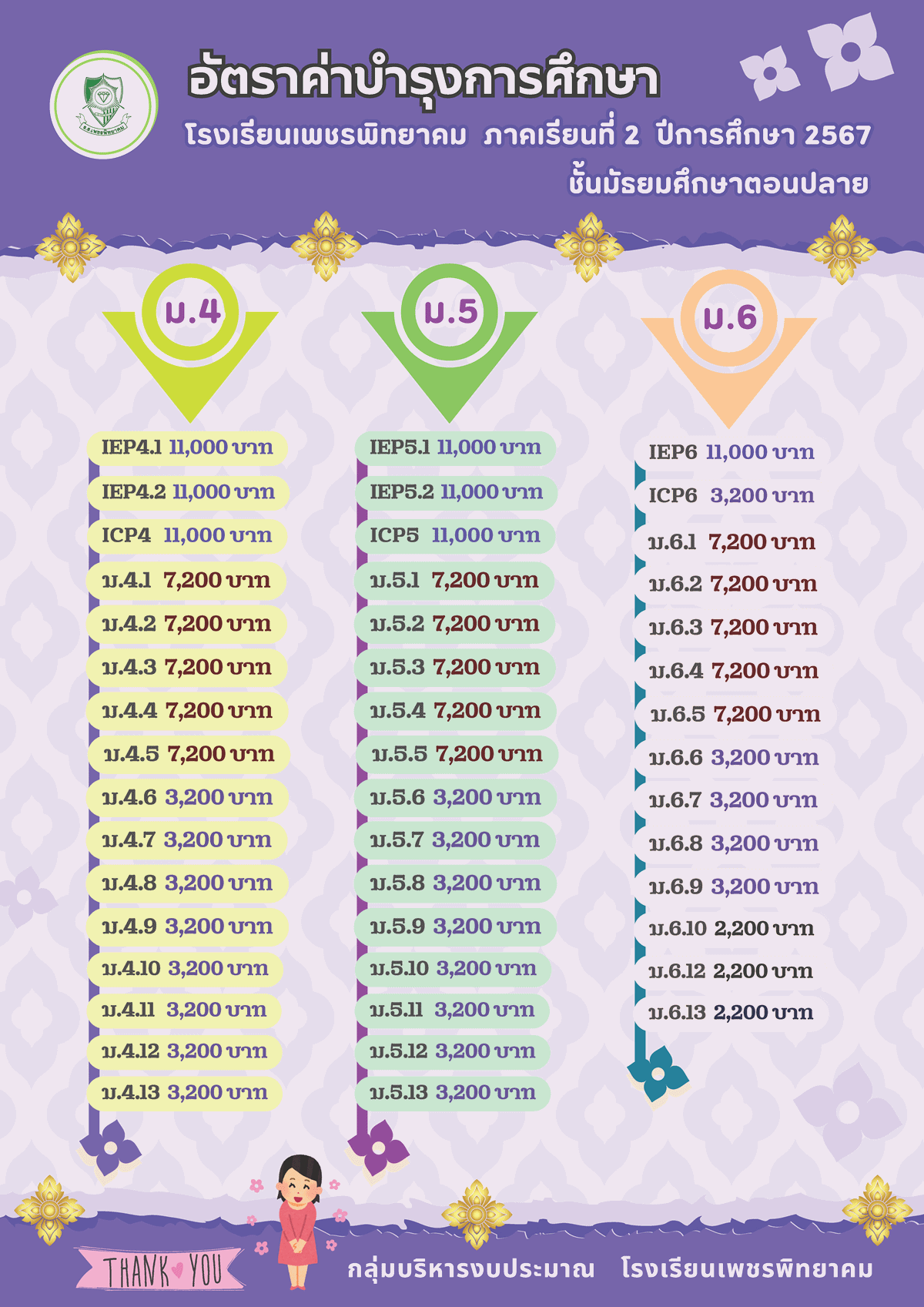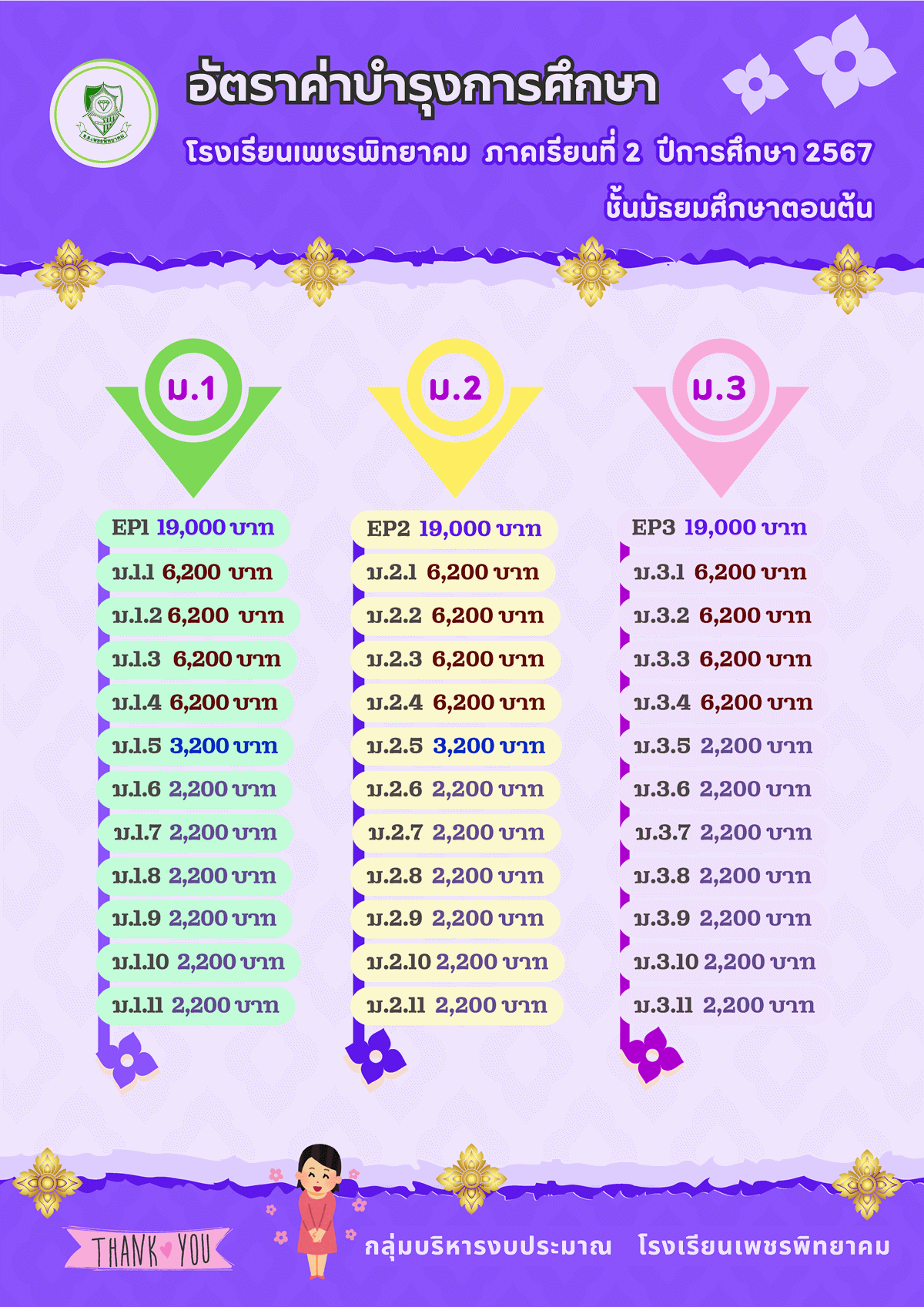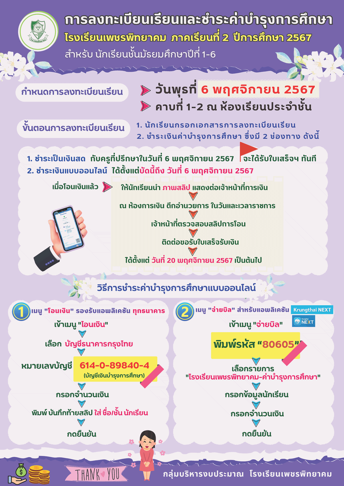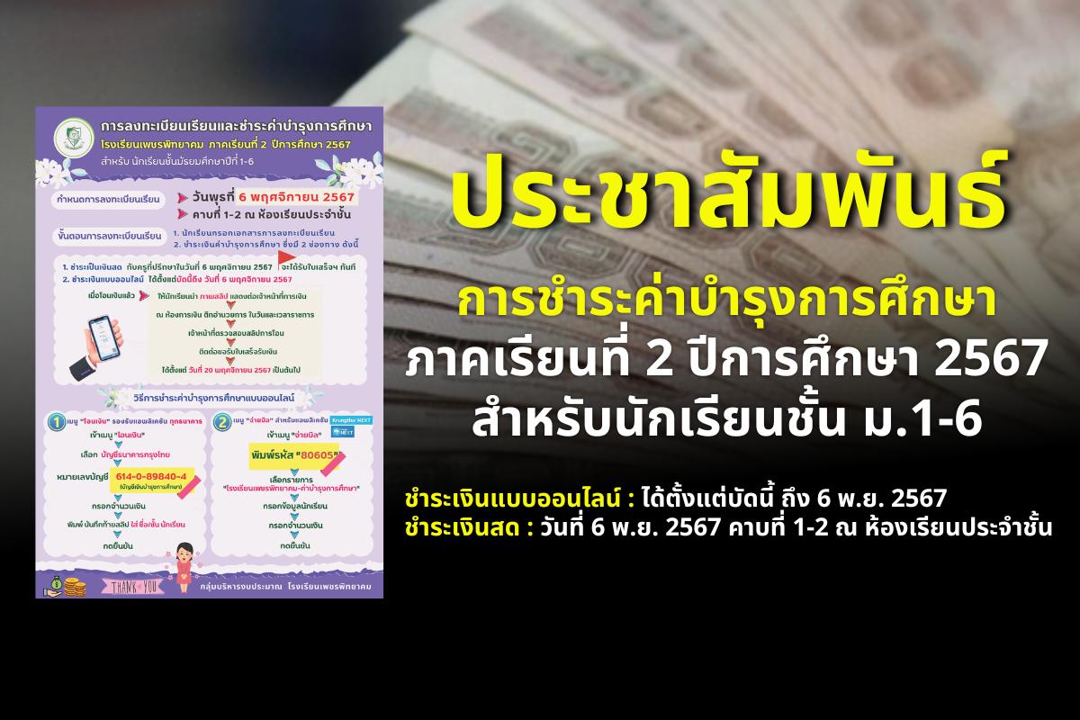 ประชาสัมพันธ์การชำระค่าบำรุงการศึกษา ภาคเรียนที่ 2 ปีการศึกษา 2567 สำหรับนักเรียนชั้นมัธยมศึกษาปีที่ 1-6