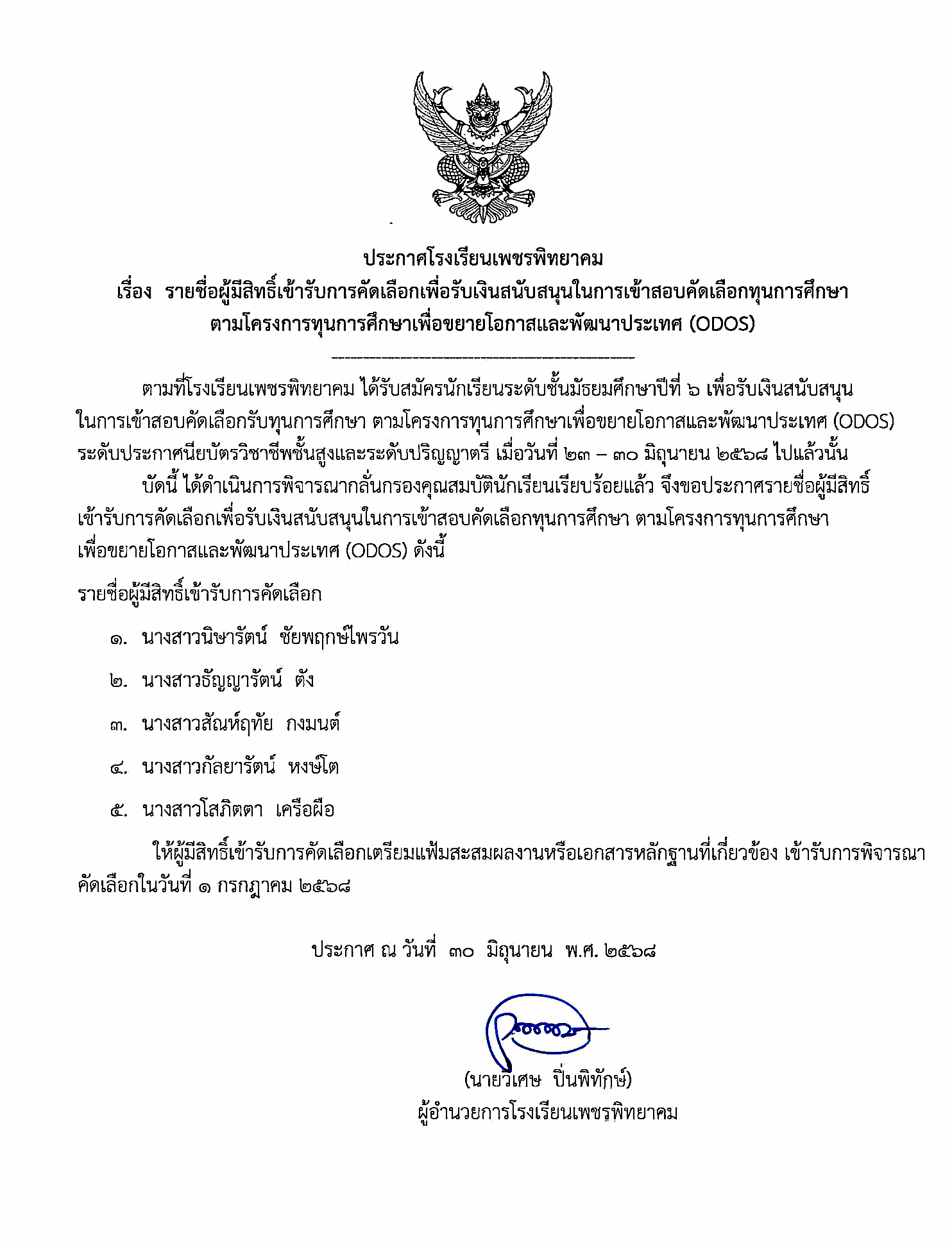 ตามที่โรงเรียนเพชรพิทยาคม ได้รับสมัครนักเรียนระดับชั้นมัธยมศึกษาปีที่ 6 เพื่อรับเงินสนับสนุน ในการเข้าสอบคัดเลือกรับทุนการศึกษา ตามโครงการทุนการศึกษาเพื่อขยายโอกาสและพัฒนาประเทศ (ODOS) ระดับประกาศนียบัตรวิชาชีพชั้นสูงและระดับปริญญาตรี เมื่อวันที่ 23- 30 มิถุนายน 2568 ไปแล้วนั้น