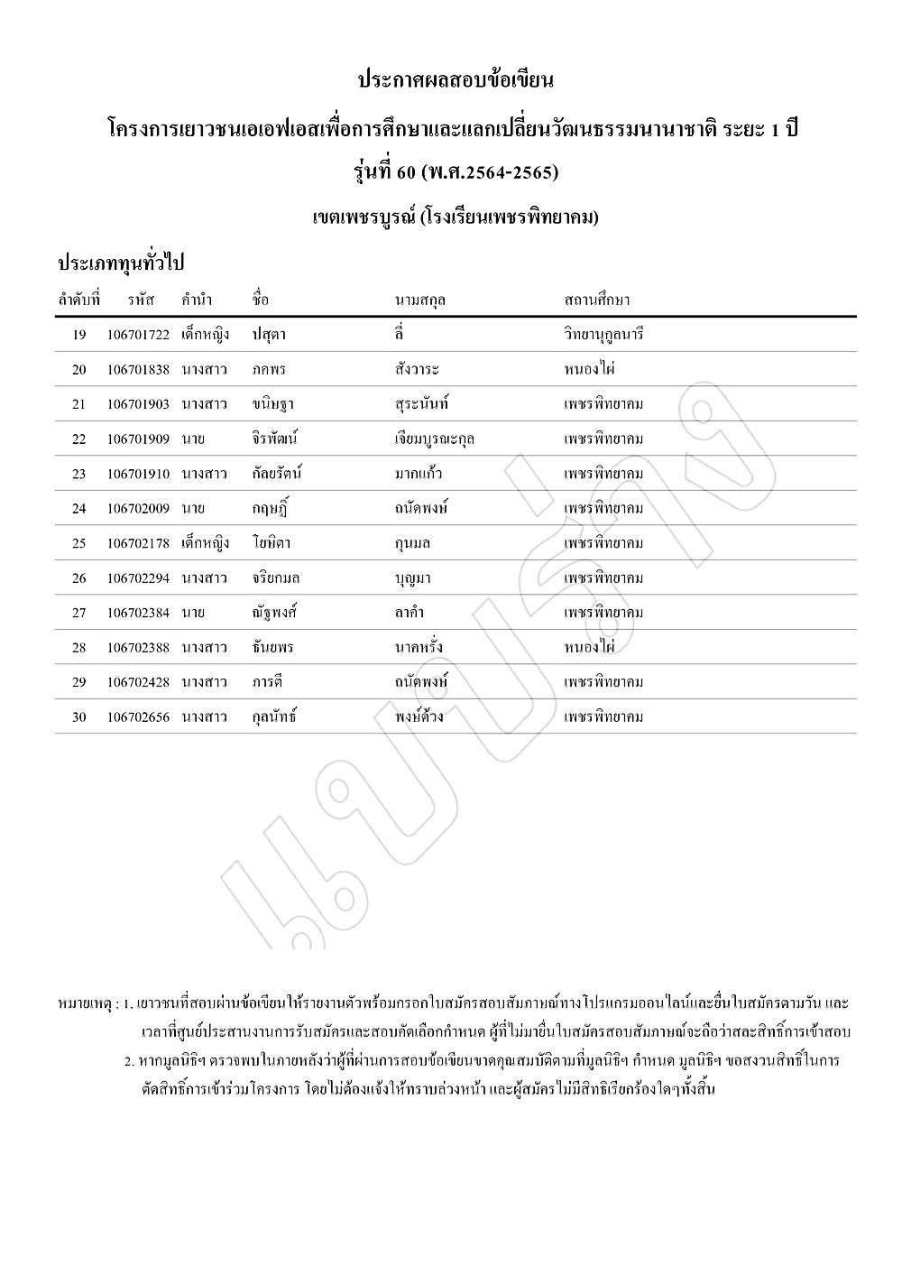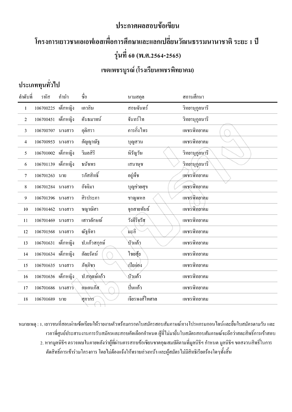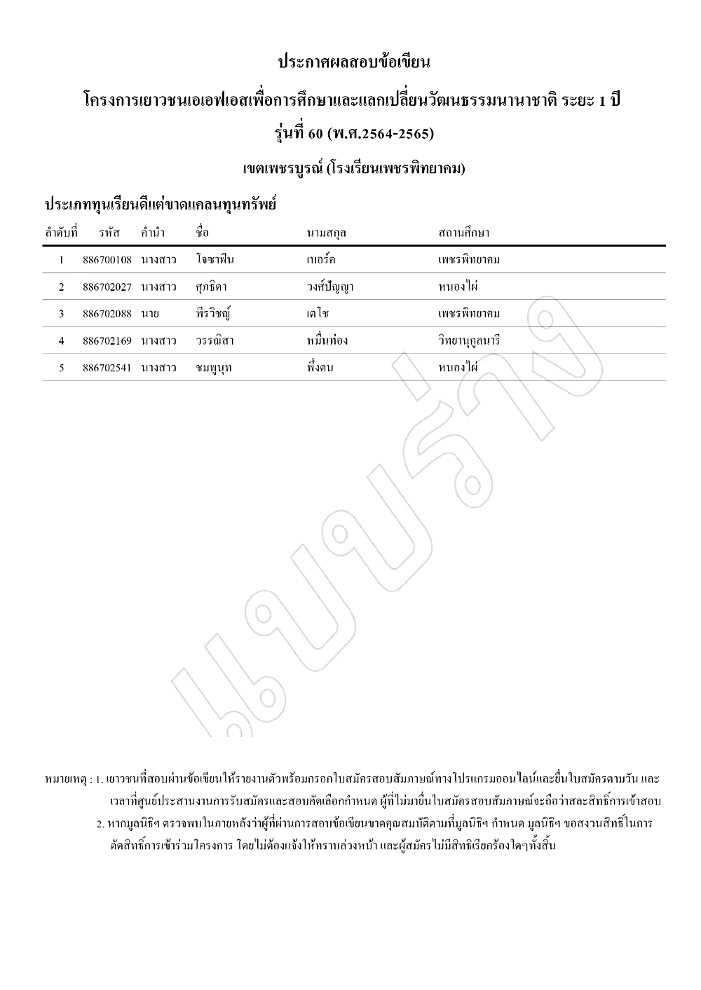 ประกาศผลสอบข้อเขียนโครงการเยาวชนเอเอฟเอสเพื่อการศึกษาและแลกเปลี่ยนวัฒนธรรมนานาชาติ ระยะ 1 ปี รุ่นที่ 60 (พ.ศ.2564-2565) เขตเพชรบูรณ์