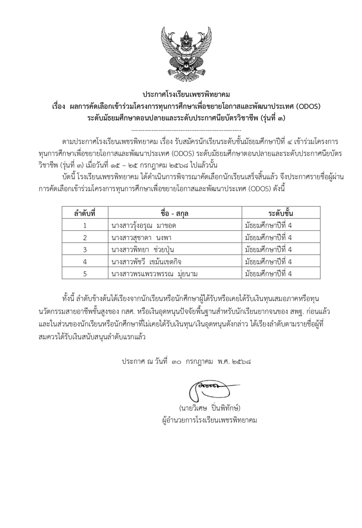 ประกาศโรงเรียนเพชรพิทยาคม เรื่อง ผลการคัดเลือกเข้าร่วมโครงการทุนการศึกษาเพื่อขยายโอกาสและพัฒนาประเทศ (ODOS) ระดับมัธยมศึกษาตอนปลายและระดับประกาศนียบัตรวิชาชีพ (รุ่นที่ 3)