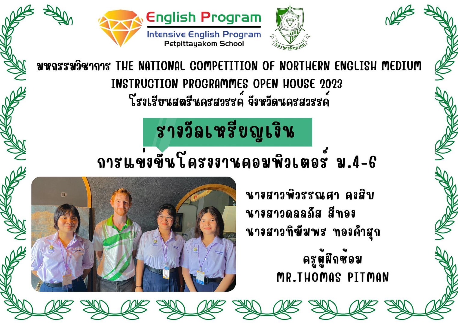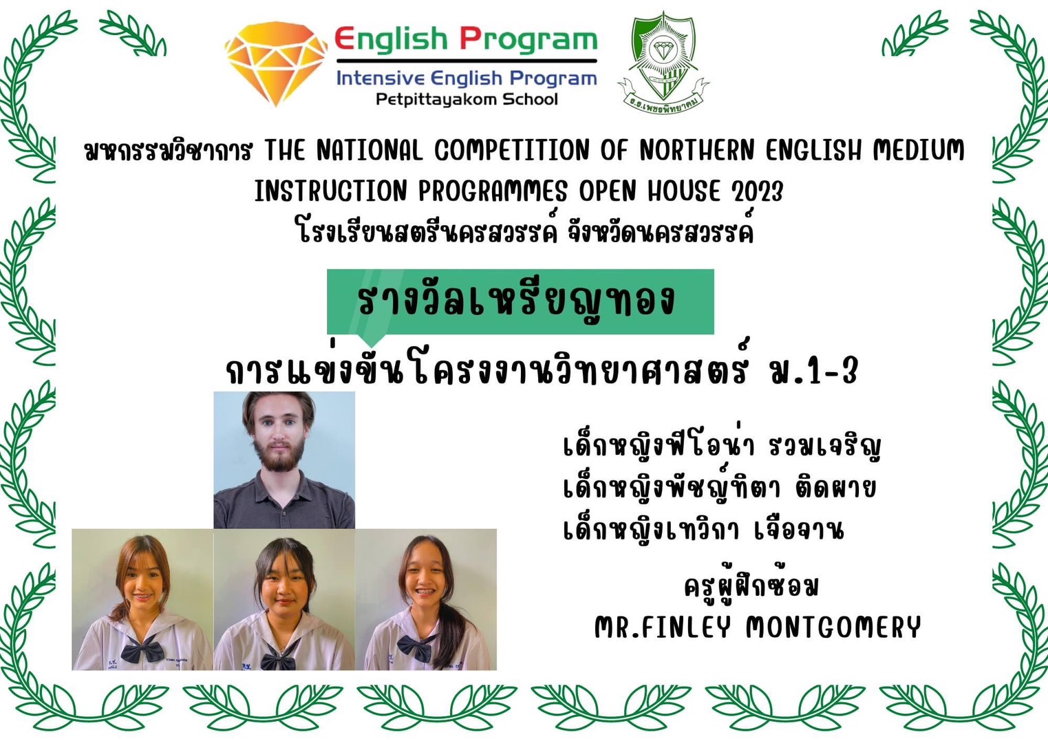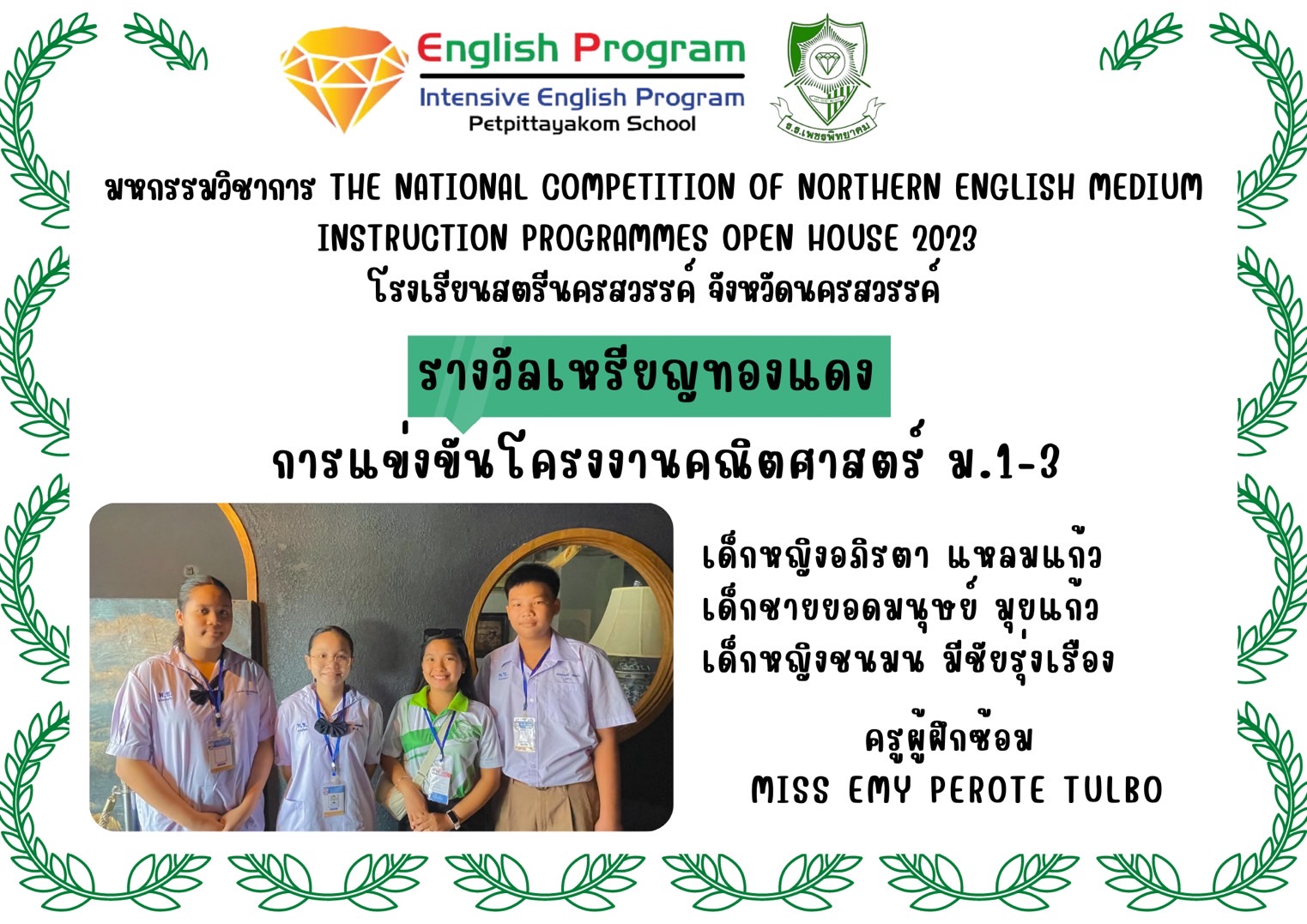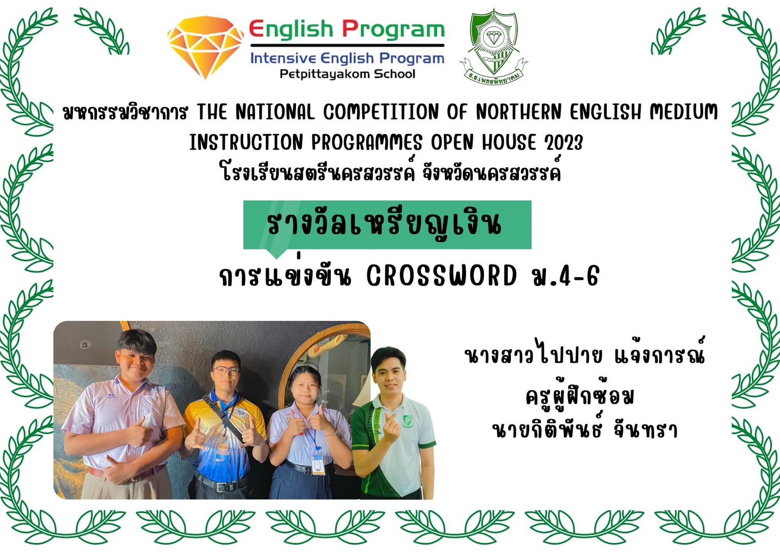 นักเรียนโครงการห้องเรียนพิเศษ English Program/ Intensive English Program เข้าร่วมการแข่งขันมหกรรมวิชาการ Northern English Medium Instruction Programmes Open House 2023 ครั้งที่ 34 ภายใต้แนวคิด “Reimagining English Medium Education: Diversity, Equity, Inclusion and Togetherness” ของศูนย์ส่งเสริมห้องเรียนพิเศษภาษาอังกฤษ ภาคเหนือโรงเรียนที่ดำเนินการจัดการเรียนการสอนตามหลักสูตรกระทรวงศึกษาธิการเป็นภาษาอังกฤษ (English Program / Mini English Program/Gifted/Intensive English Program) ประจำปีการศึกษา 2566 ระหว่างวันที่ 17-18 สิงหาคม 2566 ณ โรงเรียนสตรีนครสวรรค์ จังหวัดนครสวรรค์ เข้าร่วมการแข่งขันทั้งสิ้น 17 รายการ ผลการแข่งขันดังนี้
