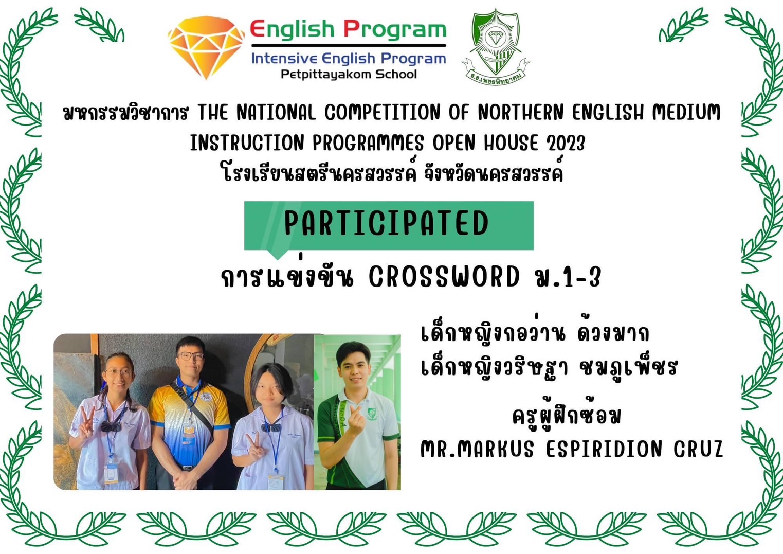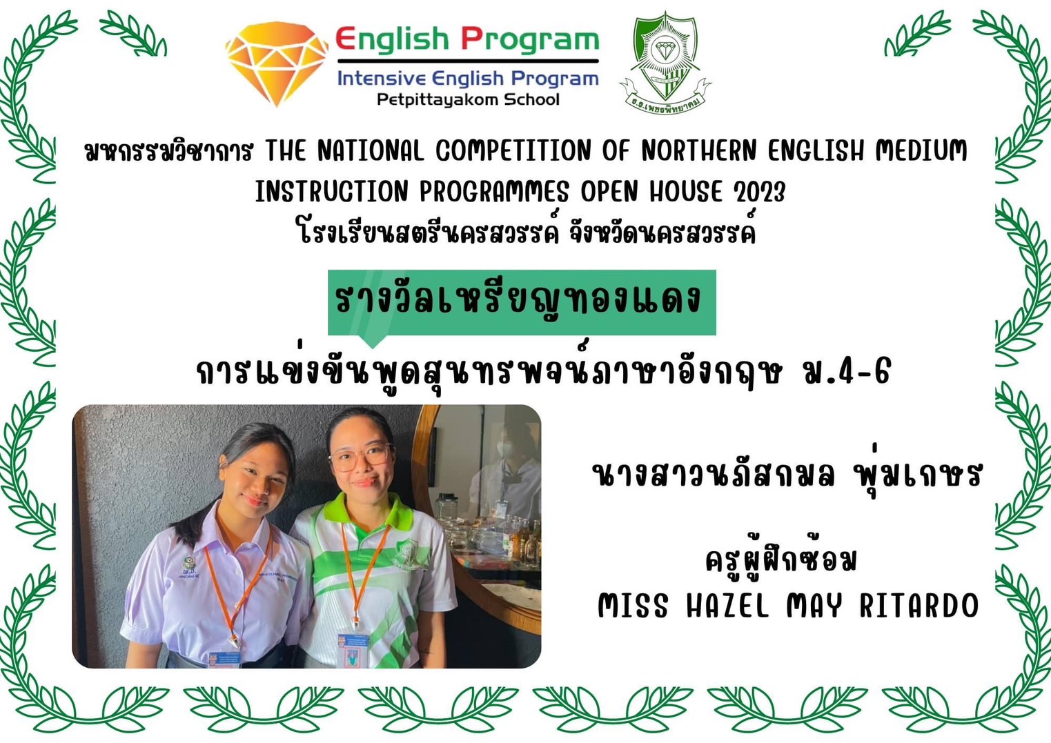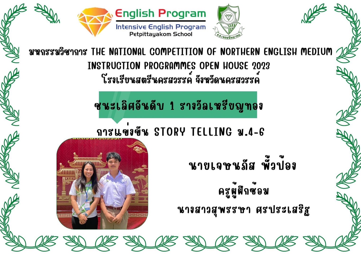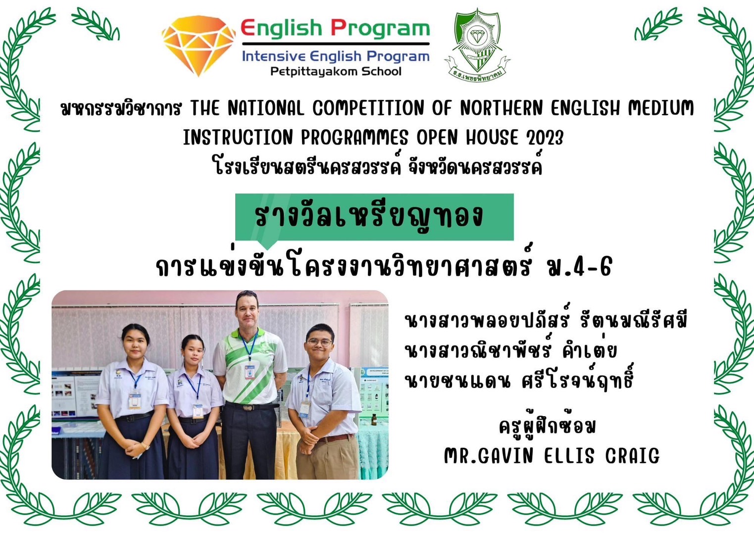 นักเรียนโครงการห้องเรียนพิเศษ English Program/ Intensive English Program เข้าร่วมการแข่งขันมหกรรมวิชาการ Northern English Medium Instruction Programmes Open House 2023 ครั้งที่ 34 ภายใต้แนวคิด “Reimagining English Medium Education: Diversity, Equity, Inclusion and Togetherness” ของศูนย์ส่งเสริมห้องเรียนพิเศษภาษาอังกฤษ ภาคเหนือโรงเรียนที่ดำเนินการจัดการเรียนการสอนตามหลักสูตรกระทรวงศึกษาธิการเป็นภาษาอังกฤษ (English Program / Mini English Program/Gifted/Intensive English Program) ประจำปีการศึกษา 2566 ระหว่างวันที่ 17-18 สิงหาคม 2566 ณ โรงเรียนสตรีนครสวรรค์ จังหวัดนครสวรรค์ เข้าร่วมการแข่งขันทั้งสิ้น 17 รายการ ผลการแข่งขันดังนี้