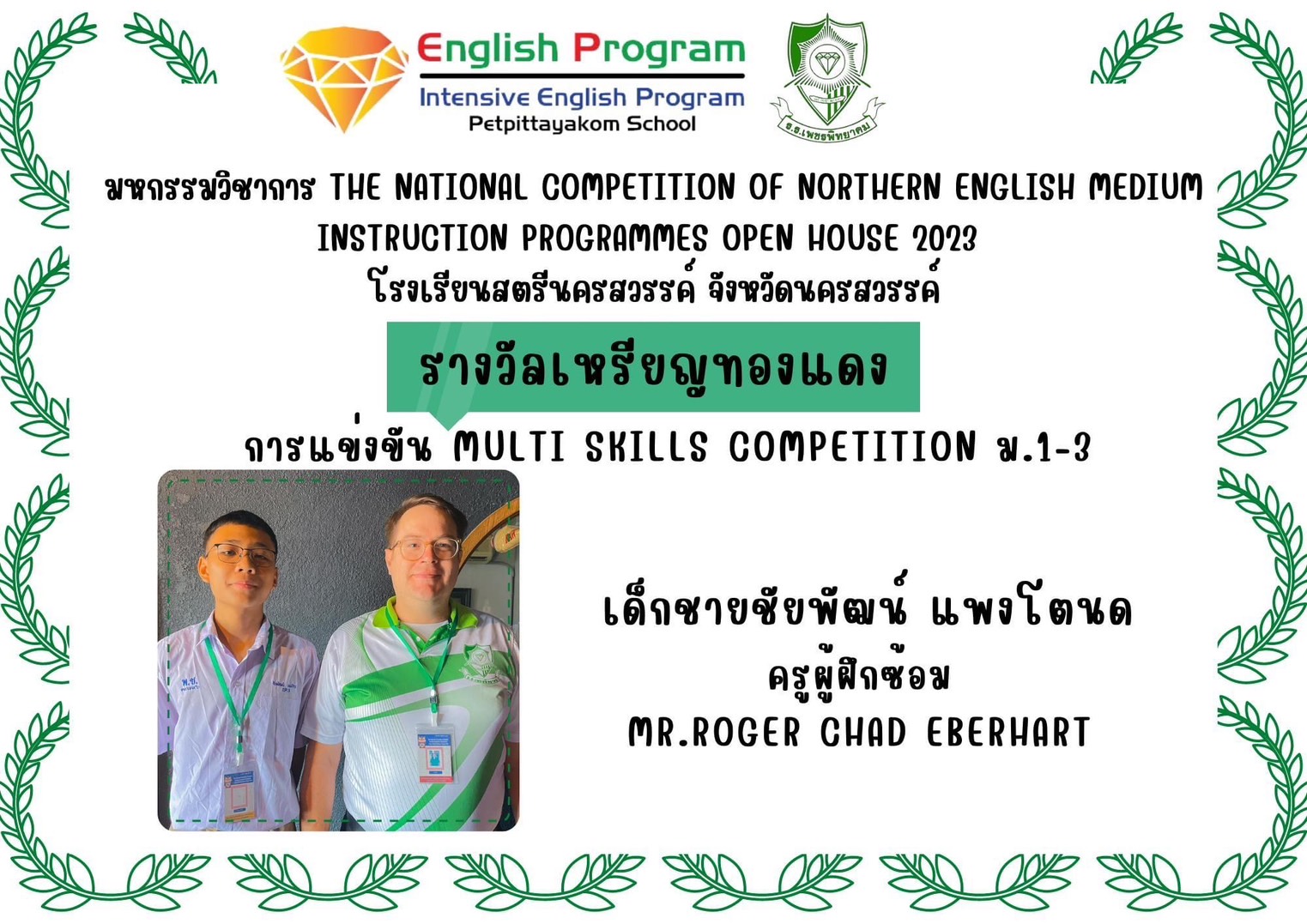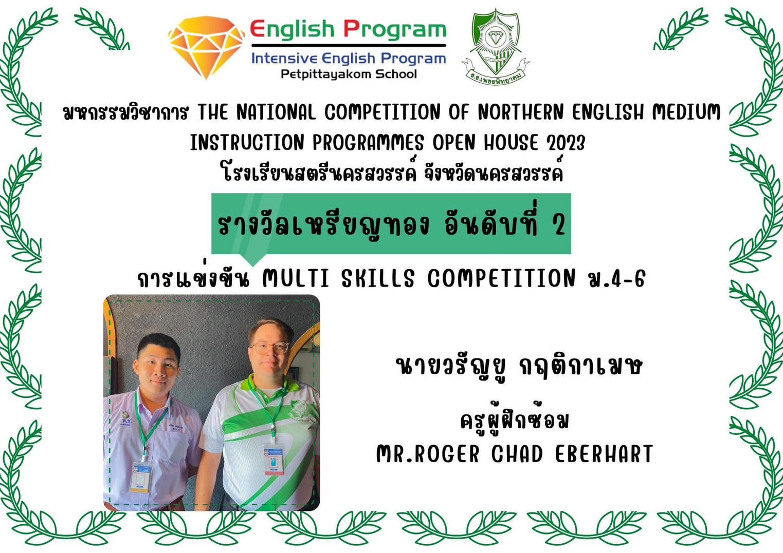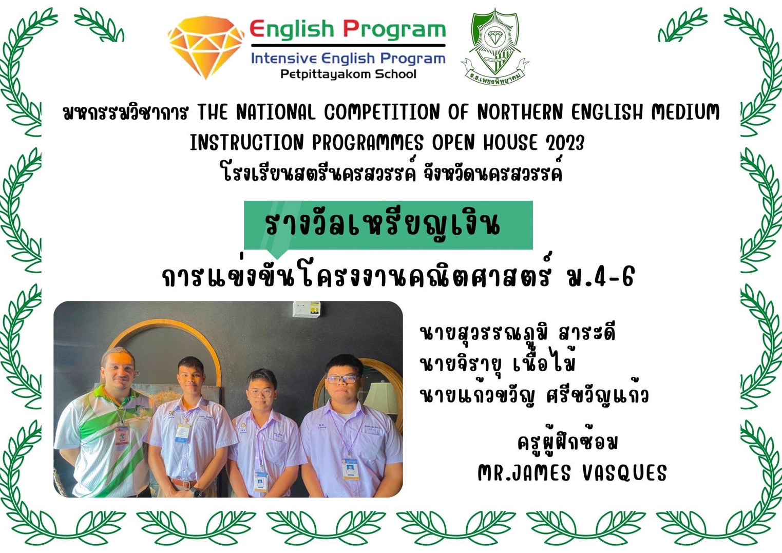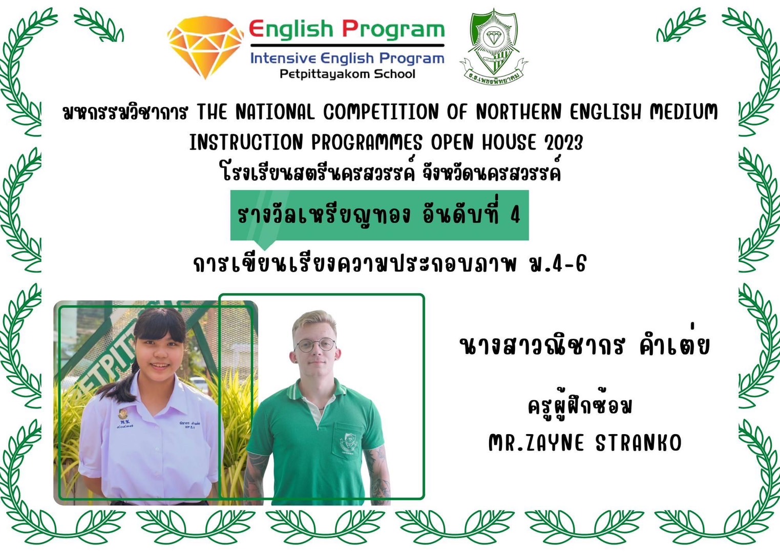 นักเรียนโครงการห้องเรียนพิเศษ English Program/ Intensive English Program เข้าร่วมการแข่งขันมหกรรมวิชาการ Northern English Medium Instruction Programmes Open House 2023 ครั้งที่ 34 ภายใต้แนวคิด “Reimagining English Medium Education: Diversity, Equity, Inclusion and Togetherness” ของศูนย์ส่งเสริมห้องเรียนพิเศษภาษาอังกฤษ ภาคเหนือโรงเรียนที่ดำเนินการจัดการเรียนการสอนตามหลักสูตรกระทรวงศึกษาธิการเป็นภาษาอังกฤษ (English Program / Mini English Program/Gifted/Intensive English Program) ประจำปีการศึกษา 2566 ระหว่างวันที่ 17-18 สิงหาคม 2566 ณ โรงเรียนสตรีนครสวรรค์ จังหวัดนครสวรรค์ เข้าร่วมการแข่งขันทั้งสิ้น 17 รายการ ผลการแข่งขันดังนี้