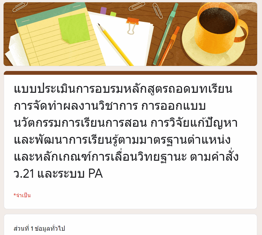แบบประเมินการอบรมหลักสูตรถอดบทเรียนการจัดทำผลงานวิชาการ การออกแบบนวัตกรรมการเรียนการสอน การวิจัยแก้ปัญหาและพัฒนาการเรียนรู้ตามมาตรฐานตำแหน่งและหลักเกณฑ์การเลื่อนวิทยฐานะ ตามคำสั่ง ว.21 และระบบ PA