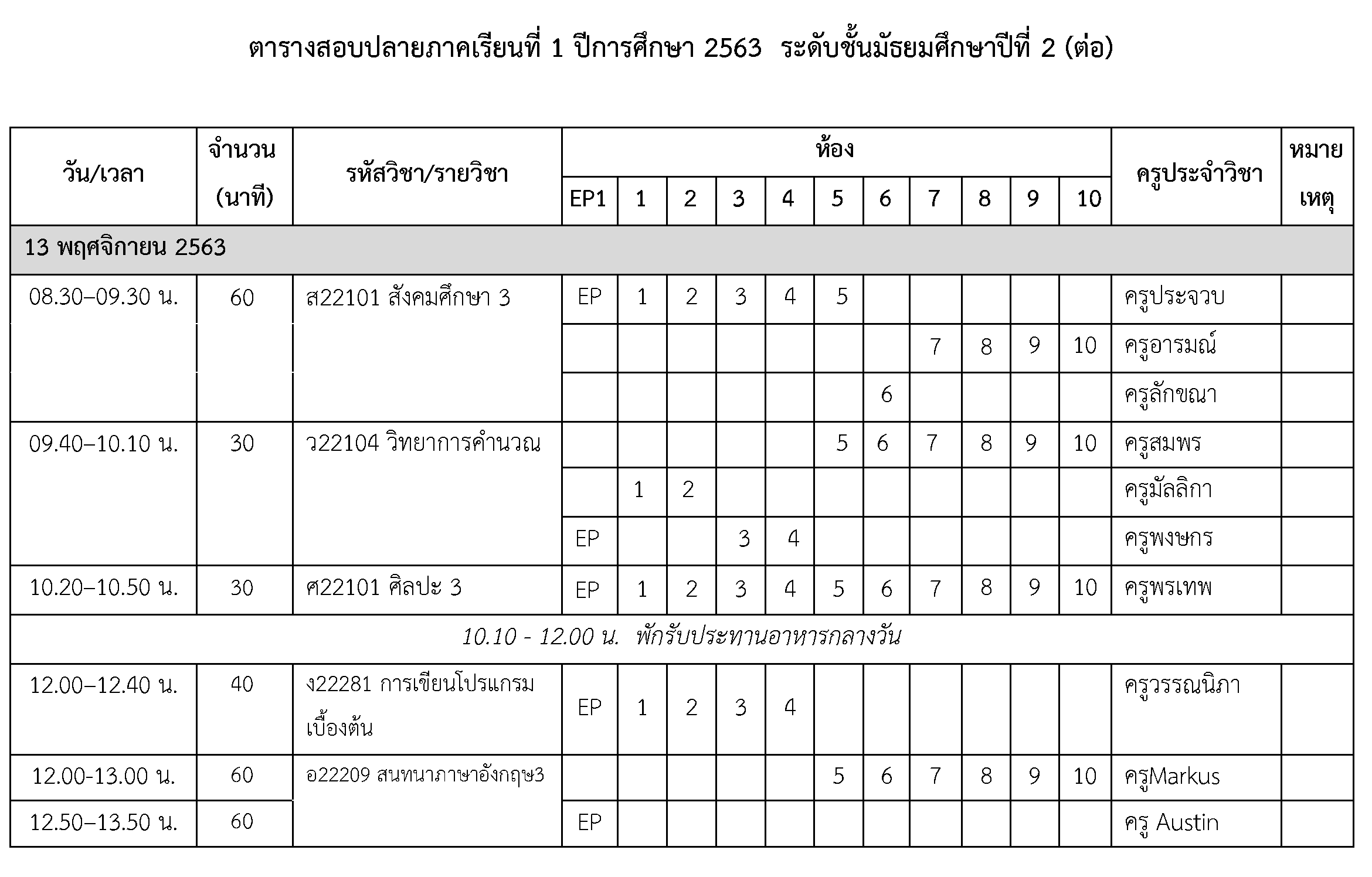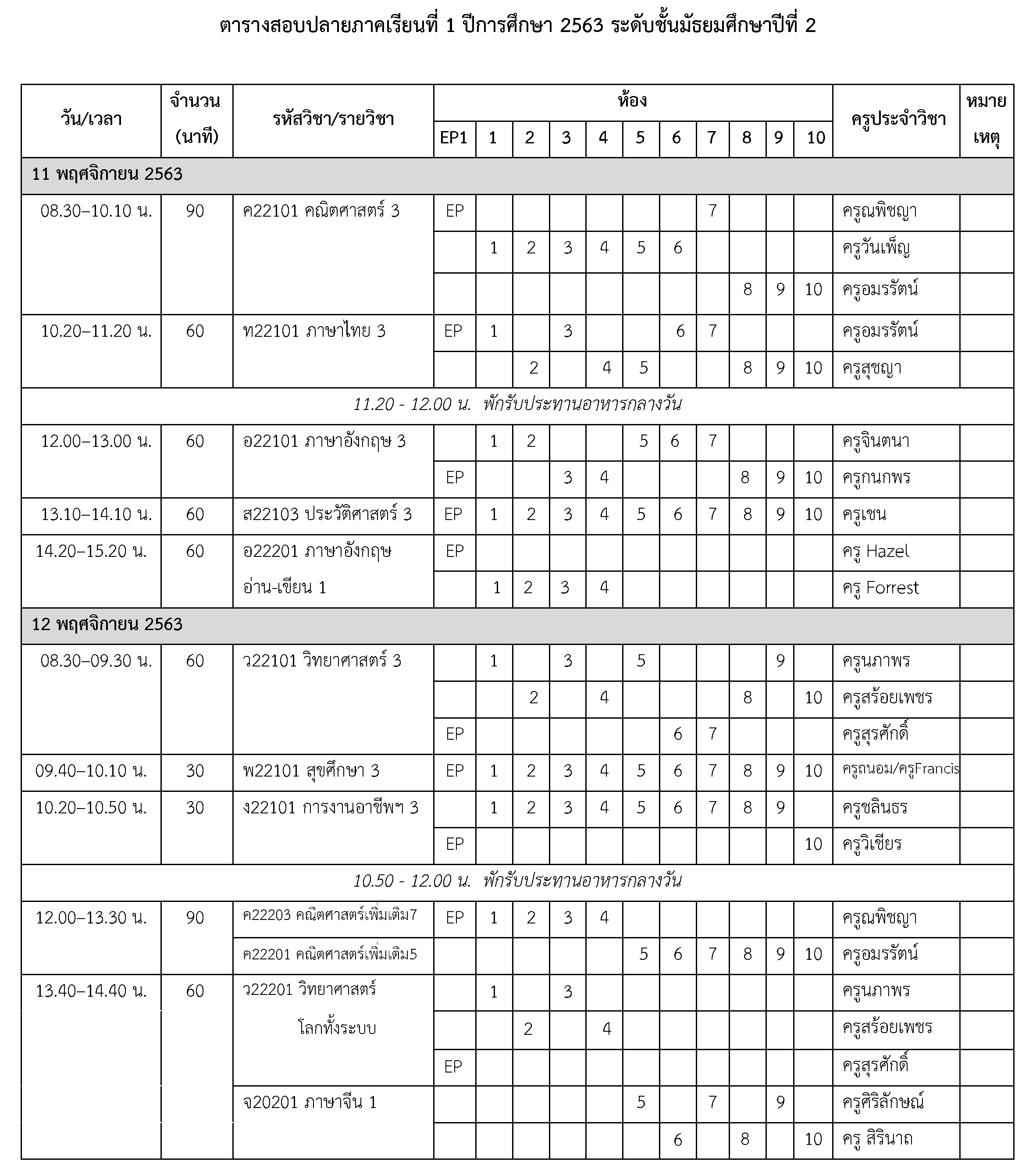 ตารางสอบปลายภาคเรียนที่ 1 ปีการศึกษา 2563 ระดับชั้นมัธยมศึกษาปีที่ 2