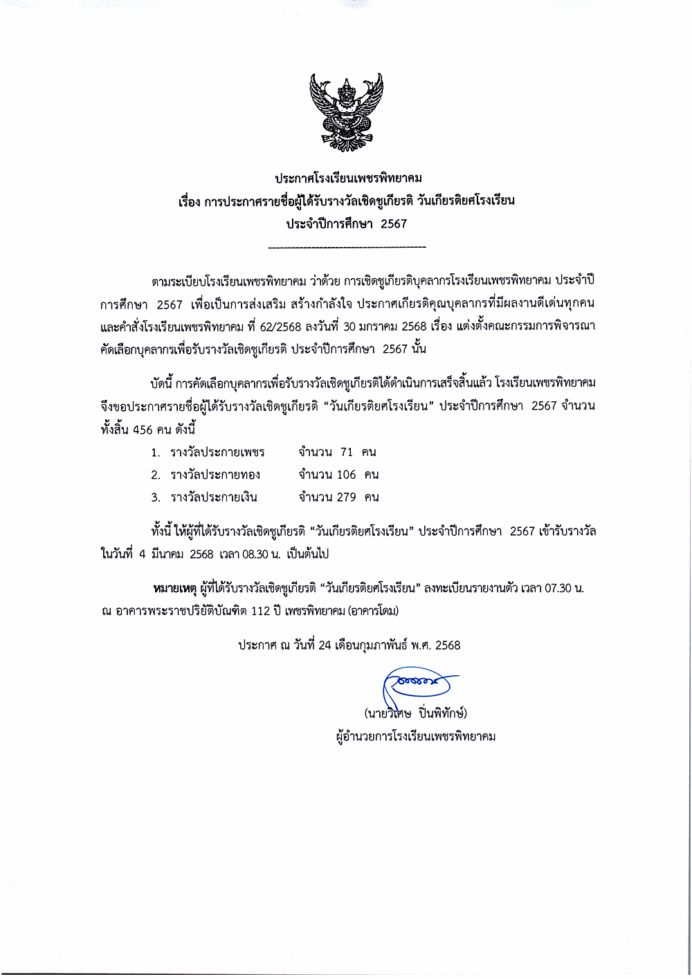ประกาศโรงเรียนเพชรพิทยาคม เรื่อง การประกาศรายชื่อผู้ได้รับรางวัลเชิดชูเกียรติ วันเกียรติยศโรงเรียน ประจำปีการศึกษา 2567