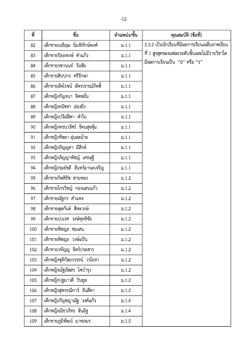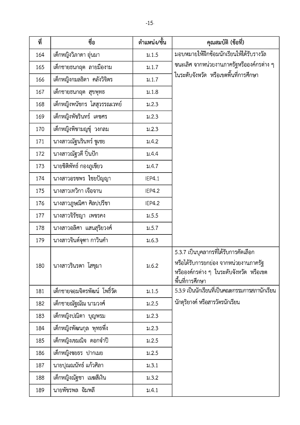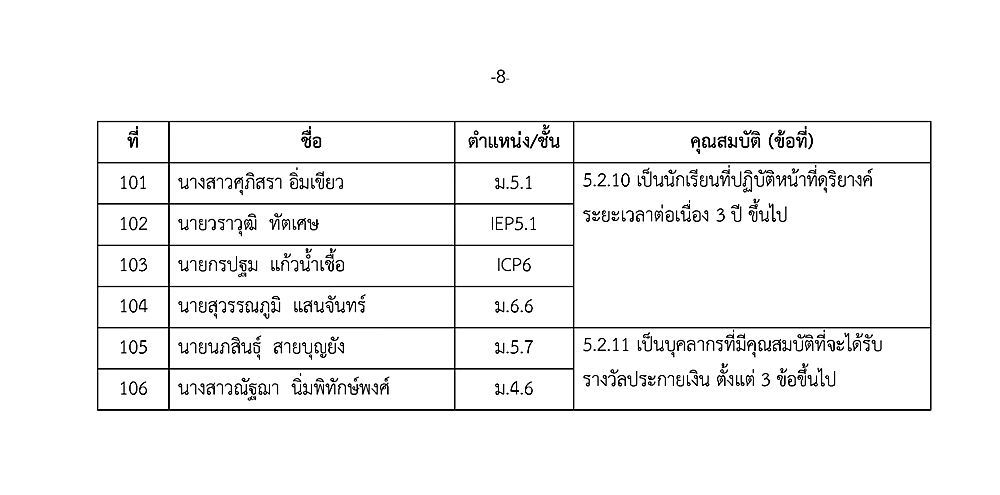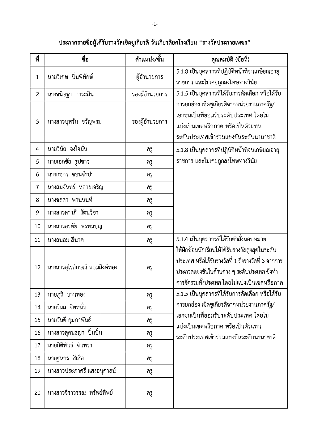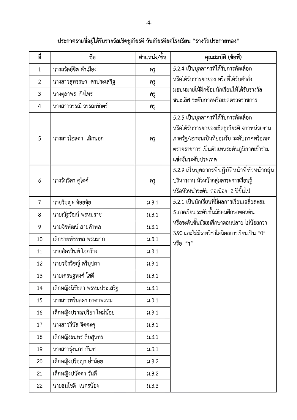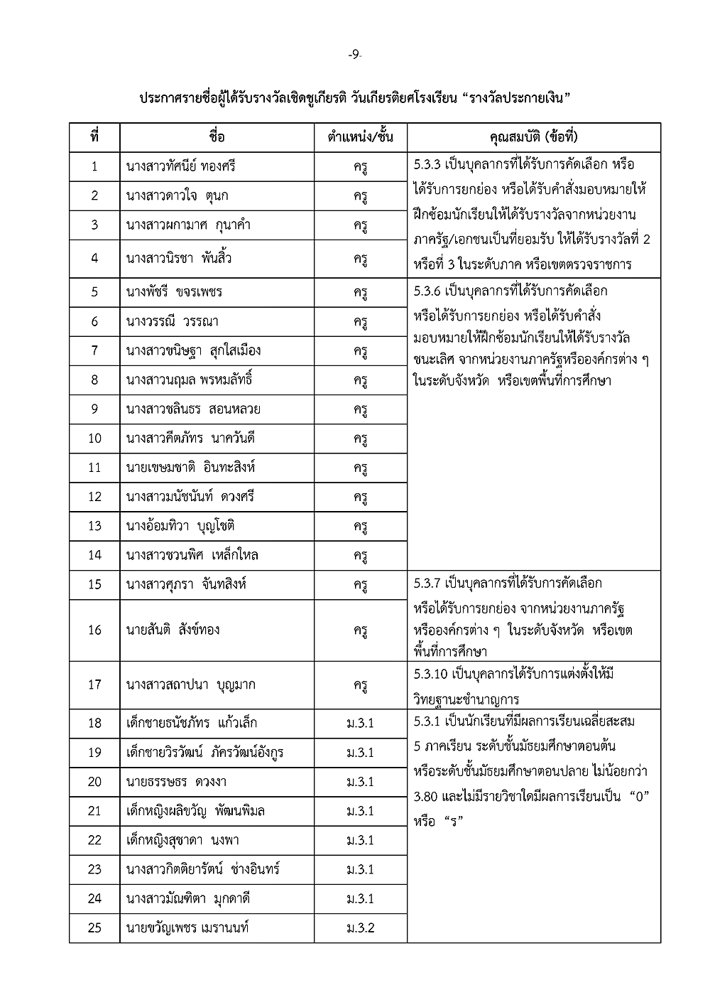 เรื่อง การประกาศรายชื่อผู้ได้รับรางวัลเชิดชูเกียรติ วันเกียรติยศโรงเรียน